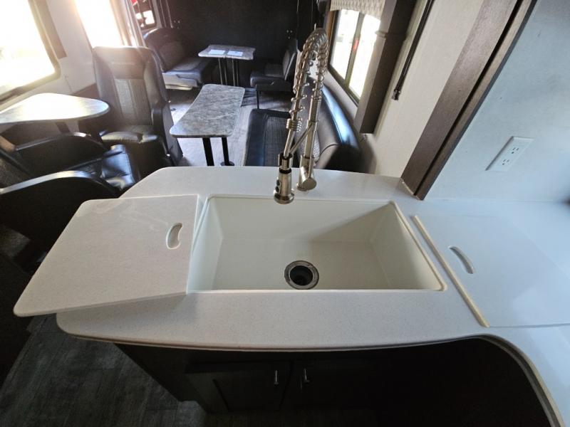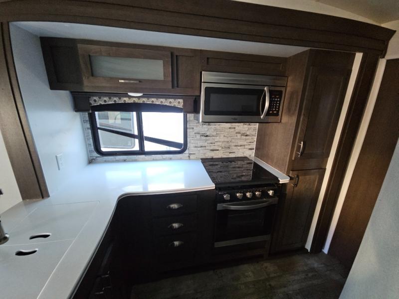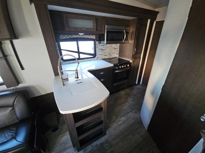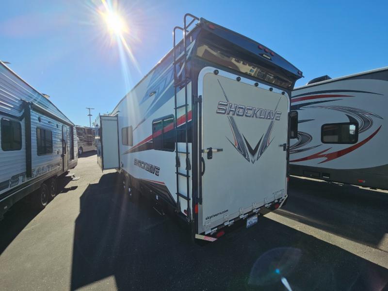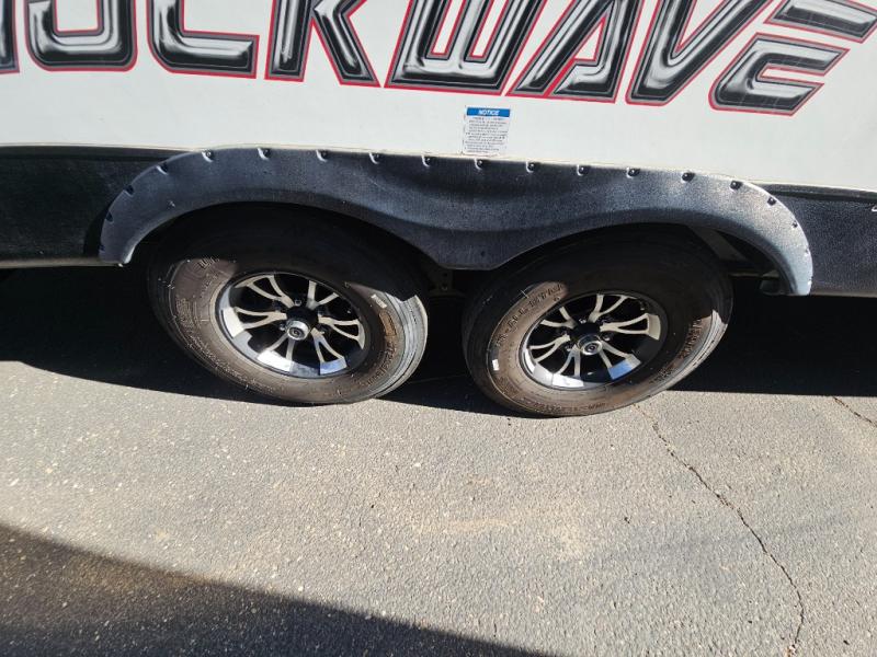 Each Forest River Shockwave DX Series travel trailer toy hauler is ready for anything with a 4.0 Onan generator, a 35 gallon fuel station, a 220 watt solar panel and regulator, plus a heated and enclosed underbelly. You will also find a 102" wide body construction along with a 3,000 lb. radius ramp door with patio cables, a beaver tail floor, and a drive-on wheel well on the door side. The interior is equipped with a full kitchen including a 1.6 cu. ft. stainless steel microwave, a 22" chef's oven with a recessed glass top, and lighted LG solid surface kitchen countertop. Choose your favorite model today!