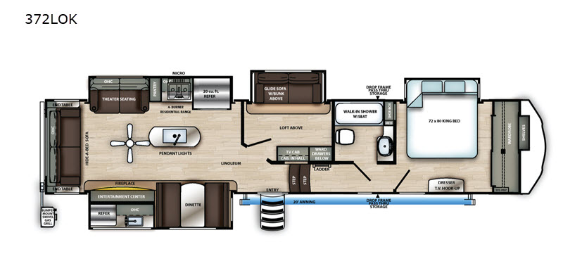 This unique Sierra fifth wheel showcases a middle bunkhouse that includes a glide sofa with a bunk above, storage space, and a loft above this room. Your kids or guests will appreciate having their own space to hang out as well as sleep. Just imagine having your own private bedroom with a large wardrobe, dresser, and king bed slide. You even have the option to add a washer/dryer to this space too. Th walk-in shower with seat in the full bathroom is exceptionally convenient, and you will find the main living area to be wide open thanks to the opposing slides. There is also plenty of seating in this space to eat or relax while enjoying a show and the fireplace. The outdoor person in the family will love the exterior kitchen, the electric awning, and the drop-frame pass-through storage area.