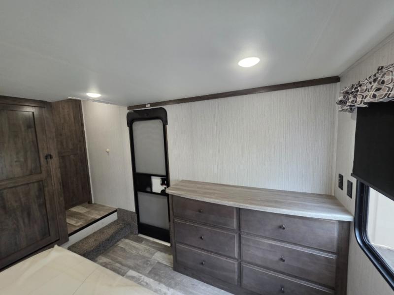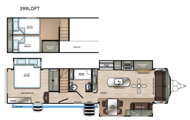It's time to load your clothes, food items and family in your car to head to your favorite destination! Once you have entered either through the patio doors or the second entry into the rear bedroom, you can open the windows for some fresh air or start the fireplace. The kids will love the loft that includes dual bunk mats, a large wardrobe, plus a dresser for all their clothes. You can began making lunch or dinner depending on your arrival time. If you want to watch the 50" LED HDTV while sitting on the theater seats with LED lighting or on the hide-a-bed sofa before bedtime, you have that option. The full bathroom is conveniently located for everyone and includes a shower with a seat. Don't forget about the electric awning that will allow you some protection from the elements when you want to relax outside.