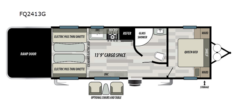 Are you looking for a toy hauler that can haul your dirt bikes but also give you comfortable features that you can enjoy while you're away from home? Look no further than this unit that features 13' 9" of cargo space and your own private bedroom with a queen bed and wardrobes for your clothes. This model is the same layout as model FQ2413 but includes a fiberglass exterior. Your riding buddies can crash on the electric bed or convert the electric pass through dinette for more sleeping space. You can prepare dinner just like you do at home on the three burner range or make something quick in the microwave oven so you can get back outside to ride some more!