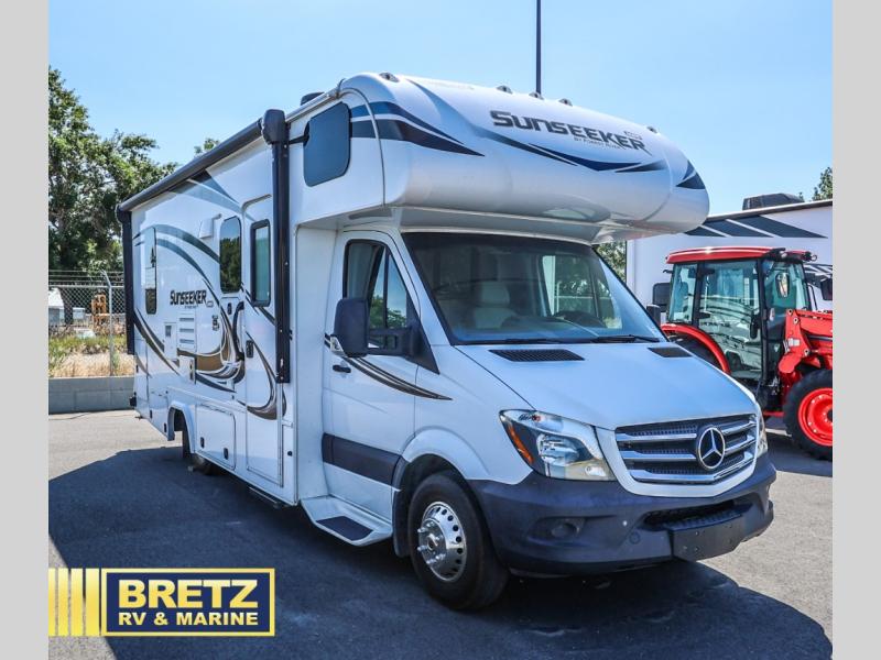 Start seeing the country in comfort with this Sunseeker MBS Class C diesel motorhome! You will be able to sleep in your own RV queen bed and clean up in your own full bathroom. Whether you like to play board games or read a book, the booth dinette will be the spot you enjoy, and the removable table between the front cab seats will provide a second location to sit down with a drink.