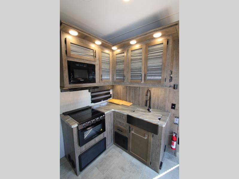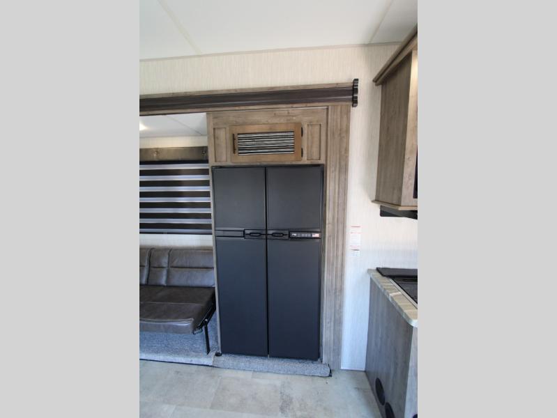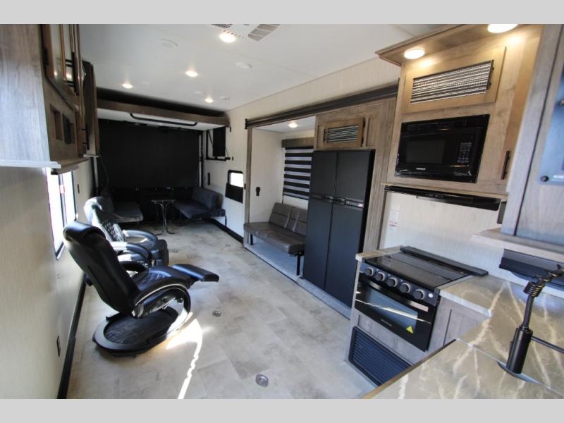 Load up your off-road toys to enjoy a weekend away with everything you need to stay fed, sleep comfortably, and stay clean for the next trail ride with this Vengeance Rogue toy hauler! The private master suite offers plenty of storage, a king bed slide for more sleeping and floor space, and a private entrance into the full bathroom with a garden shower and linen storage. The cargo area becomes your living/kitchen area once unloaded, and the single slide that contains the sofa and residential refrigerator gives you more floor space to stretch out. The kitchen offers everything you need to make meals, and at night, the kids or your guests will appreciate having the quick-set queen bed system to sleep on.