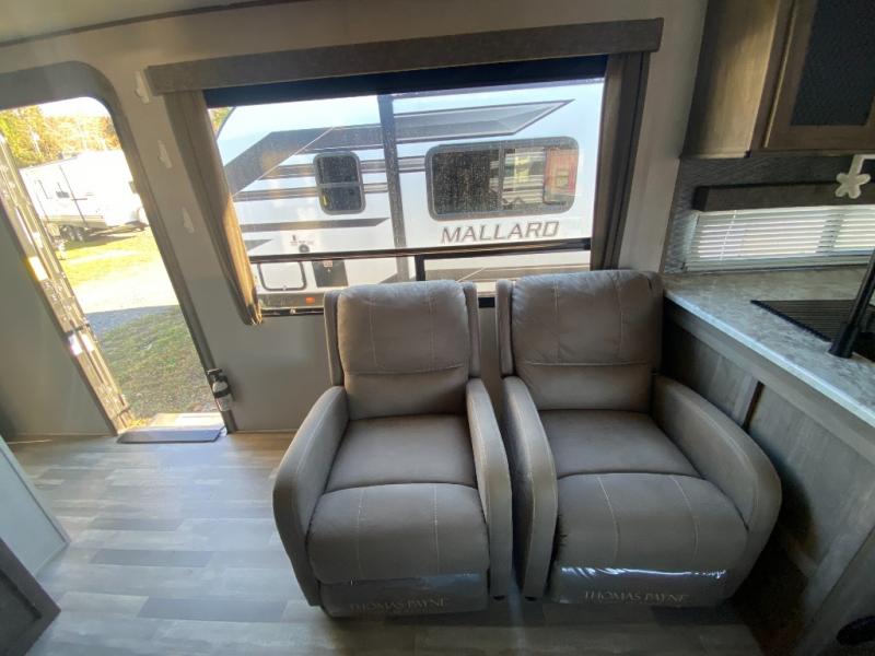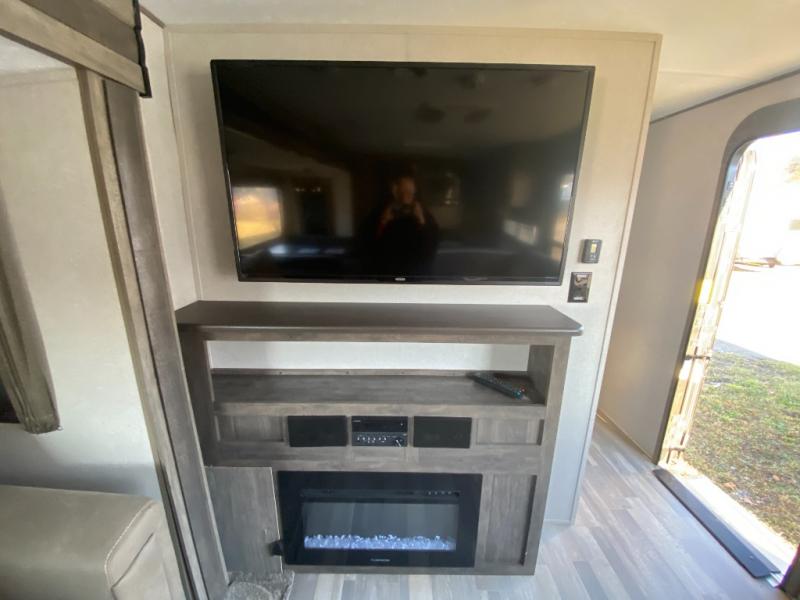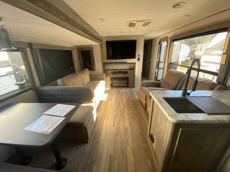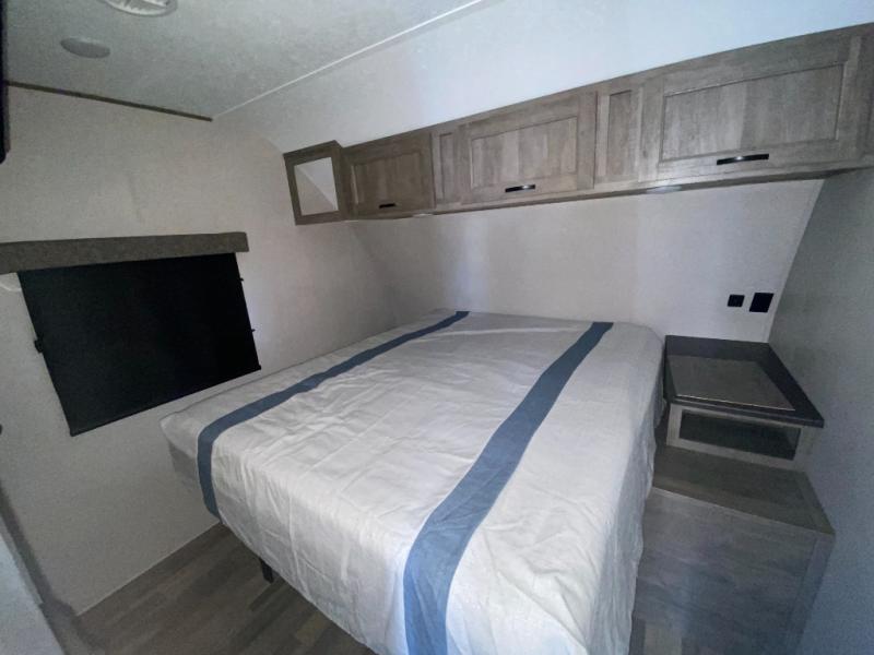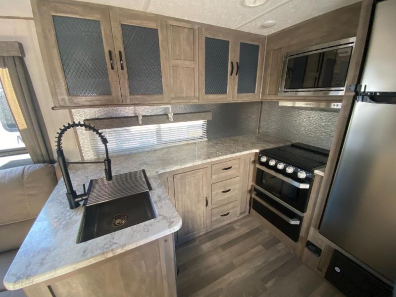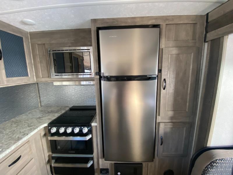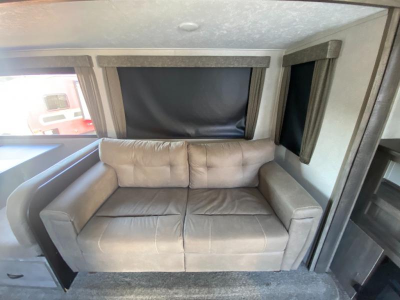 The cook will love the layout of this trailer with the kitchen appliances in the rear with lots of counter space along the side wall allowing them to prepare and serve meals for everyone. They might even like to make a few meals using the outside kitchen. You can offer lots of seating inside with a sleeper sofa and booth dinette slide out, plus the two recliners. And the 18' awning with LED light gives you an outdoor living area, all you need to do is grab your camping chairs from the exterior large pass through compartment. When you are ready to call it a night, you can get cleaned up in the walk-in shower in the full bathroom, grab your pajamas from the wardrobes or overhead cabinets, and fall asleep on the walk-around queen bed.
