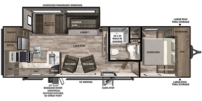The cook will love the layout of this trailer with the kitchen appliances in the rear with lots of counter space along the side wall allowing them to prepare and serve meals for everyone. They might even like to make a few meals using the outside kitchen. You can offer lots of seating inside with a sleeper sofa and booth dinette slide out, plus the two recliners. And the 18' awning with LED light gives you an outdoor living area, all you need to do is grab your camping chairs from the exterior large pass through compartment. When you are ready to call it a night, you can get cleaned up in the walk-in shower in the full bathroom, grab your pajamas from the wardrobes or overhead cabinets, and fall asleep on the walk-around queen bed.