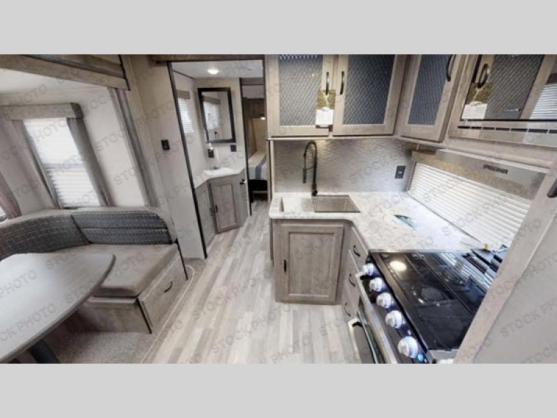 This travel trailer has all the amenities to make your camping trip convenient and fun at the same time. The kids will love being able to invite their friends with a private bunkhouse that sleeps five with two oversized bunks, and an upper bunk above two Vibe Cubes that they can relax on with a book or their tablet. Open up the main area slide out which houses the U-shaped dinette and sleeper sofa to make the living area feel just like home. You will also find a recessed 50" TV above a storage cubby, and an L-shaped kitchen. The walk-through bath offers a walk-in shower and lots of counter space to get ready for hiking, shopping, or before bedtime. And the queen size bed in the front bedroom gives you an oasis from it all. Don't forget about all the outside features such as the 20' awning, the outside kitchen, the large pass through storage, and the TV prep.