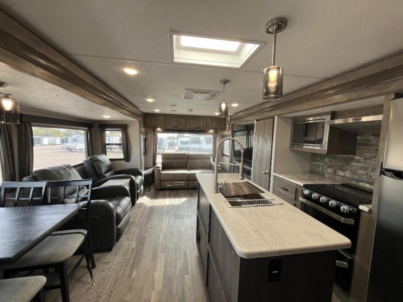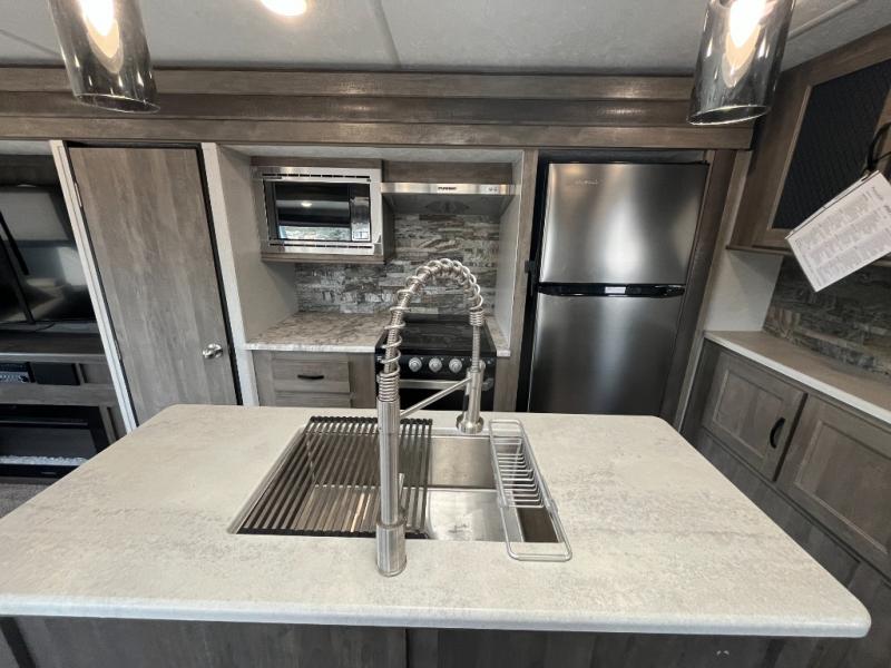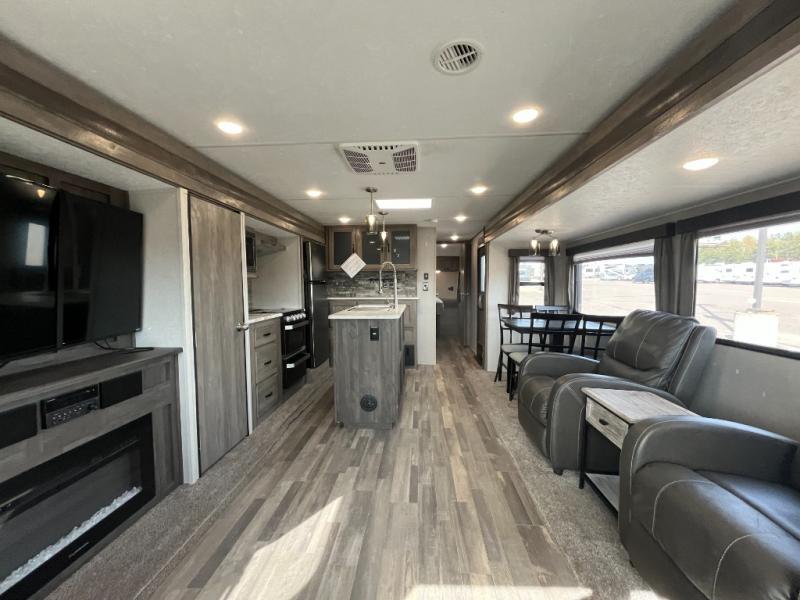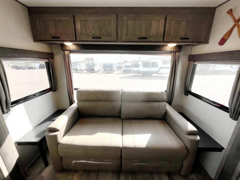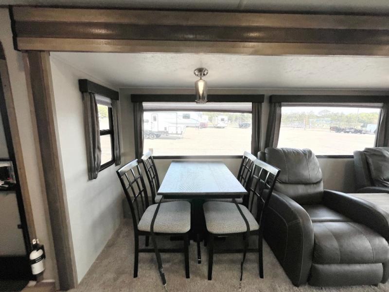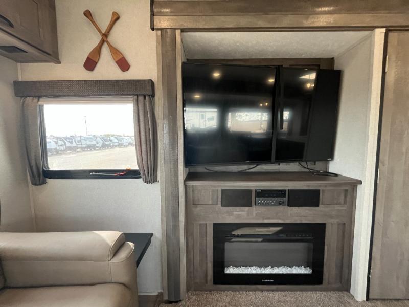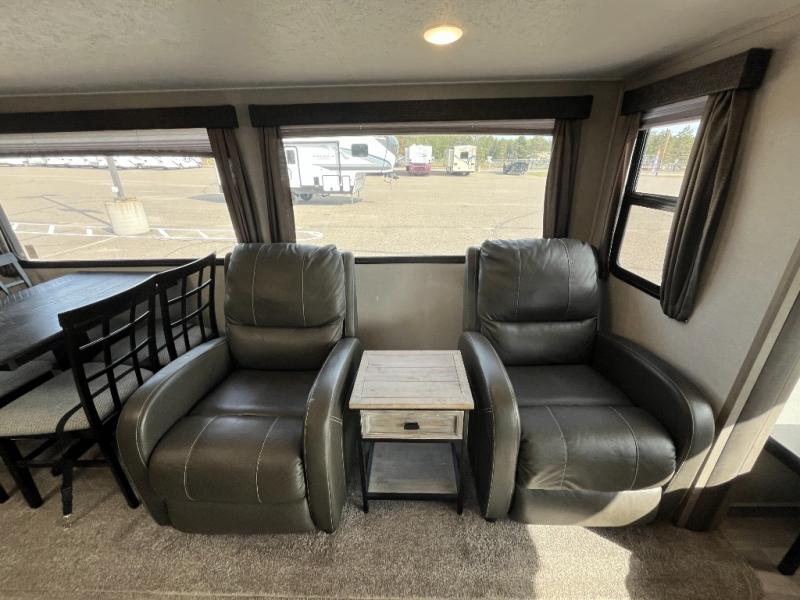 You might be seeing double in this trailer from the two recliners, and the dual opposing slides in the main living area, to the two awnings outside! Also outdoors you will find a large pass through storage for fishing poles, camping chairs, and such, plus Sure-Step entry steps giving you more stability as you enter and exit. Once inside you will find a spacious kitchen and living area offering a center island and hutch, plus all the appliances needed to stay fed for a while. You can rest and relax in one of the recliners or on the sleeper sofa with end tables, and dine at the booth dinette. And don't forget about the sky light, LCD TV and fireplace, plus the full bathroom with a walk-in shower, and the private bedroom with a queen bed and more!.