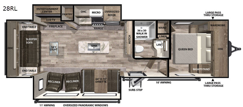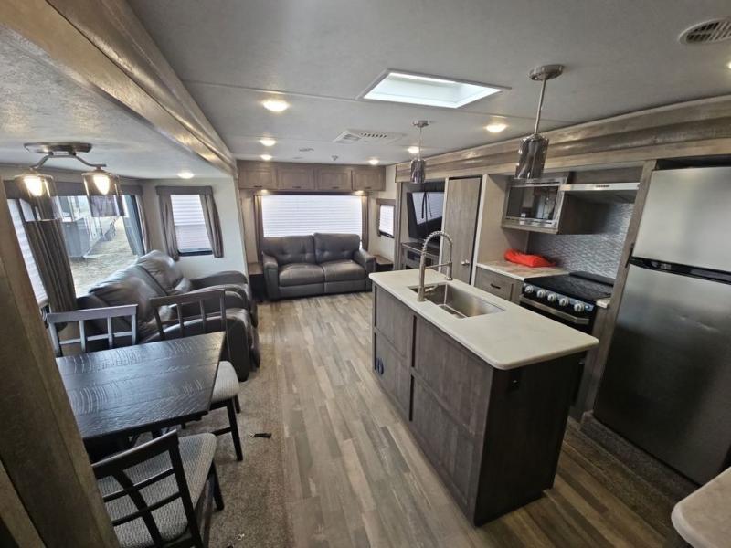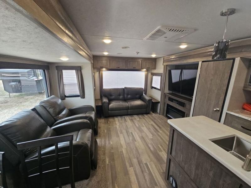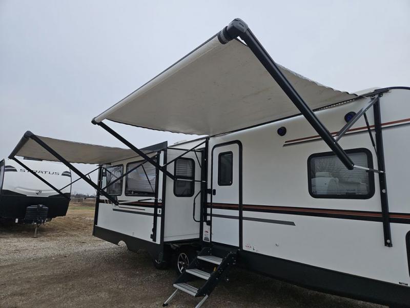 You might be seeing double in this trailer from the two recliners, and the dual opposing slides in the main living area, to the two awnings outside! Also outdoors you will find a large pass through storage for fishing poles, camping chairs, and such, plus Sure-Step entry steps giving you more stability as you enter and exit. Once inside you will find a spacious kitchen and living area offering a center island and hutch, plus all the appliances needed to stay fed for a while. You can rest and relax in one of the recliners or on the sleeper sofa with end tables, and dine at the booth dinette. And don't forget about the sky light, LCD TV and fireplace, plus the full bathroom with a walk-in shower, and the private bedroom with a queen bed and more!.