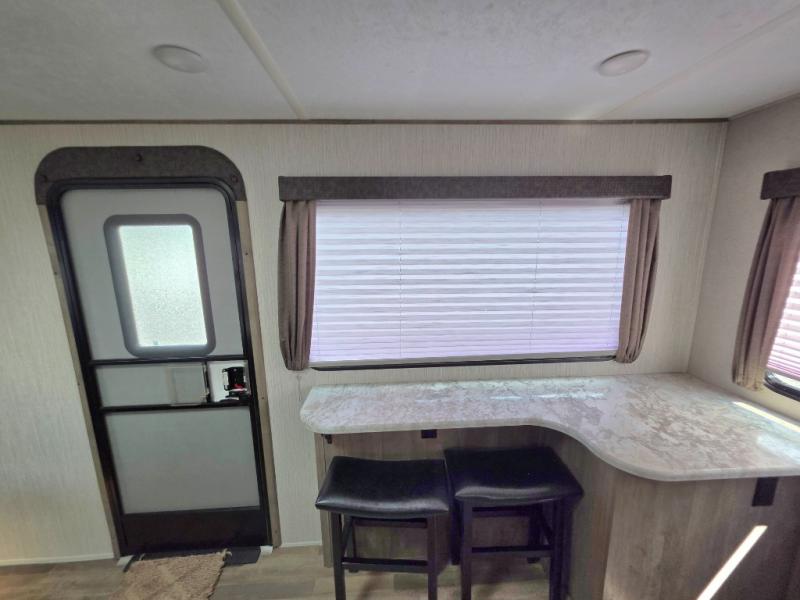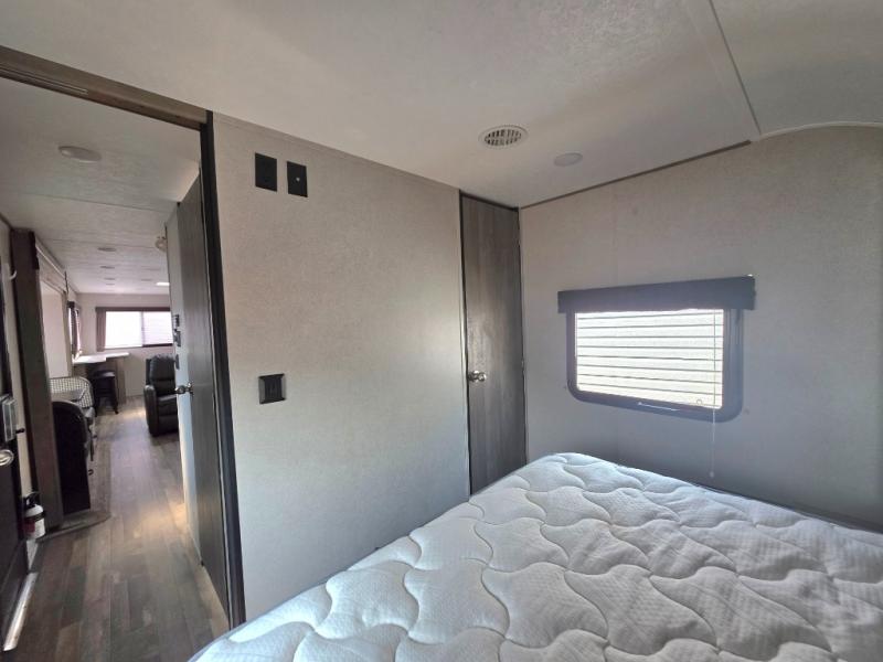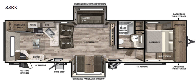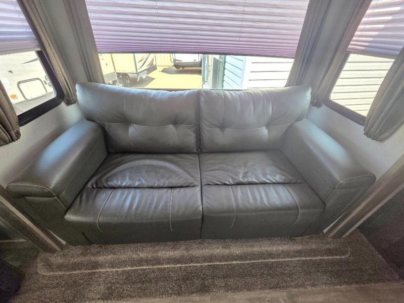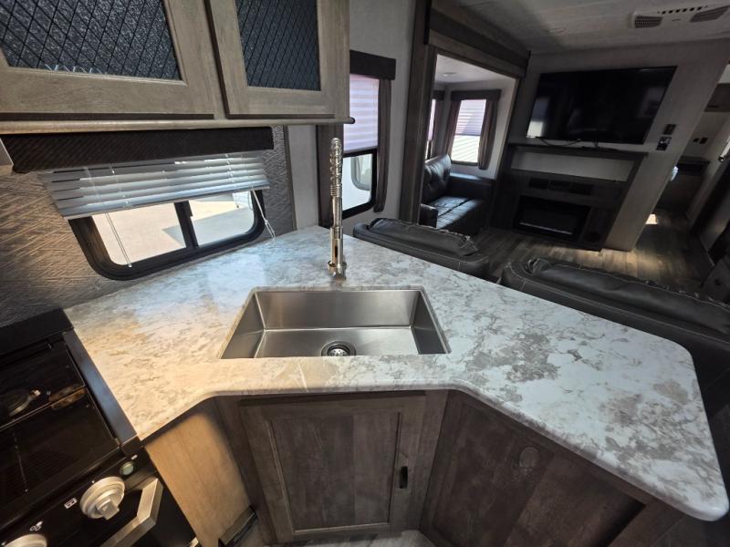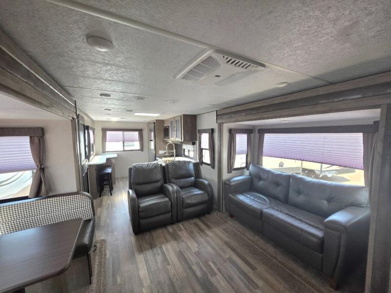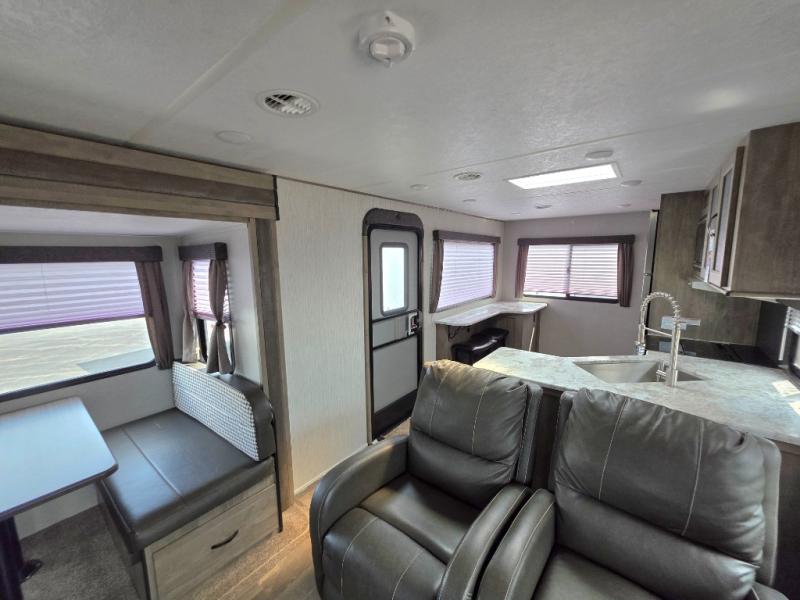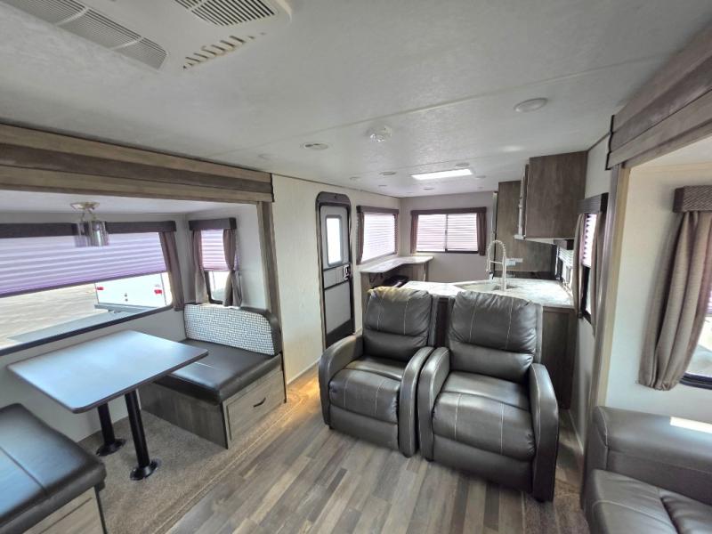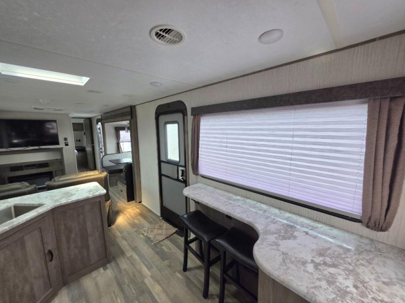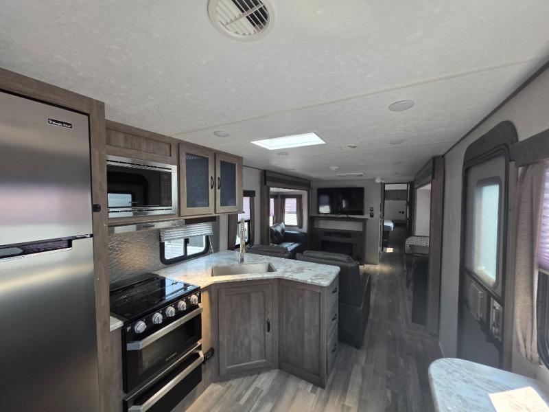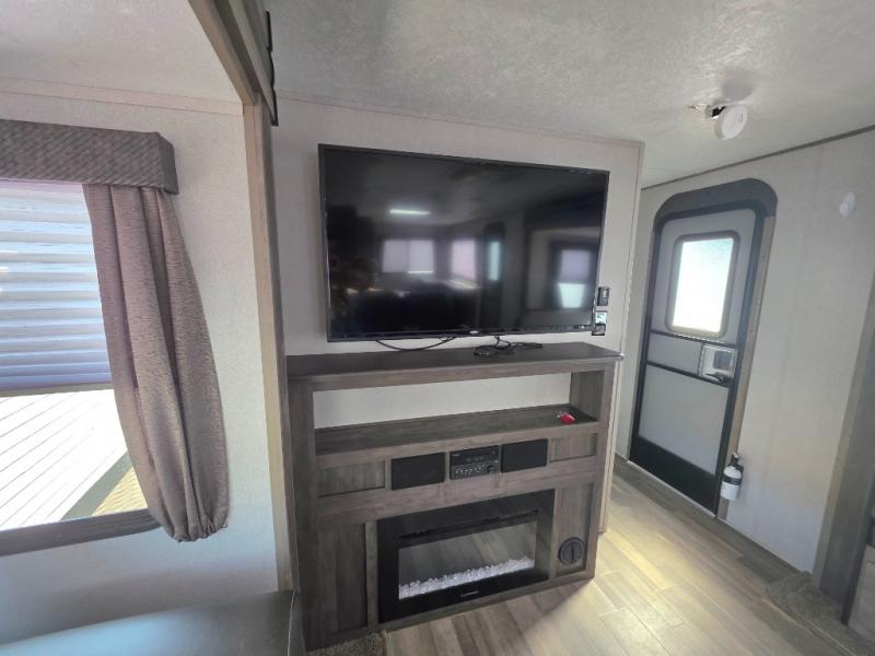 If you like your rooms separated, this trailer has you covered! From the rear kitchen with a window to enjoy the scenery, and a buffet to serve meals from to having dual entry for easy access to both ends of the trailer, this model is perfect! The separate living area provides dual opposing slides with oversized panoramic windows, a sleeper sofa and a booth dinette, plus two recliners are near by. You can enjoy the fireplace as well. The full bathroom offers a walk-in shower and everything you need to stay clean and refreshed for what's next on the agenda. And the front bedroom gives you a queen bed to quickly fall asleep. And don't forget about the exterior pass through storage, the outside kitchen and the two awnings.