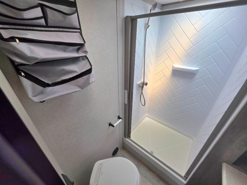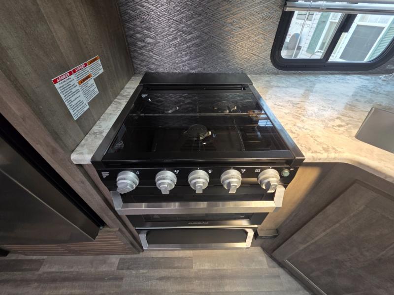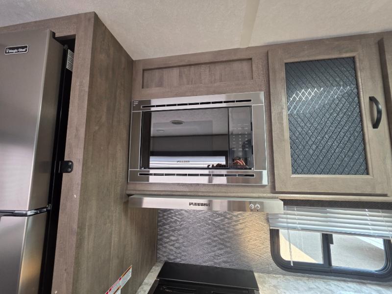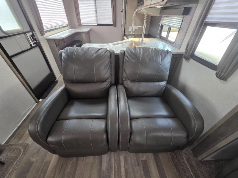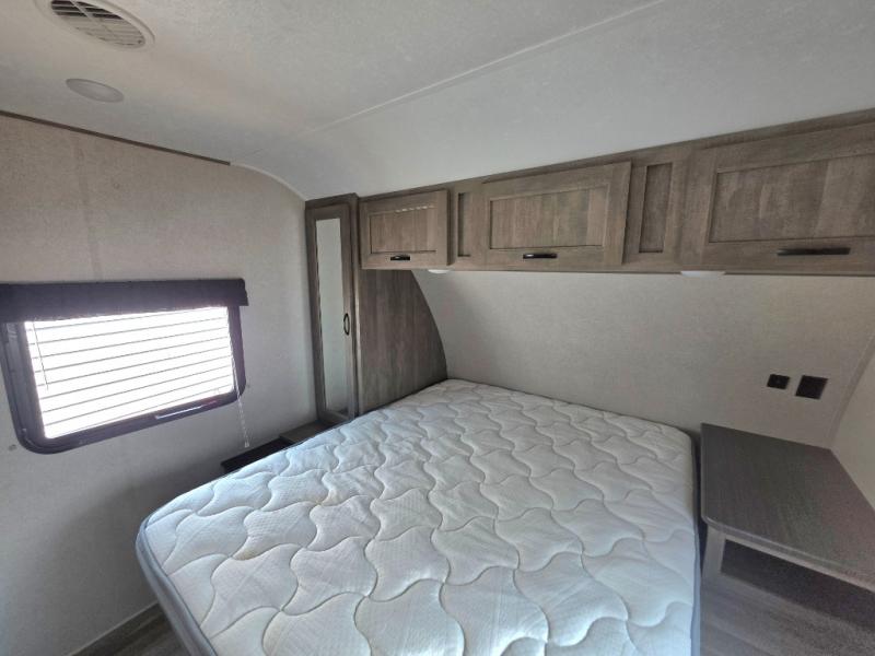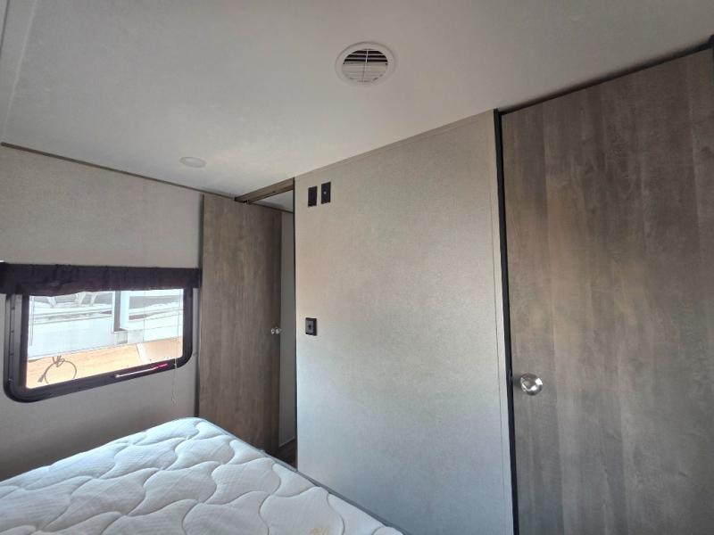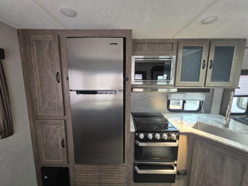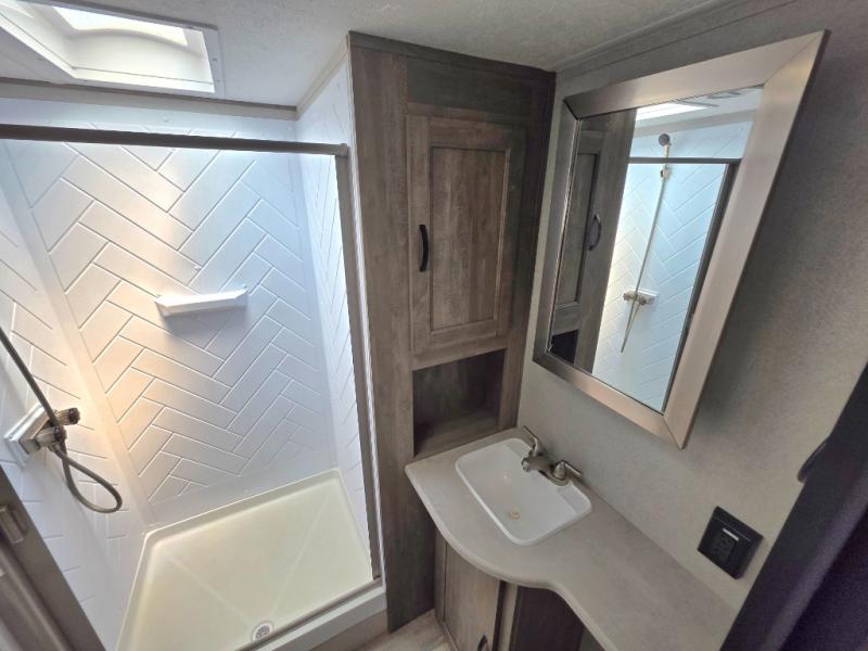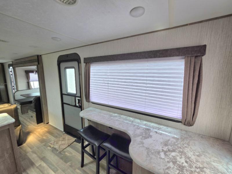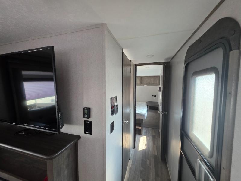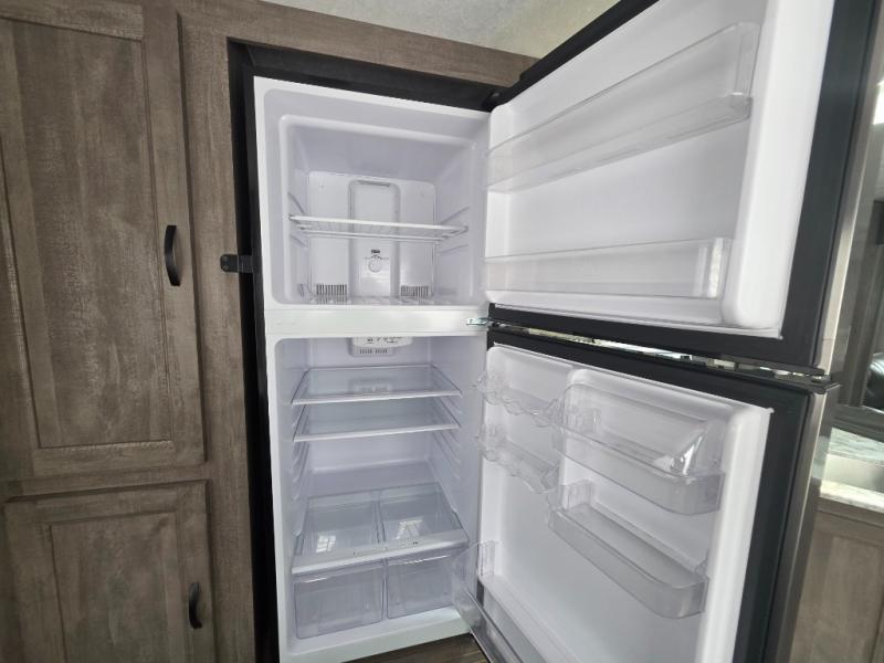 If you like your rooms separated, this trailer has you covered! From the rear kitchen with a window to enjoy the scenery, and a buffet to serve meals from to having dual entry for easy access to both ends of the trailer, this model is perfect! The separate living area provides dual opposing slides with oversized panoramic windows, a sleeper sofa and a booth dinette, plus two recliners are near by. You can enjoy the fireplace as well. The full bathroom offers a walk-in shower and everything you need to stay clean and refreshed for what's next on the agenda. And the front bedroom gives you a queen bed to quickly fall asleep. And don't forget about the exterior pass through storage, the outside kitchen and the two awnings.