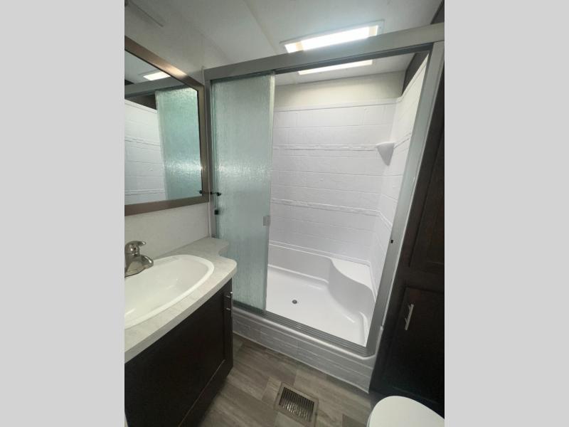 Double Slide Wildwood DLX Destination Trailer, Rear King Bed/Nightstand Slide, TV Prep, Wardrobe, Linen, Neo-Angle Shower, Toilet, Lav., Med. Cab., Pantry, Double Kitchen Sink, 3-Burner Range, Microwave, Refrigerator, Ent. Center, 2-Lounge Chairs, Dinette/Sofa Slide, Overhead Cabinets Throughout, Patio Door, 21' Awning & Much More. Available Options May Include Neo-Angle Tub.