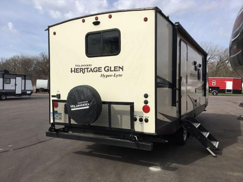 With each Wildwood Heritage Glen Hyper-Lyte travel trailer by Forest River you will appreciate the wide stance axle system for stability, the power tongue jack with LED docking light to easily set up during the day or night, and Solid-Step entry steps plus the XL Lend-a-Hand entry grab handle to the main entrance. The XL Max-Tint panoramic window(s) in the main slide bring the outside inside, plus the yacht trim ceiling finishes, the Herringbone Designer's Choice Shaw flooring and the Hudson Wood agreeable grain cabinetry offer a stylish and beautiful interior to enjoy for years. Take a Hyper-Lyte home today!