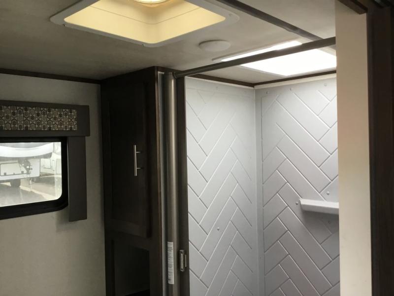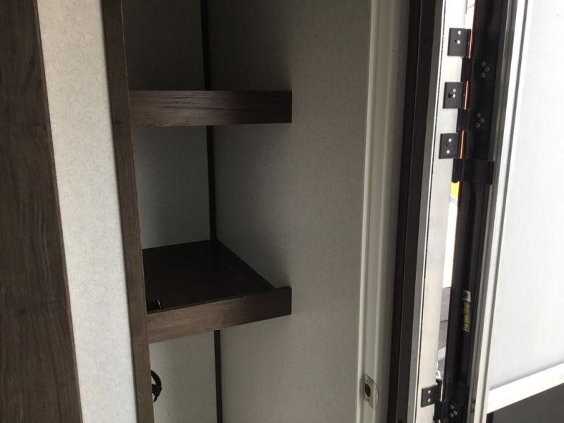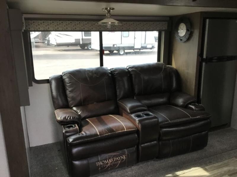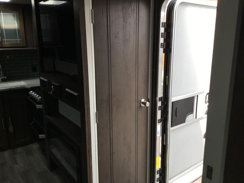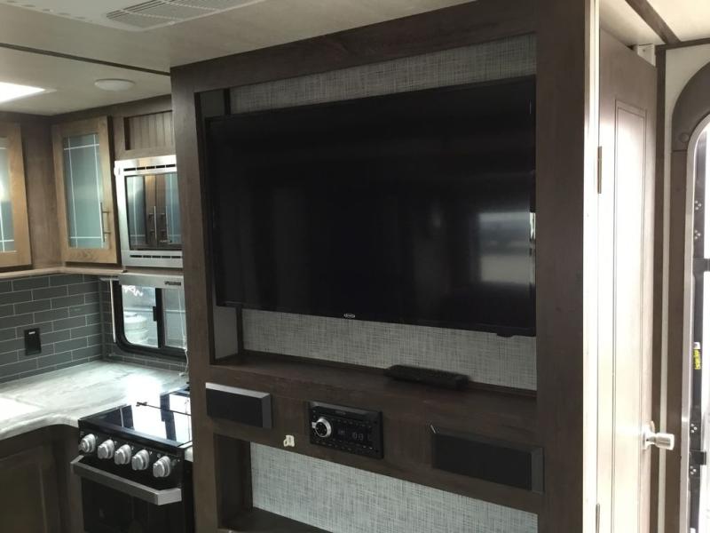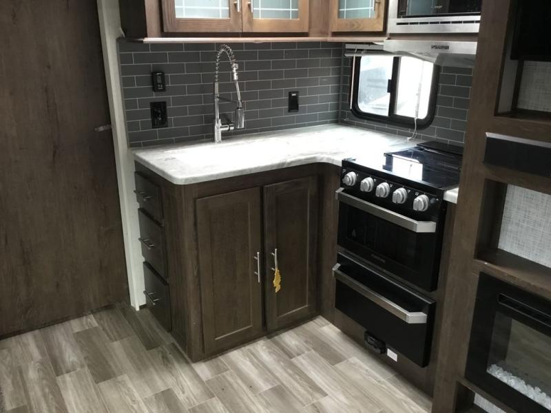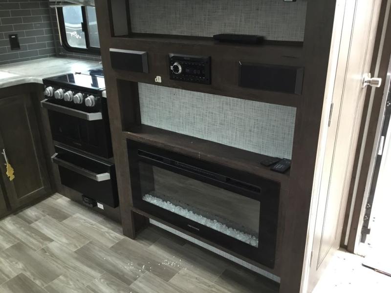 If you are in search of comfort and style when camping, you have found it! Imagine relaxing on the tri-fold chaise lounge dinette and watching the 32" LED TV while staying cozy from the fireplace. You might decide to cook a meal in the kitchen with full amenities including a residential refrigerator and walk-in pantry before getting cleaned up for bedtime. The rear bath offers a walk-in shower with a skylight for more natural lighting, linen storage, a wardrobe and everything else you need to stay refreshed and clean without having to use the public facilities. The front bedroom offers a space savings door, a queen bed and dual wardrobes with mirrors. You will also find a Texas-sized pass-through compartment outside for the outdoor gear such as camping chairs, charcoal, and such.