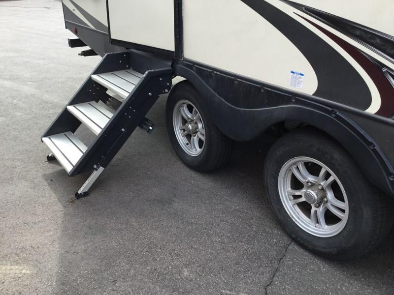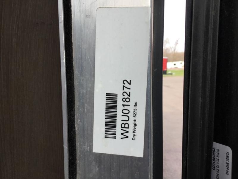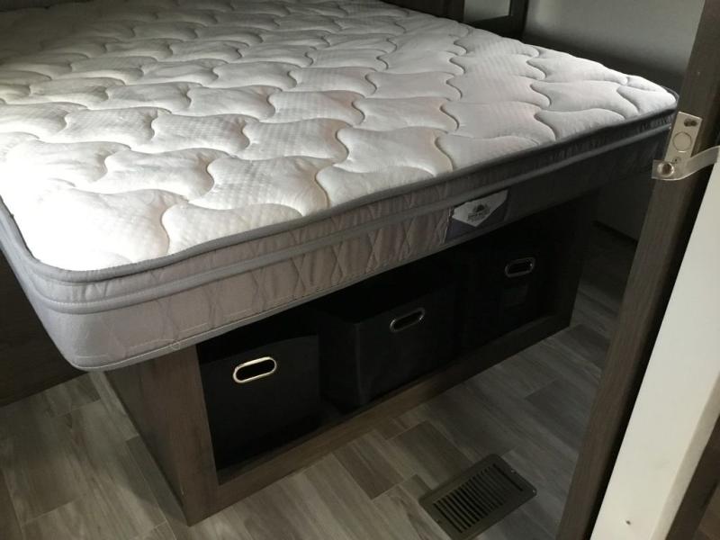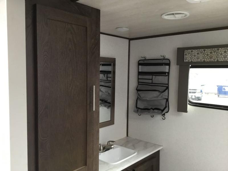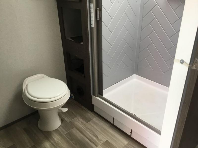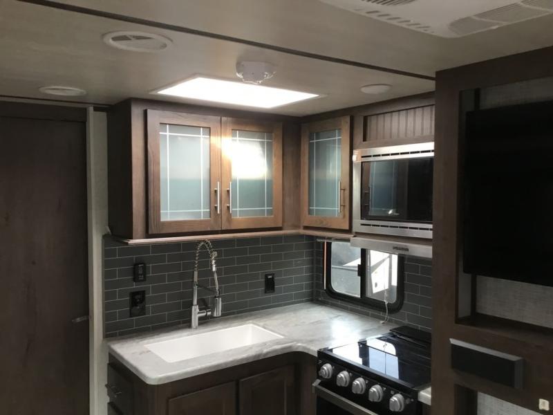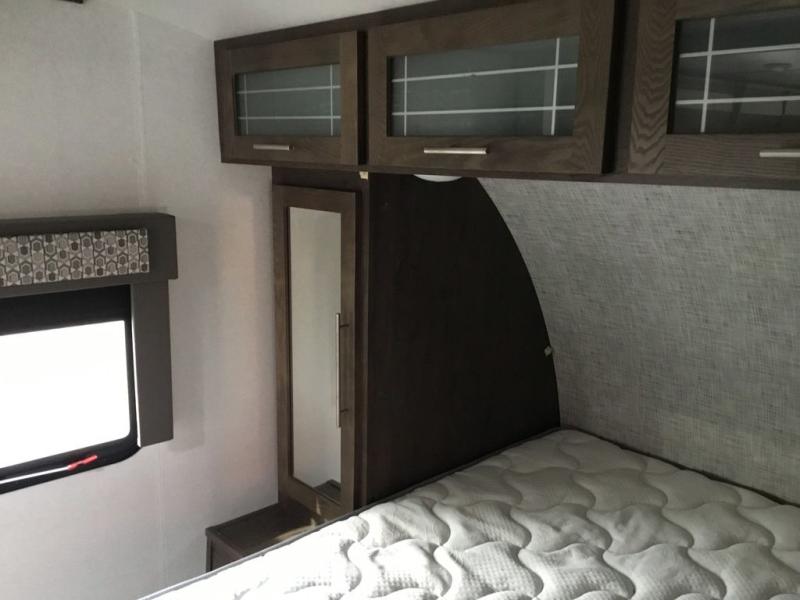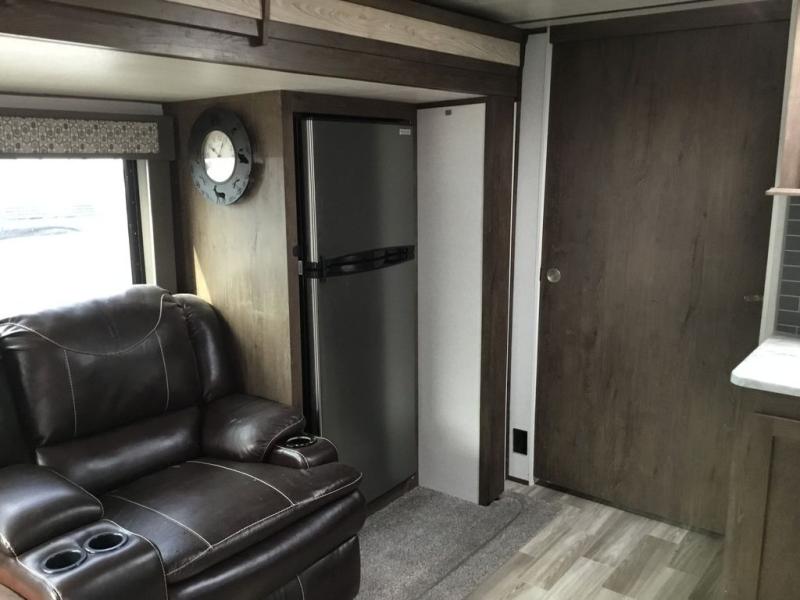 If you are in search of comfort and style when camping, you have found it! Imagine relaxing on the tri-fold chaise lounge dinette and watching the 32" LED TV while staying cozy from the fireplace. You might decide to cook a meal in the kitchen with full amenities including a residential refrigerator and walk-in pantry before getting cleaned up for bedtime. The rear bath offers a walk-in shower with a skylight for more natural lighting, linen storage, a wardrobe and everything else you need to stay refreshed and clean without having to use the public facilities. The front bedroom offers a space savings door, a queen bed and dual wardrobes with mirrors. You will also find a Texas-sized pass-through compartment outside for the outdoor gear such as camping chairs, charcoal, and such.
