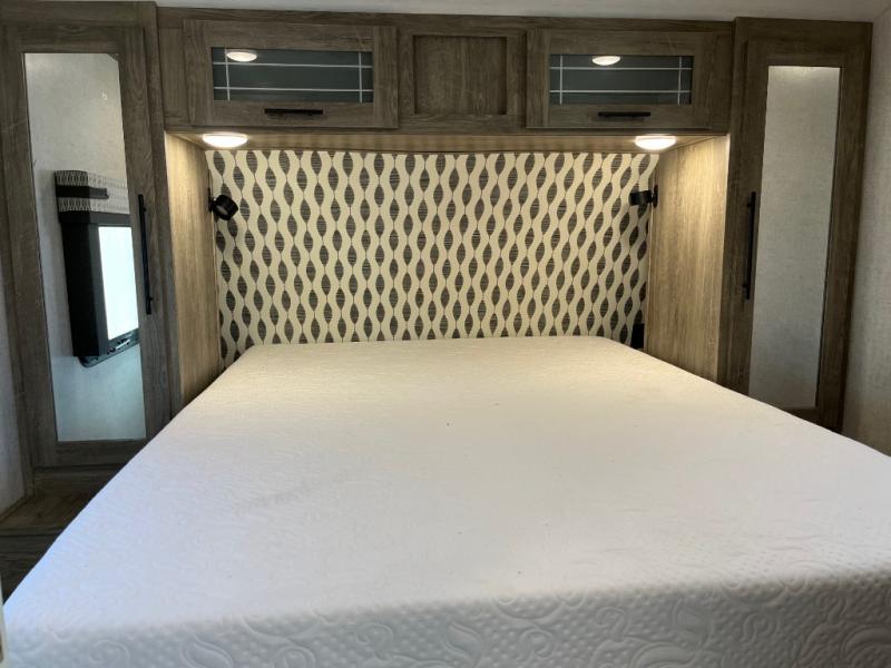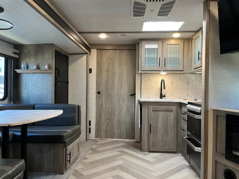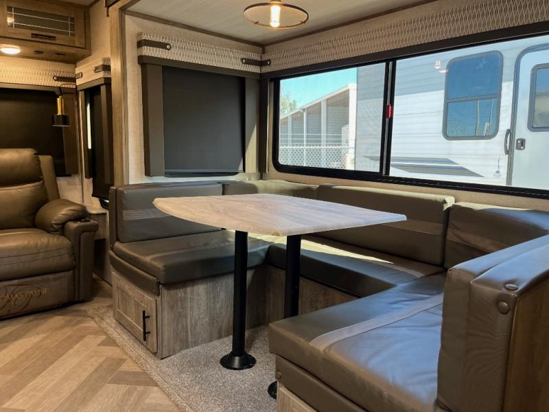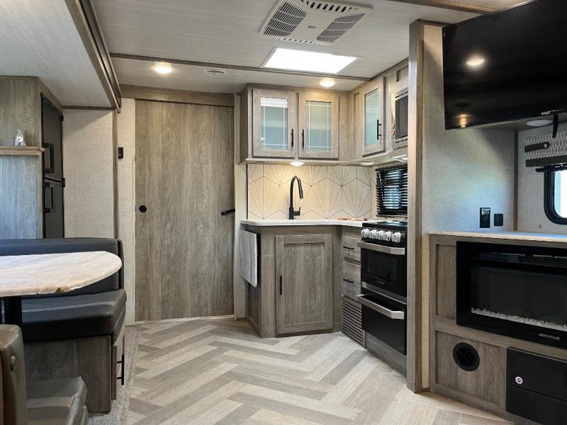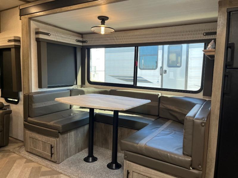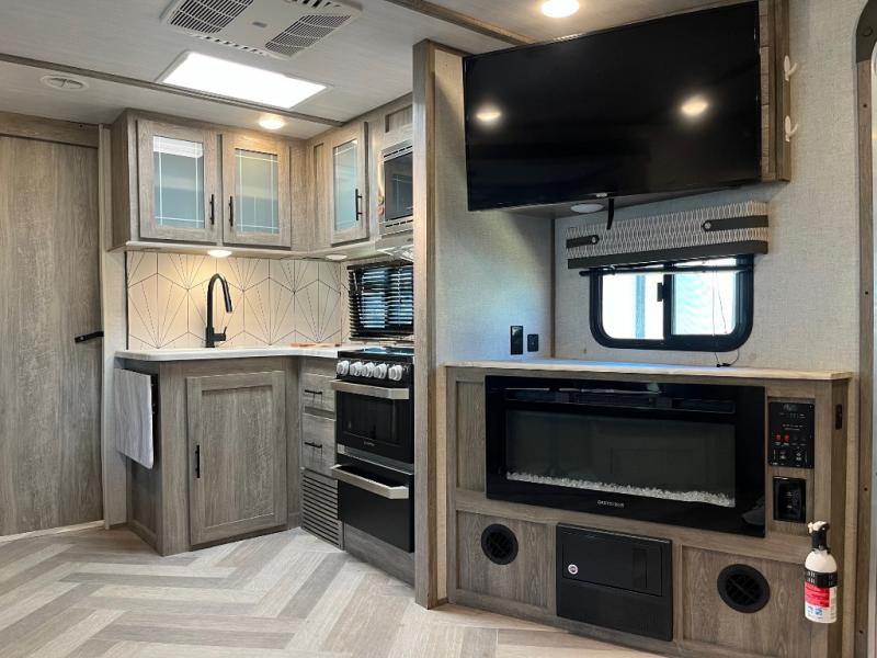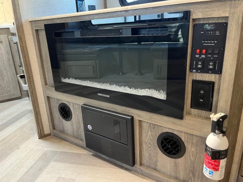 You're going to love camping with your own private bedroom which includes a walk-around queen bed with dual mirrored wardrobes and an entrance into the walk-through bathroom. You will find everything you need in the bathroom to get squeaky clean each morning including extra counter space. After you have whipped up a delicious meal with all the amenities needed plus a large pantry and residential refrigerator, you can head to the U-shaped dinette to dine inside while looking out the panoramic widows. You might like to watch a show on the 32" LED TV with the fireplace on and even recline in the sofa before heading outside for a hike or walk around the campgrounds.