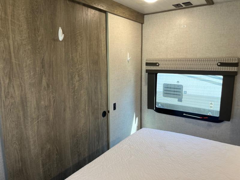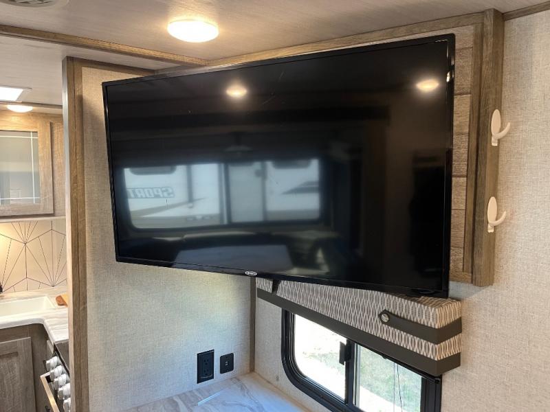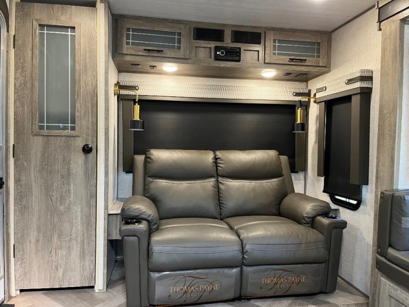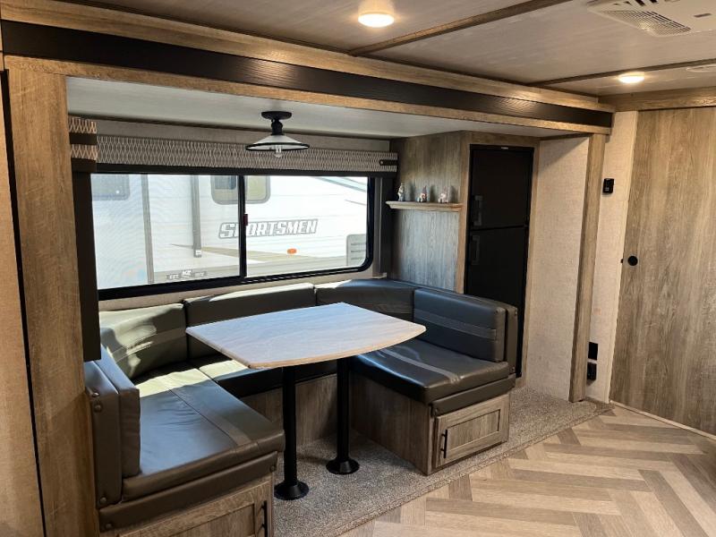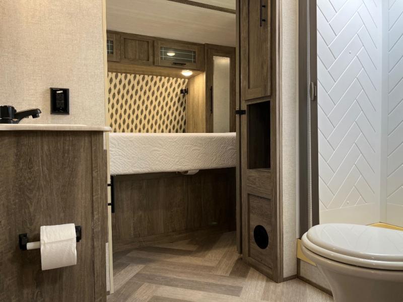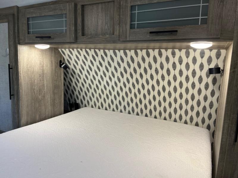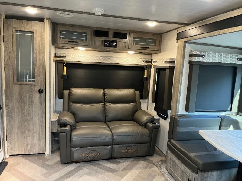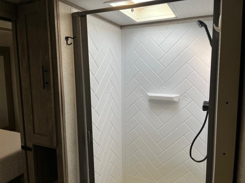You're going to love camping with your own private bedroom which includes a walk-around queen bed with dual mirrored wardrobes and an entrance into the walk-through bathroom. You will find everything you need in the bathroom to get squeaky clean each morning including extra counter space. After you have whipped up a delicious meal with all the amenities needed plus a large pantry and residential refrigerator, you can head to the U-shaped dinette to dine inside while looking out the panoramic widows. You might like to watch a show on the 32" LED TV with the fireplace on and even recline in the sofa before heading outside for a hike or walk around the campgrounds.