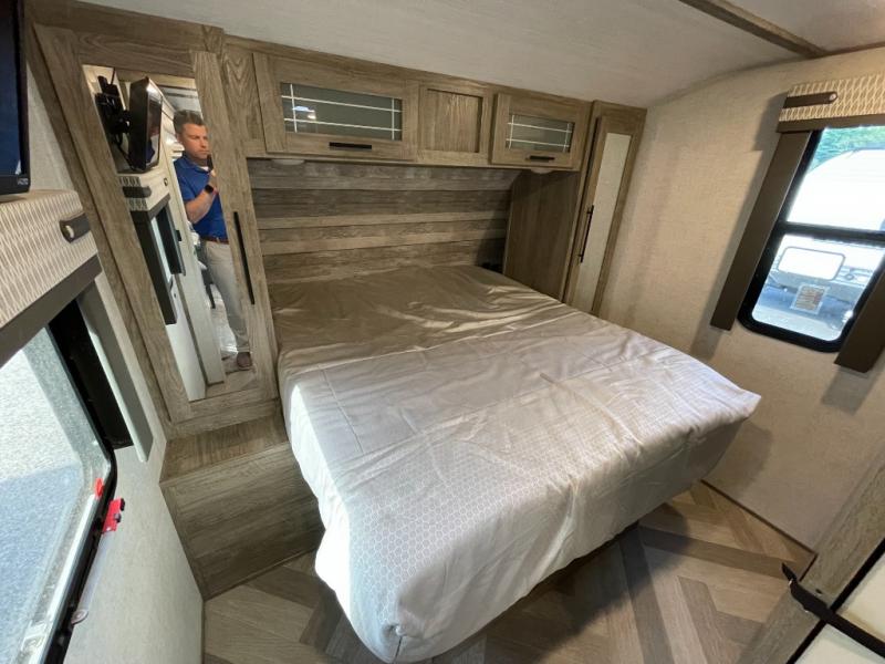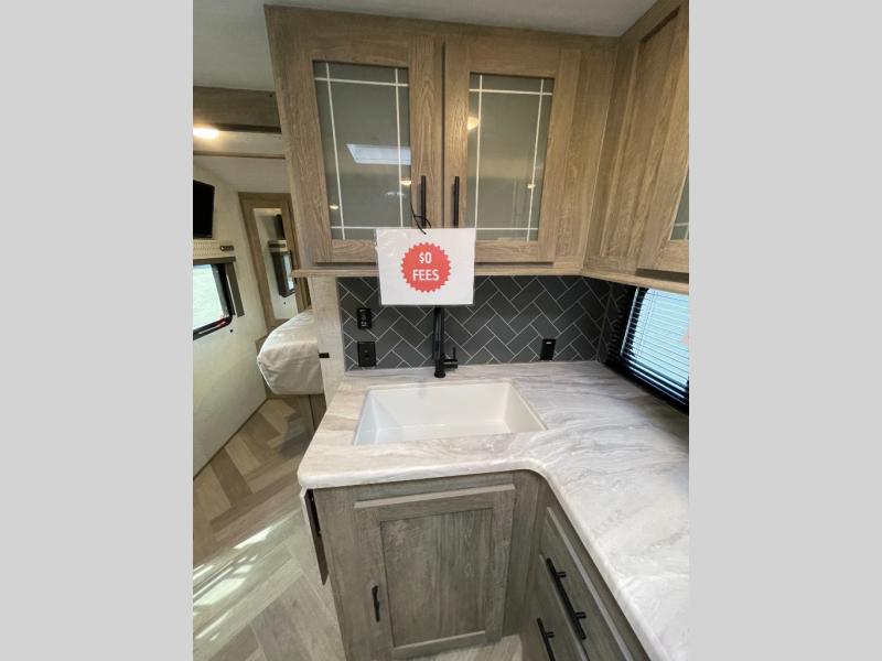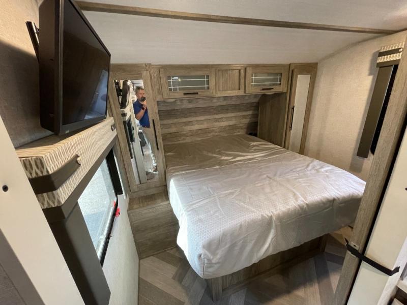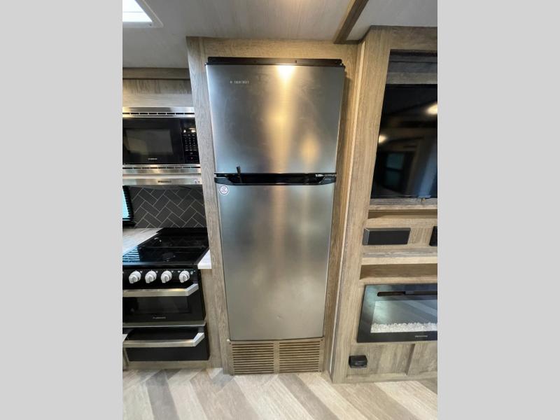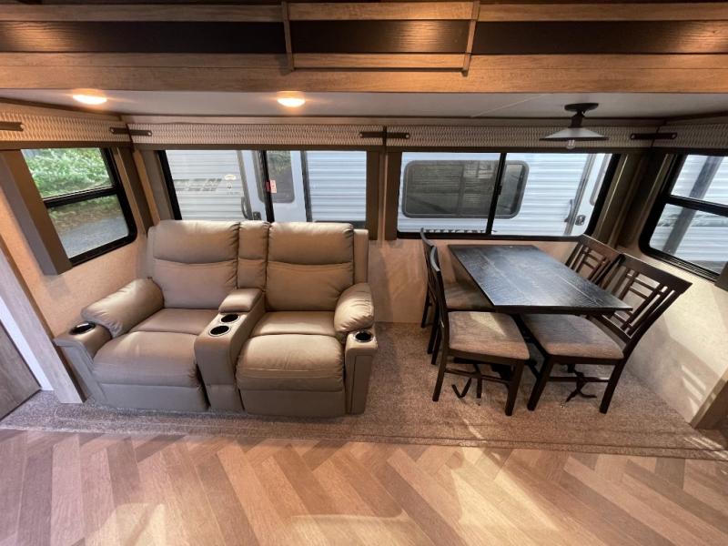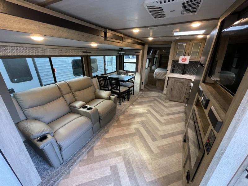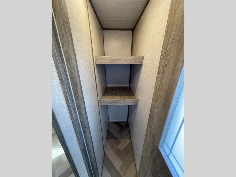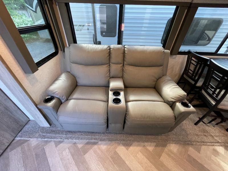 What better way to spend your nights than to grab your favorite snack from the walk-in pantry/closet and head to the theatre seating with cupholders across from the entertainment center which also features a fireplace. You will be able to easily whip up your best meals and clean up even easier with the residential single bowl undermount sink with a high rise faucet with pull out sprayer. The front private bedroom features a queen bed for you to get a good night's rest with mirrored wardrobes on either side to keep the room tidy, and the rear bathroom is spacious with a sliding door, plus includes a wardrobe and linen storage and more!