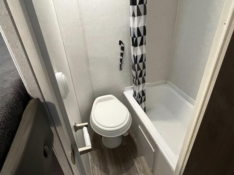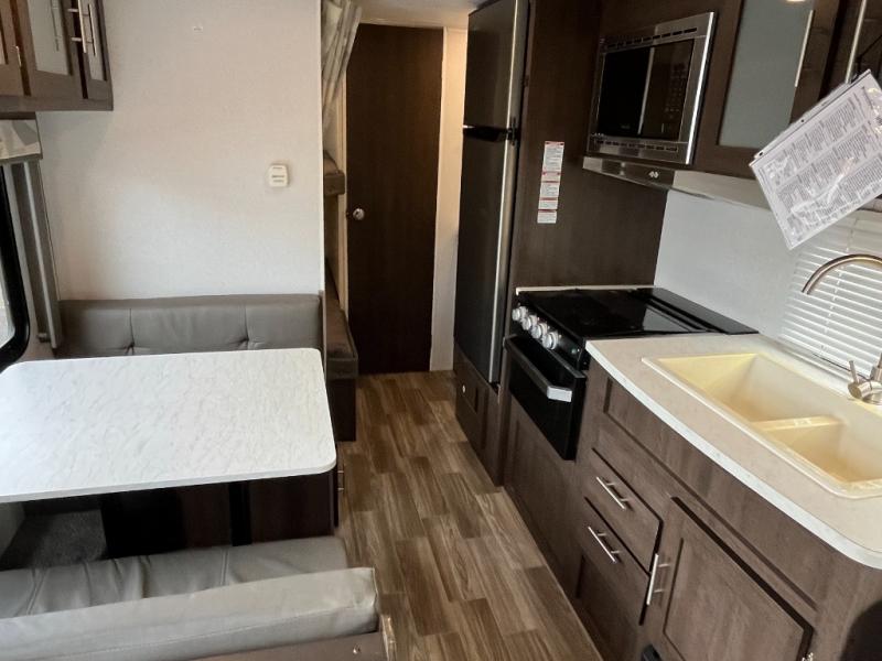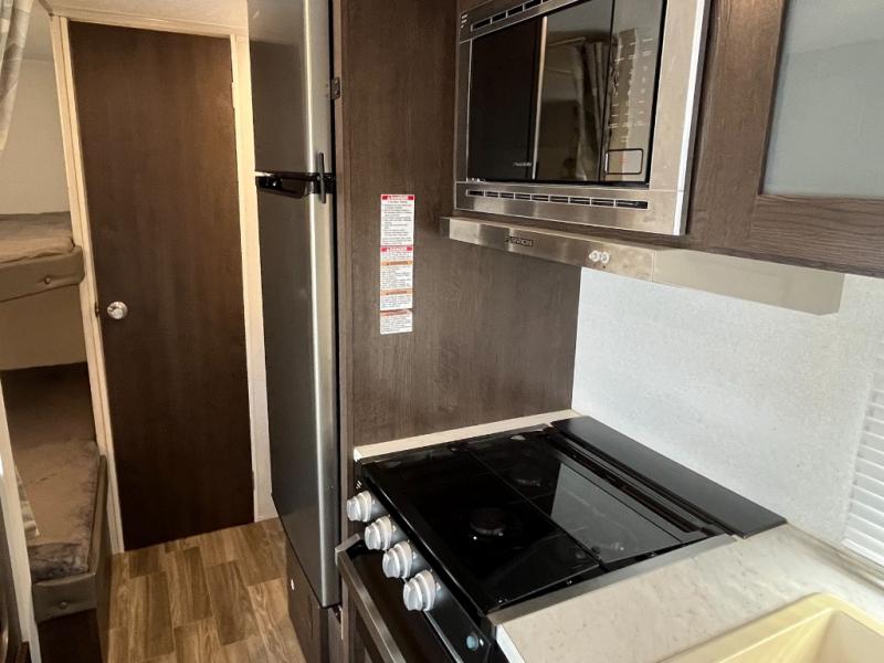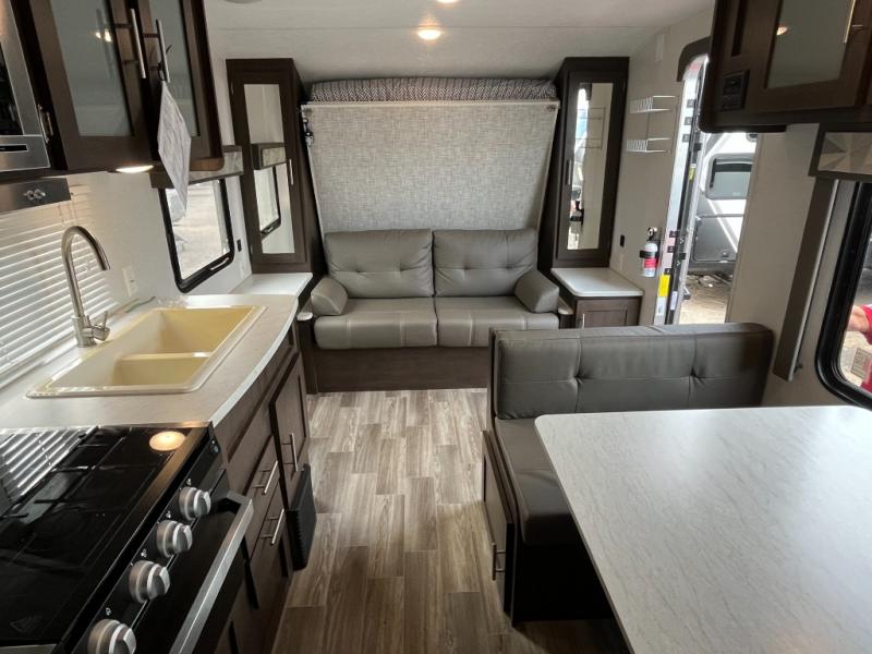 You will love the versatility that this Wildwood X-Lite model 19DBXL offers with a Jiffy sofa setup. You will have plenty of space and seating during the daytime hours between the sofa and booth dinette, even without any slide outs. There are also double over double bunk beds in the back next to the private tub/shower and toilet. You will find complete kitchen amenities indoors and also have the ability to cook outdoors when you choose to add the optional camp kitchen which is great on beautiful days. Even with a light rain the 12' awning gives you protection from the elements and allows you to cook and hang outside the trailer if you like.