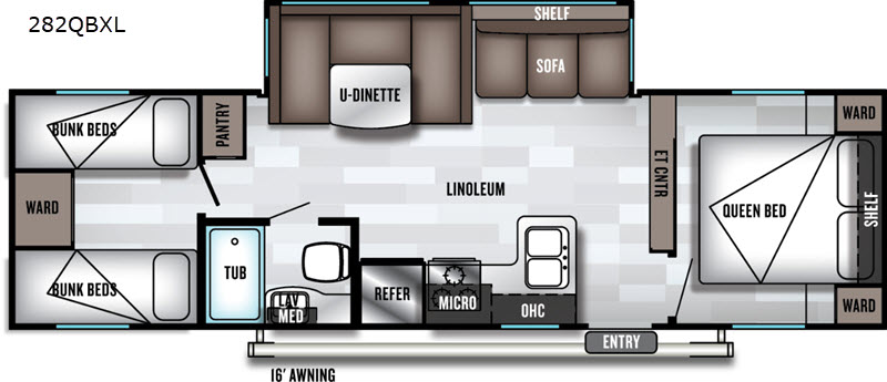 Enjoy camping with the whole family, or even a few extra guests in this Wildwood X-Lite travel trailer by Forest River. Model 282QBXL offers sleeping for nine with the rear private bunkhouse, plus a large slide out for added space inside making it comfortable for everyone! Along either side of the entertainment center there are sliding doors which close off the front bedroom. Outside there is a large pass-through storage area for your extra camping gear. You can enjoy the shade from the 16' awning while you watch the kiddos play!