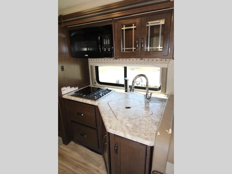 With any Four Winds Class C gas motorhome, you will enjoy the ease of driving and the affordable price. On the interior you will find residential vinyl flooring, high-sheen cabinetry with nickel finish hardware, and laminate countertops which make it easy to clean after a weekend getaway or an extended vacation. The stainless steel bathroom sink and foot flush porcelain toilet provide added convenience every where you stop, and the skylight above the shower is an exceptional feature that brings in the morning sunlight and brightens up the interior.