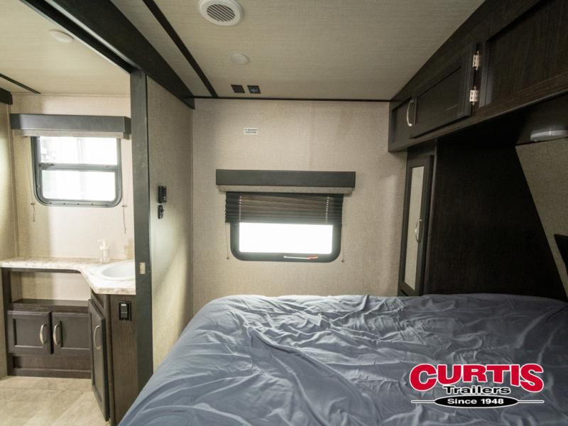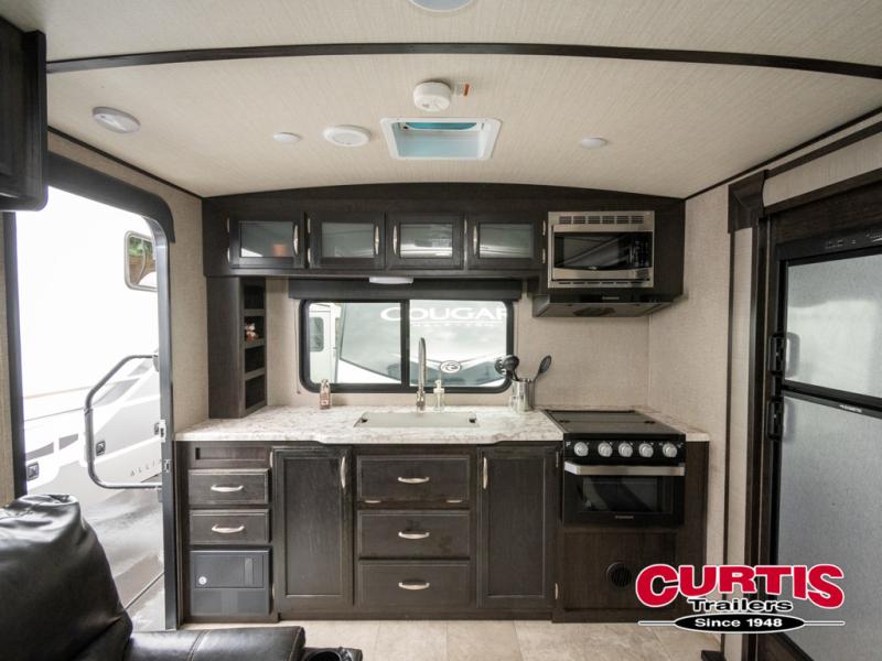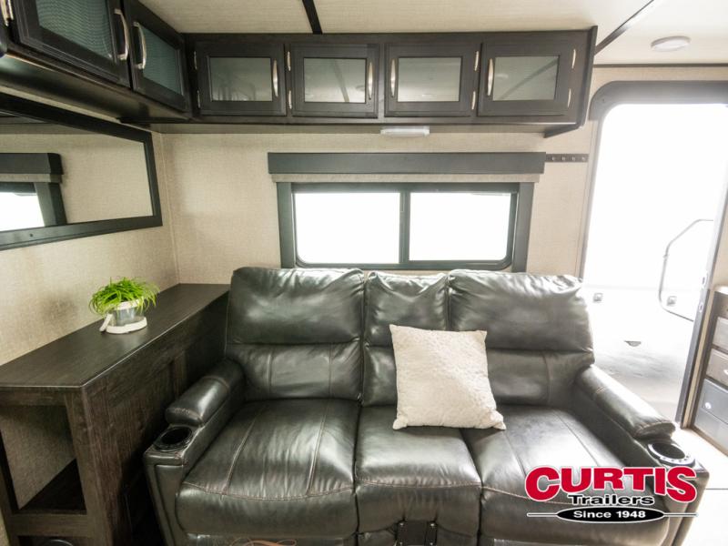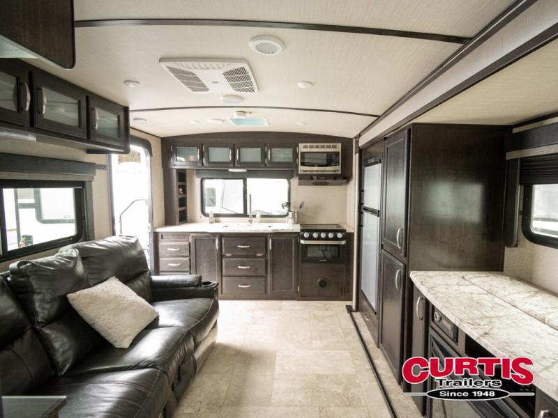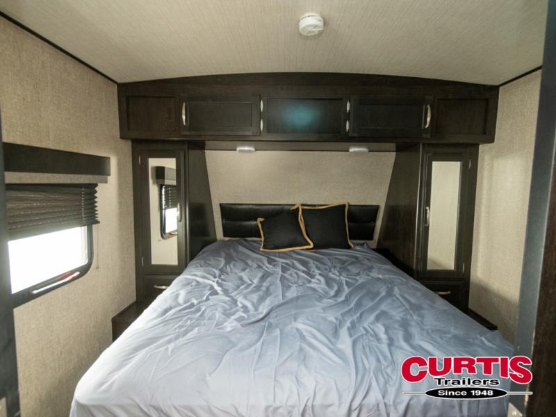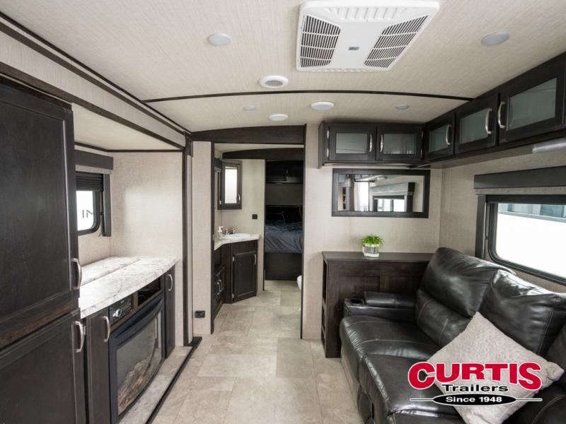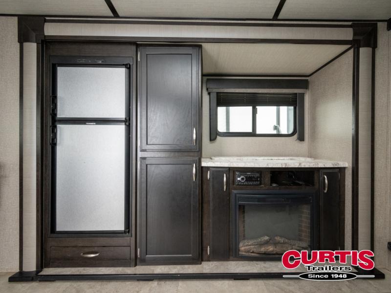 No matter if you choose a state park or your family's ranch, you will enjoy this layout for several reasons. First, the dual entry doors allow quick access from both ends of the trailer. When you are ready to watch a show or movie, the 40" telescoping TV is above the fireplace for a cozy night inside. You will find many more conveniences you don't want to camp without such as full kitchen and bath amenities, and plenty of storage.
