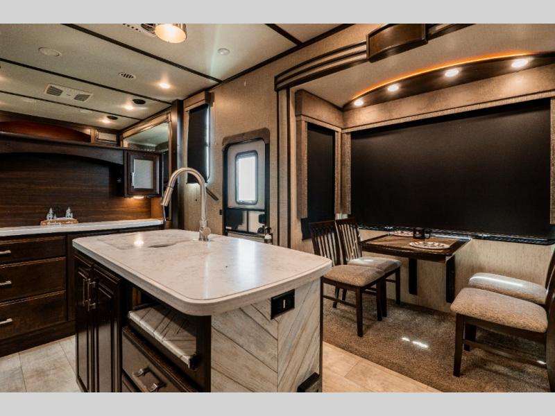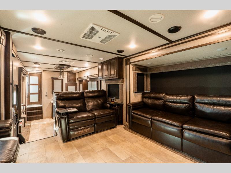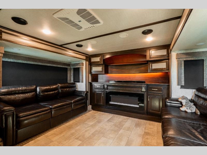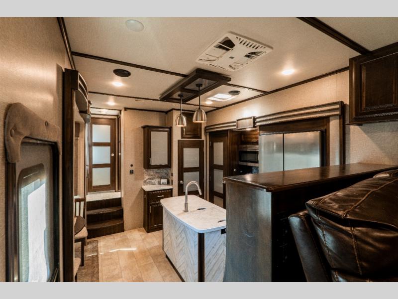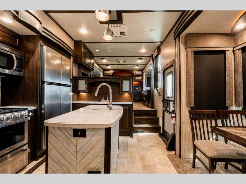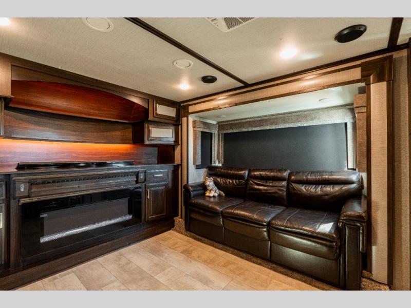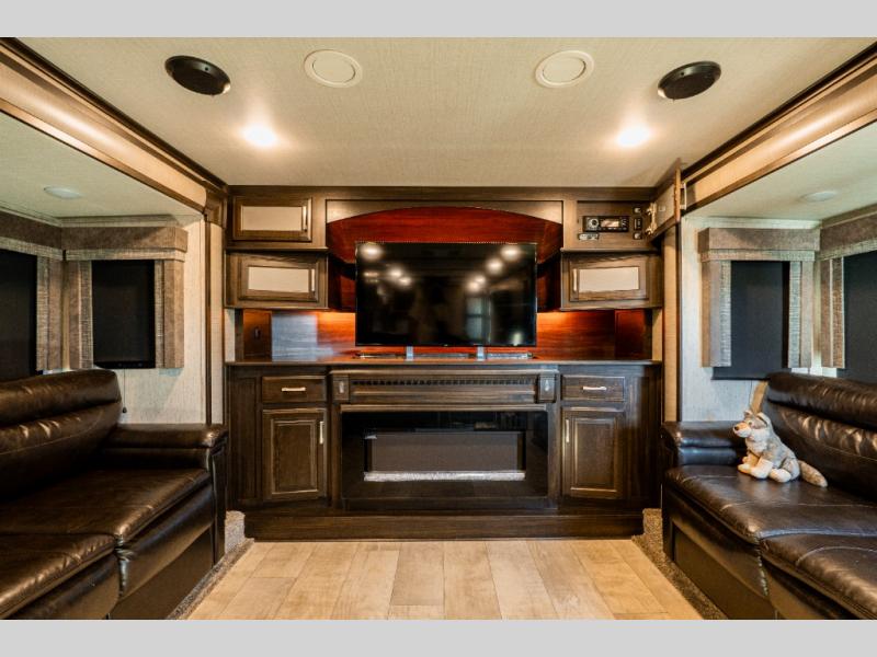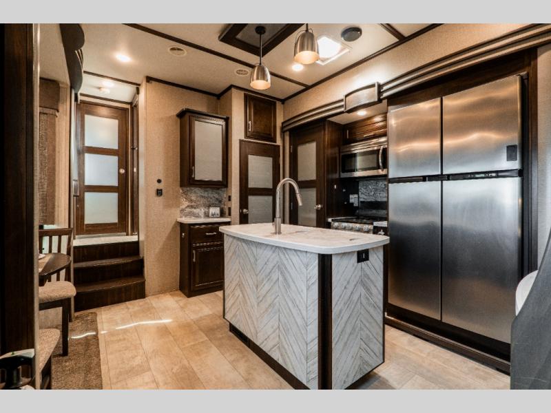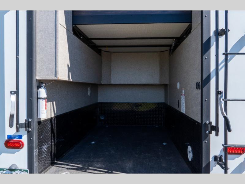 Gain momentum for your upcoming adventures by choosing this Momentum toy hauler to start the journey off right! The below-floor garage allows you to relax comfortably in the rear bedroom while your cargo is stored away underneath, and the bed lift extends the garage height to 6' 5" for tons of space. The dual-entry bath will come in handy at night so that you have easy access from the bedroom, and your guests can use the hallway entrance. Step down to the kitchen area where you'll find opposing slides for more space, a kitchen island with stools that the kids are sure to love, and plenty of storage with the pantry drawers, a hutch with a desk, and an additional pantry. After a day of riding the trails outside, you're going to love relaxing in the front living room which includes two tri-fold sofas, theater seating, and a telescoping TV with a fireplace below for all-around comfort.