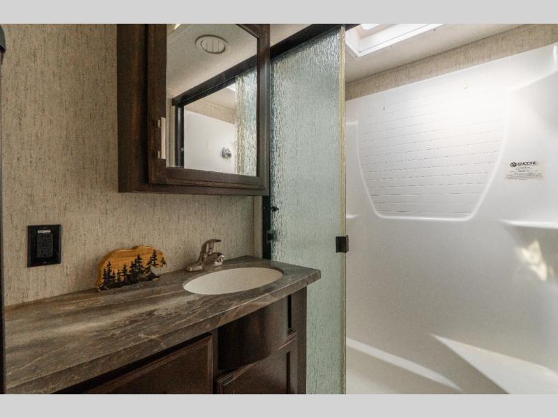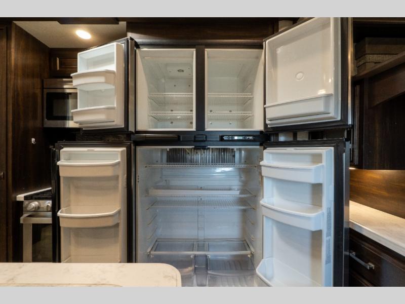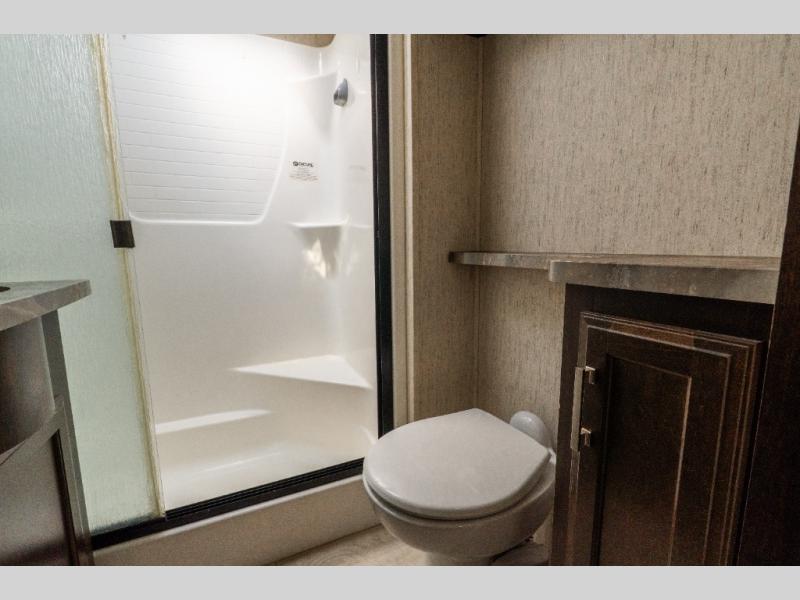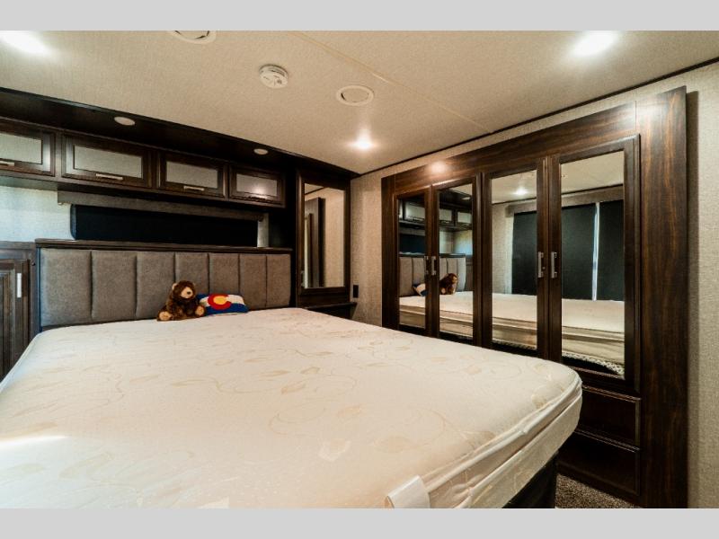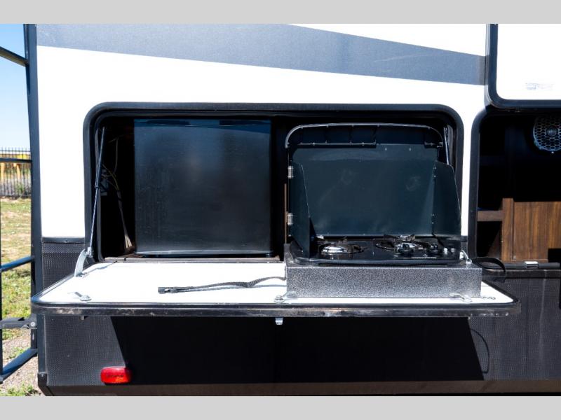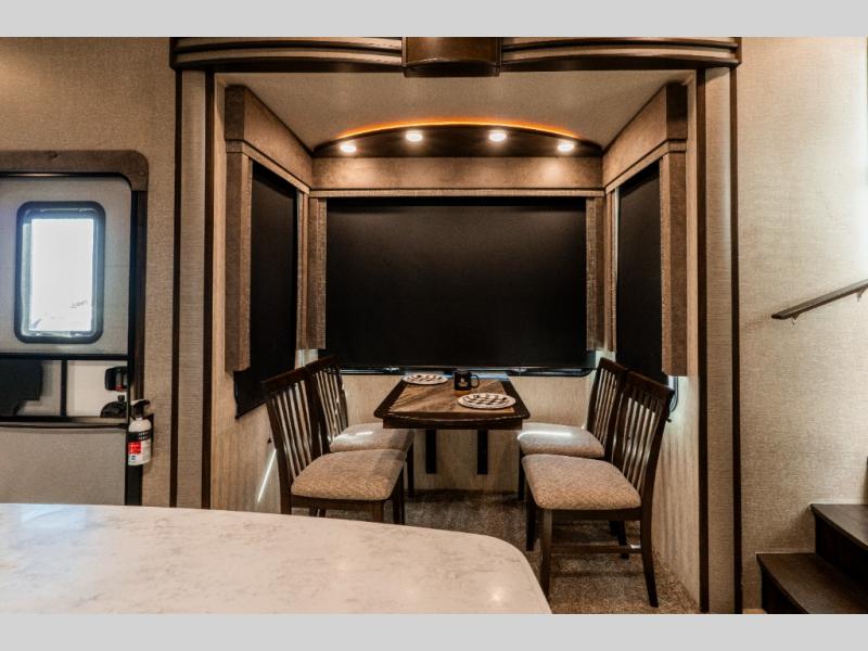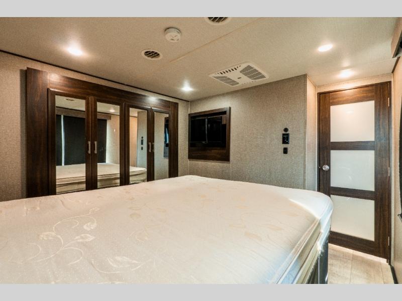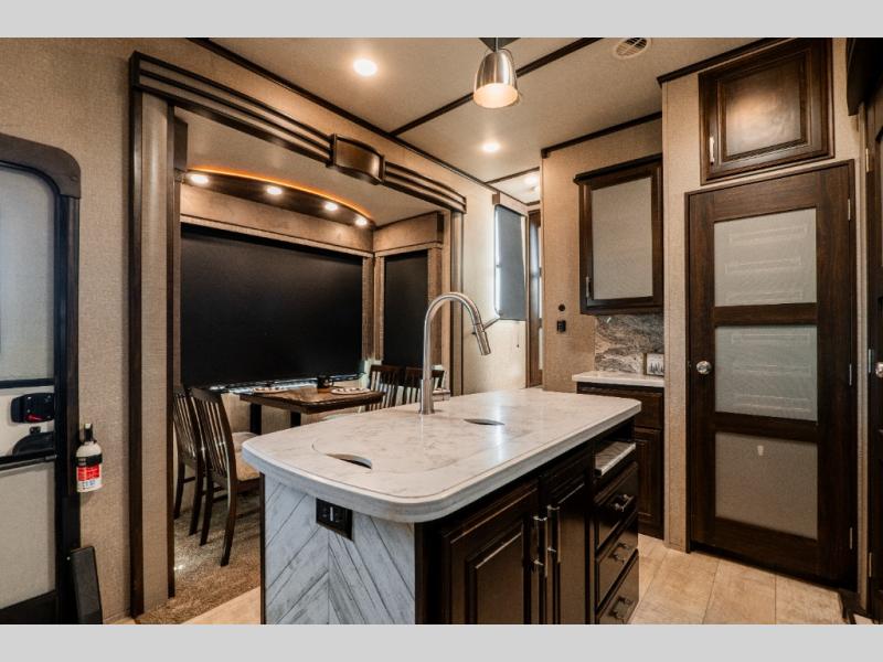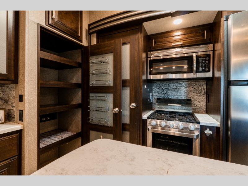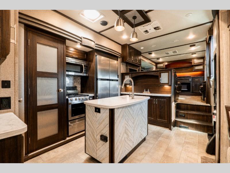 Gain momentum for your upcoming adventures by choosing this Momentum toy hauler to start the journey off right! The below-floor garage allows you to relax comfortably in the rear bedroom while your cargo is stored away underneath, and the bed lift extends the garage height to 6' 5" for tons of space. The dual-entry bath will come in handy at night so that you have easy access from the bedroom, and your guests can use the hallway entrance. Step down to the kitchen area where you'll find opposing slides for more space, a kitchen island with stools that the kids are sure to love, and plenty of storage with the pantry drawers, a hutch with a desk, and an additional pantry. After a day of riding the trails outside, you're going to love relaxing in the front living room which includes two tri-fold sofas, theater seating, and a telescoping TV with a fireplace below for all-around comfort.