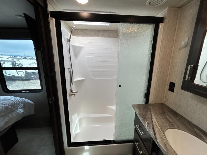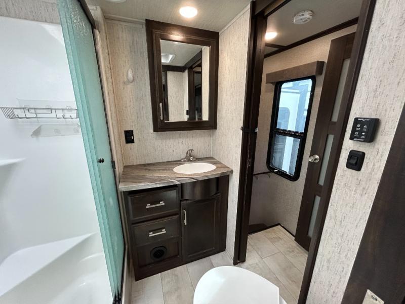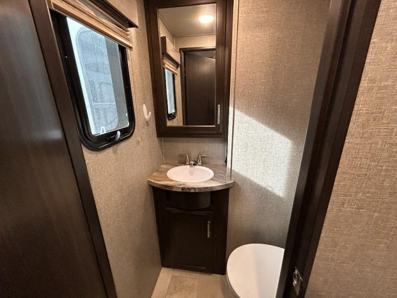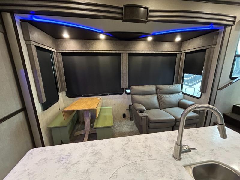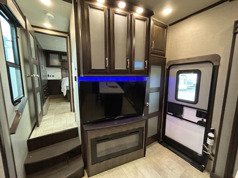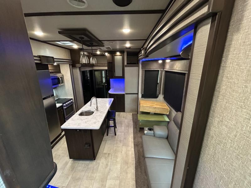 If you are ready to play with your off-road toys, then it's time to hitch up this Momentum fifth wheel toy hauler after loading your toys in the 13' separate garage. You will be able to get cleaned up after getting muddy from the trails in the half bath in the garage or the sunken tub with skylight in the full bathroom up in the master suite. The kids can sit at the kitchen island with bar stools or relax on the theater seats while watching the 49" LED TV and fireplace. The fold-down side patio is going to be your favorite spot when summertime rolls around, and the exterior unobstructed pass-through storage compartment will allow you to bring along some lawn chairs that you can set up on the patio.