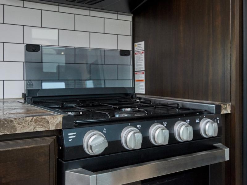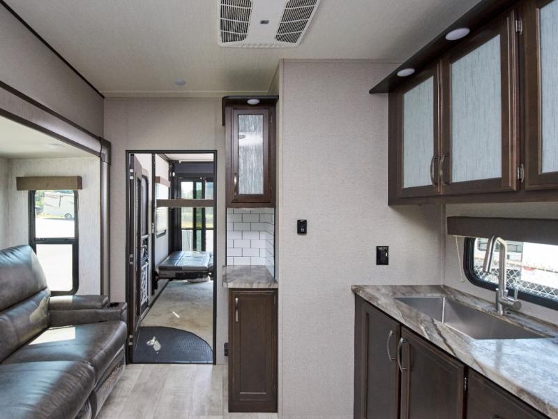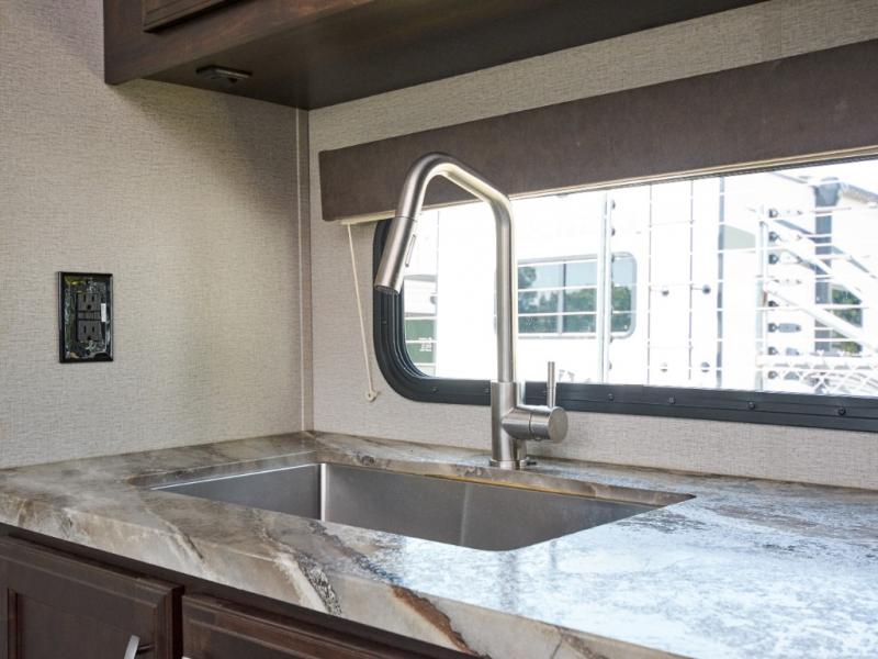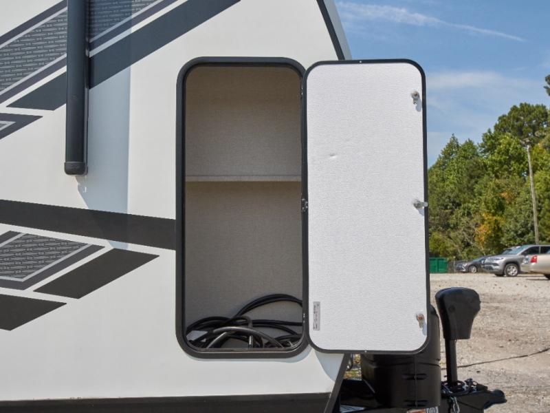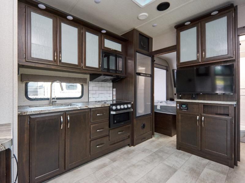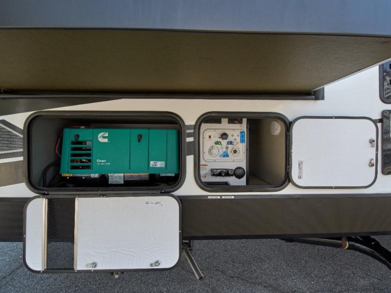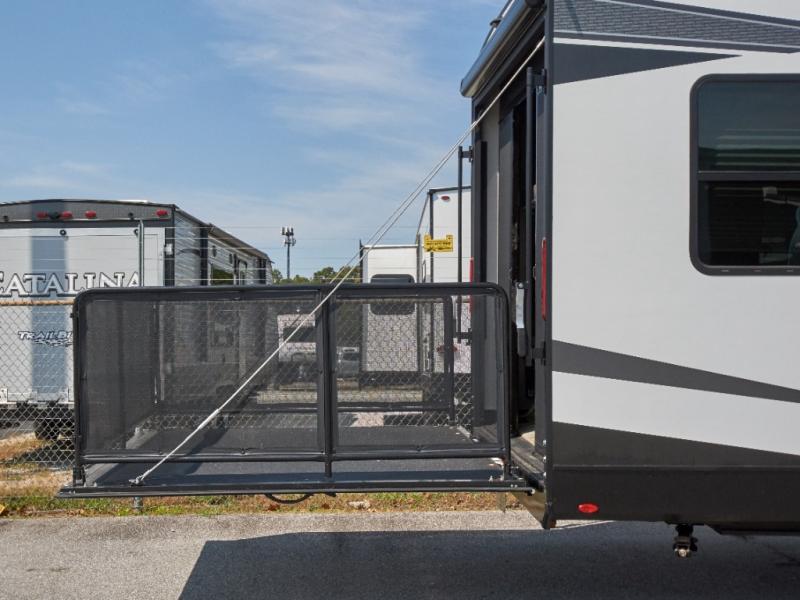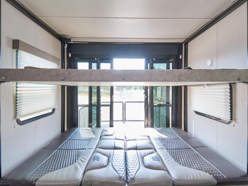 Built for all-season exploration, this toy hauler includes Grand Design’s Insulation Package with a heated and enclosed underbelly, high-capacity furnace, and moisture barrier floor enclosure. Outside, enjoy the convenience of 2,500-lb tie-downs, a dovetail rear ramp, and a universal fuel gauge for seamless operation.