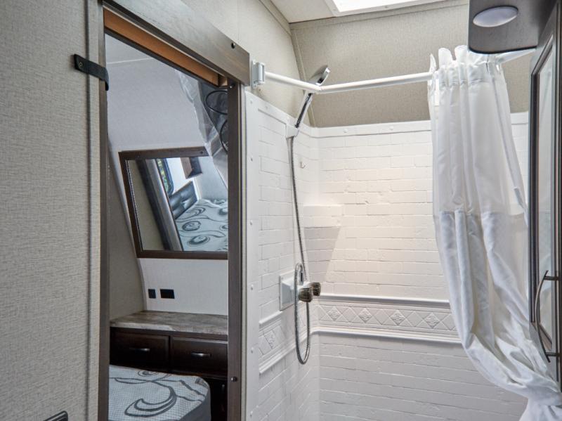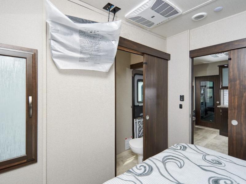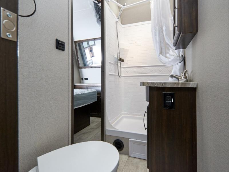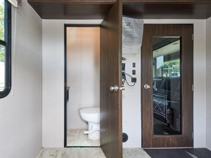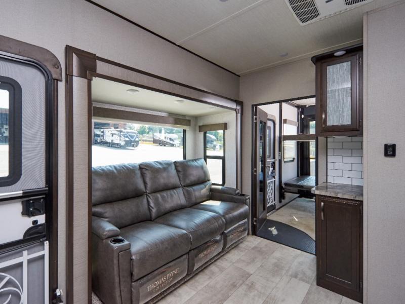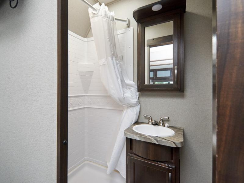 The living area features plush theater seating and a large LED TV, perfect for winding down after a day of adventure. The master suite includes a queen bed and direct access to the dual-entry bath with a residential walk-in shower.
