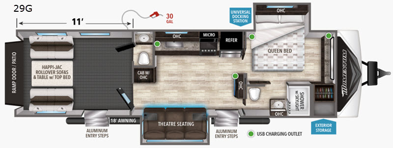 - Spacious 11' Garage with Happi-Jac rollover sofas, top bunk, and half bath