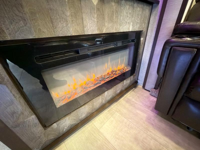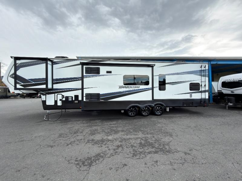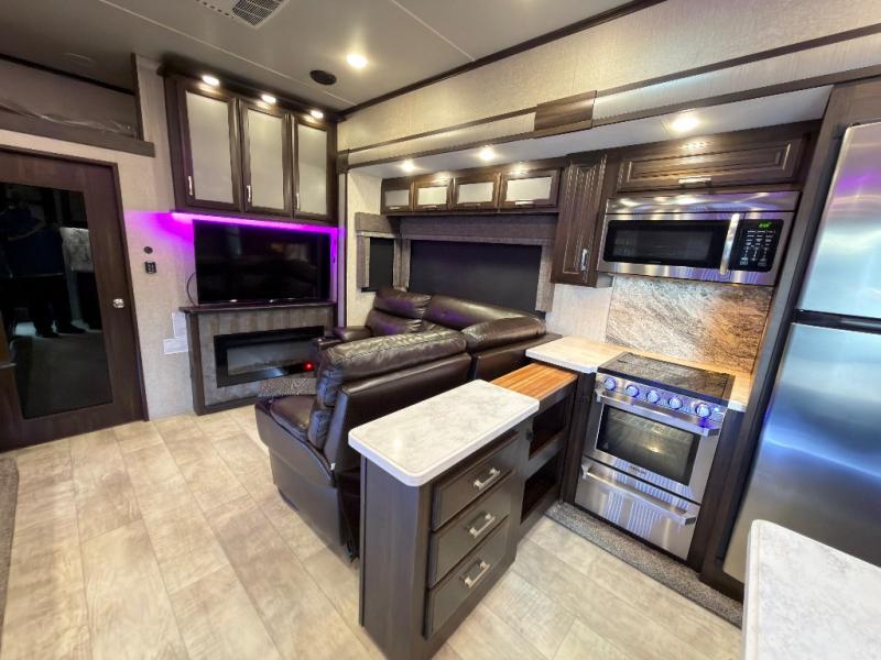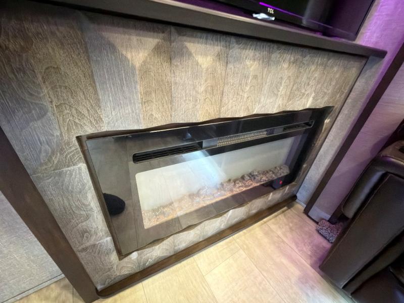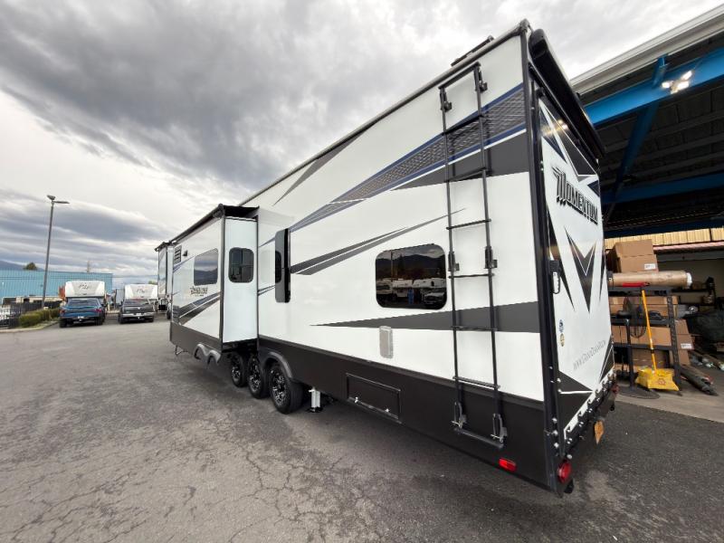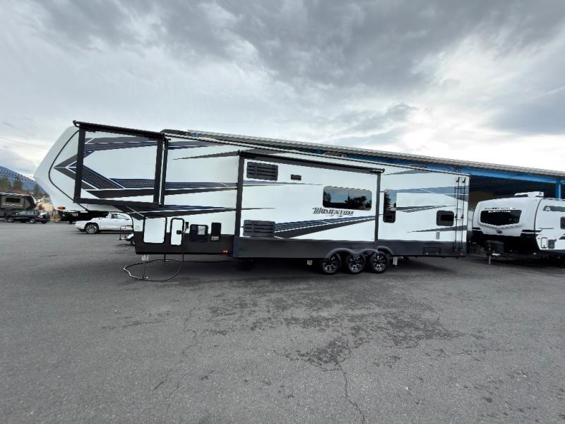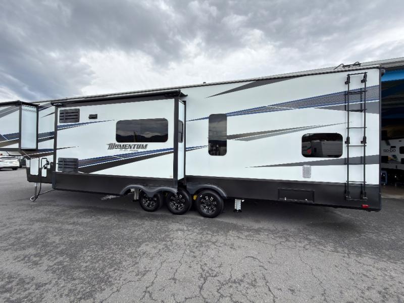If relaxation and off-road fun have been calling your name, this Momentum M-Class 395M toy hauler fifth wheel will provide the luxury you love along with toy storage. From the garage featuring 12'6" of space for an ATV and dirt bikes and a bath and a half bath to a kitchen and living area with theatre seating, an L-shaped sofa, and a fireplace with a 49" LED TV above, so you can relax indoors when you aren't having fun outdoors.