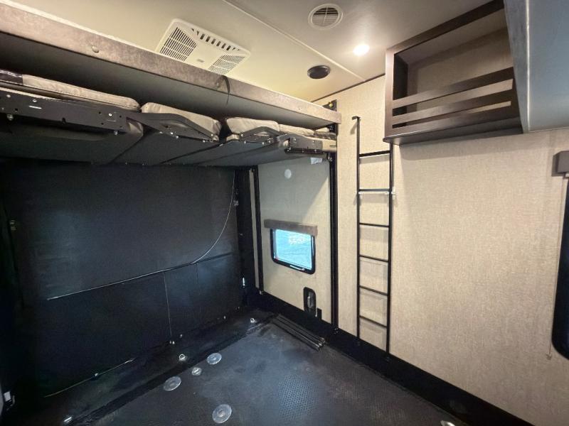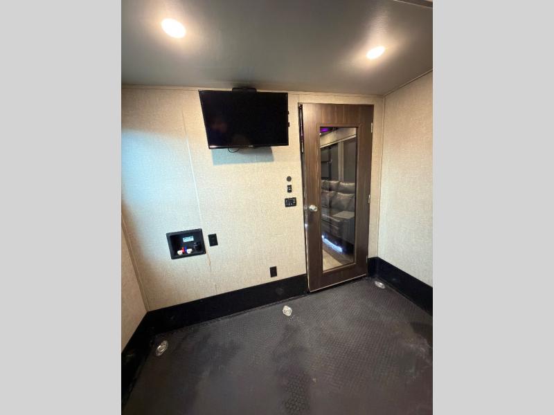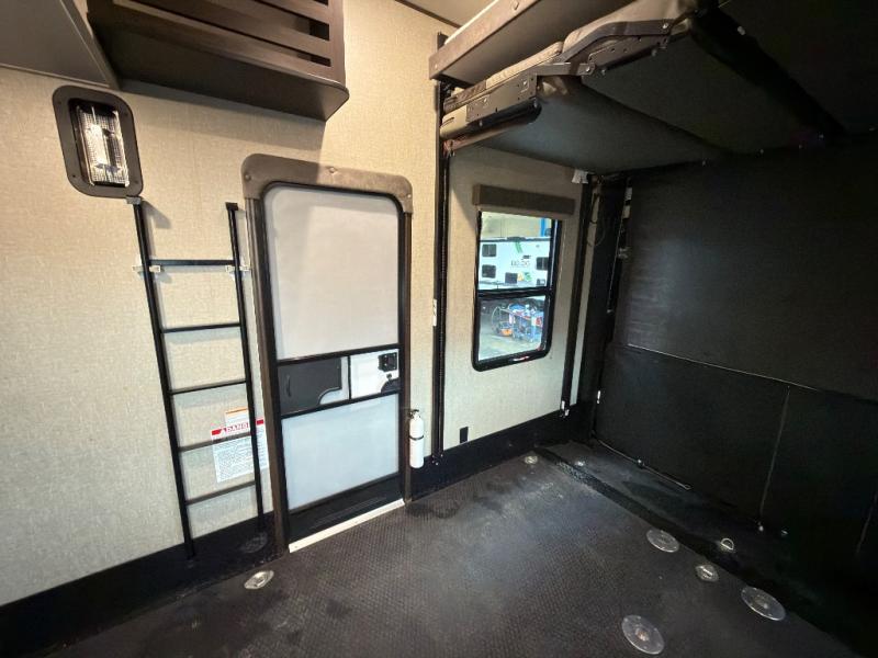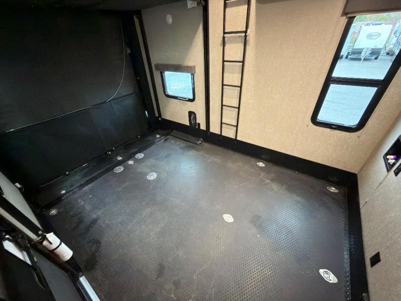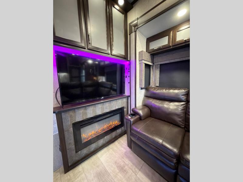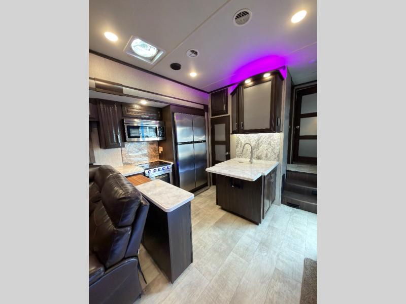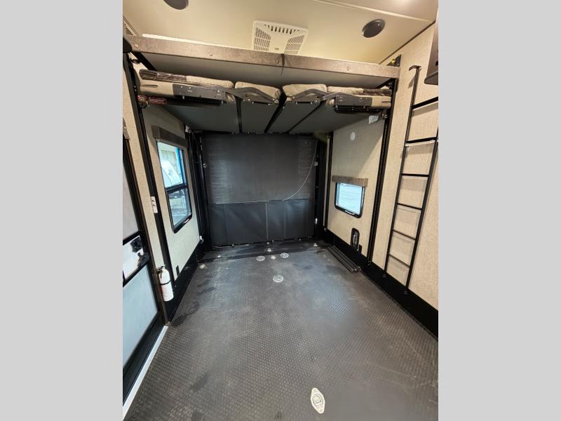 If relaxation and off-road fun have been calling your name, this Momentum M-Class 395M toy hauler fifth wheel will provide the luxury you love along with toy storage. From the garage featuring 12'6" of space for an ATV and dirt bikes and a bath and a half bath to a kitchen and living area with theatre seating, an L-shaped sofa, and a fireplace with a 49" LED TV above, so you can relax indoors when you aren't having fun outdoors.