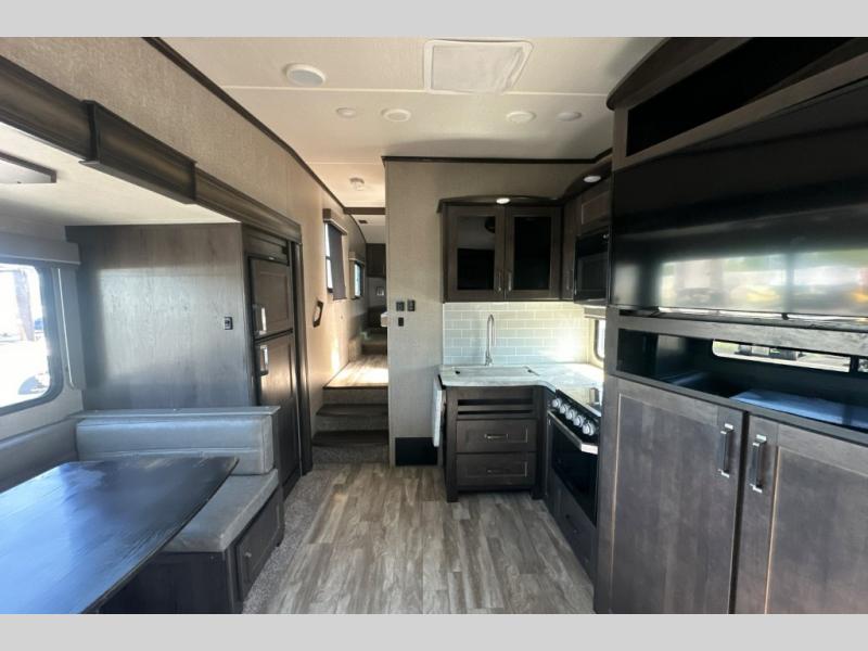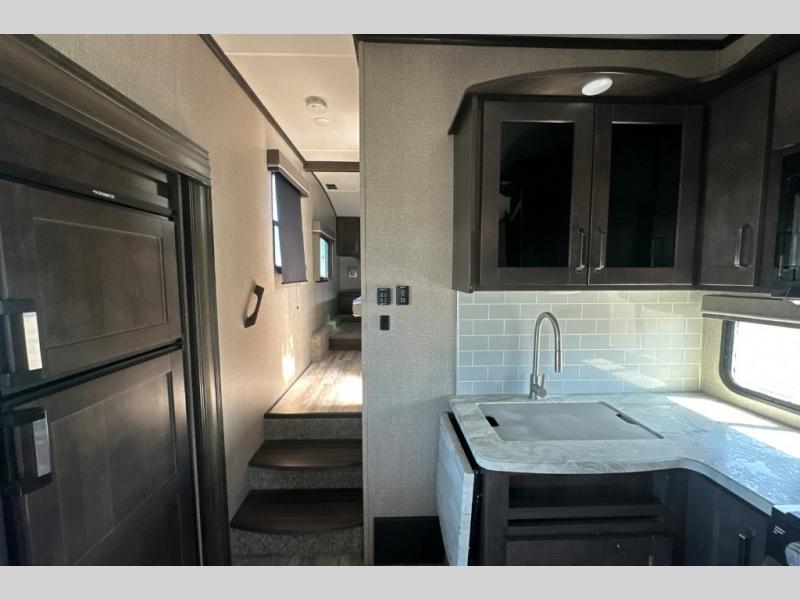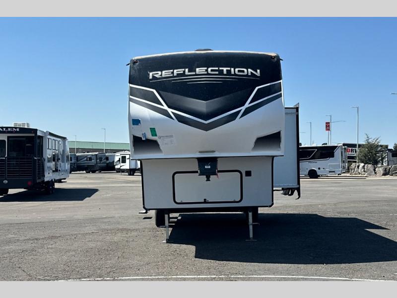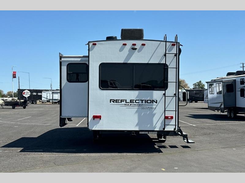 Each Reflection 150 Series fifth wheel by Grand Design allows you to use your half-ton and short bed truck to tow thanks to the 90 degree turning radius swivel pin box. The Universal All-In-One docking station, the LP Quick Connect, and the One-Touch automatic leveling system will make setting up and packing up easy for those weekenders or full-timers that like to move around to see the countryside. Inside you will love the Gunstock fixtures and hardware, the louvered tread steps to the bedroom, the large panoramic windows, plus the many features in the mandatory packages. It's time to reflect on your wise choice, choose a Reflection 150 Series today!