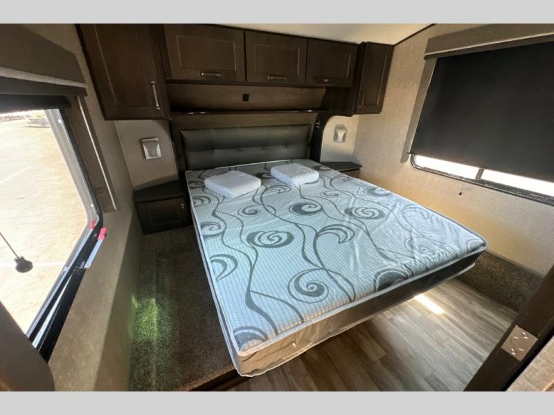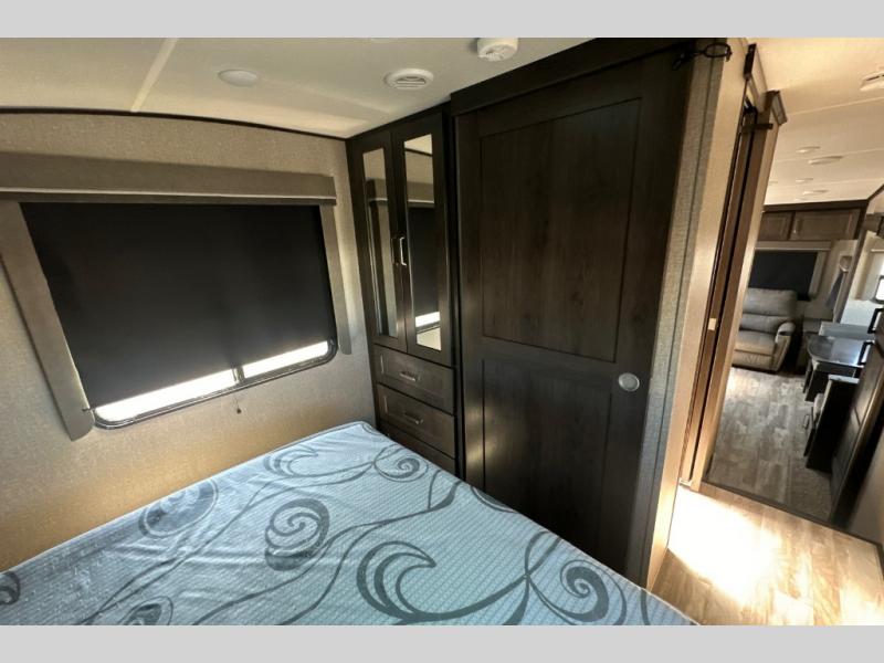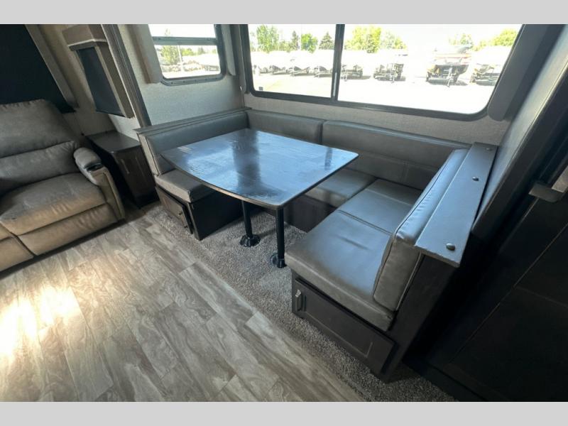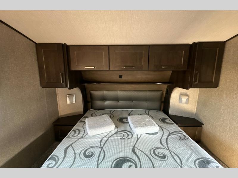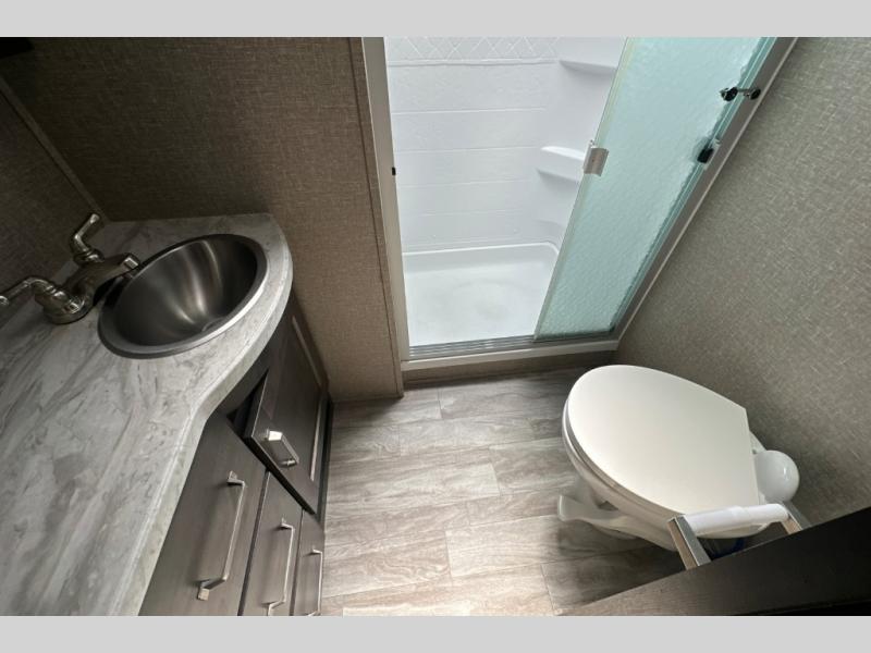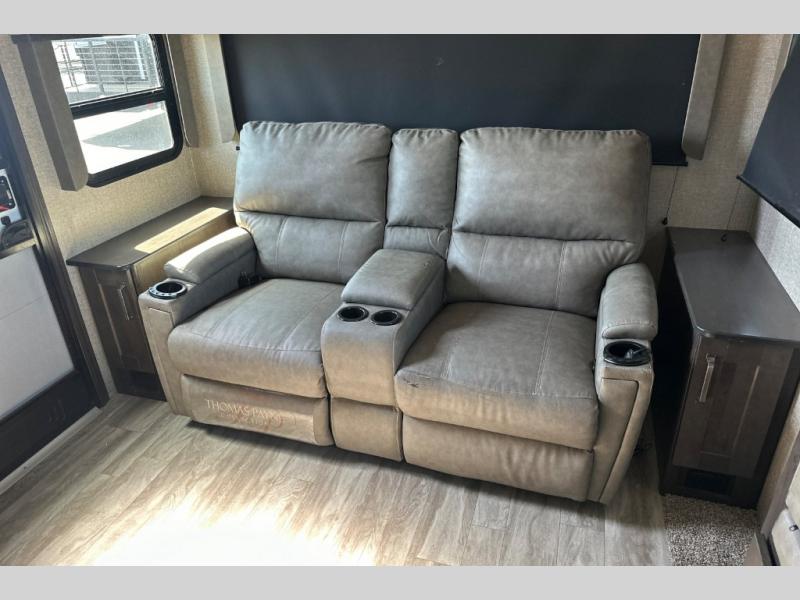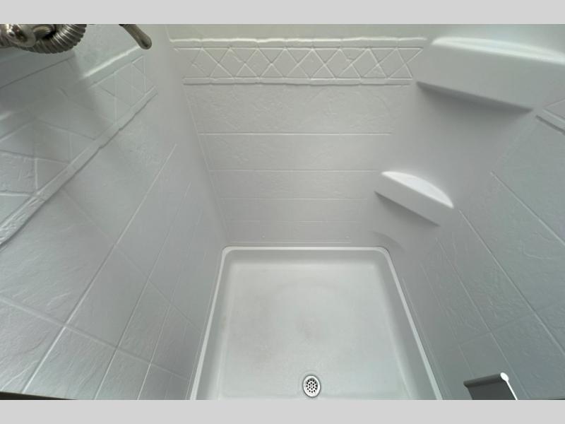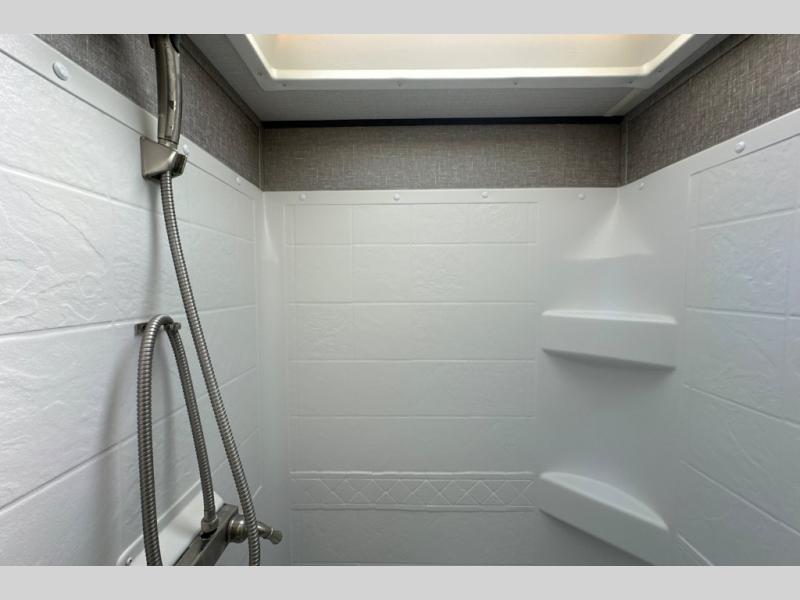 As you use the massage feature on the theatre seats with LED lights, you can also watch the HD LED TV, and visit with the cook in the L-shaped kitchen with counter extension for more space to dry the dishes. The 80" U-shaped dinette offers a great place to dine and play games when someone hasn't folded it down to sleep on at night. The walk-in shower allows you to be refreshed and ready for whatever comes next, be it a walk around the campsite, shopping in town, or falling asleep. And you will be able to enjoy the comforts of your own private bedroom with a queen bed and lots of storage.