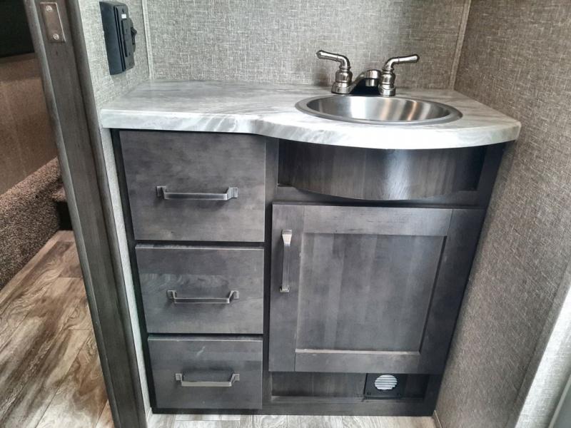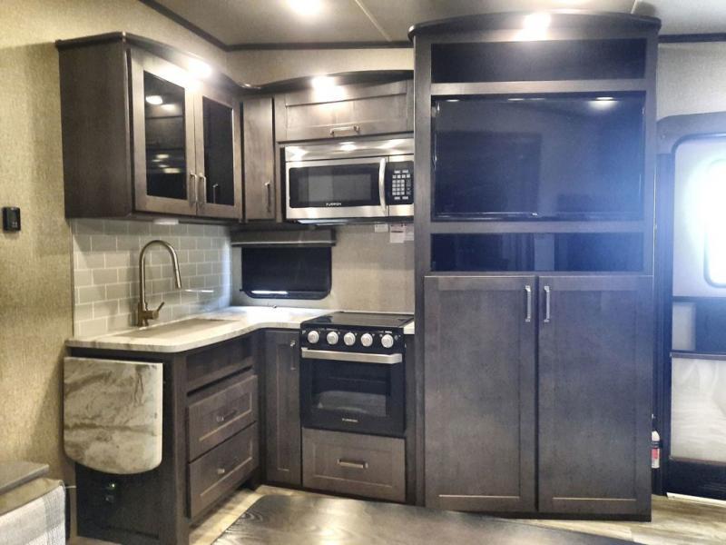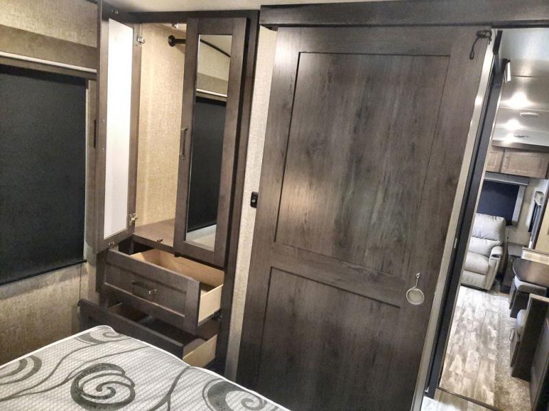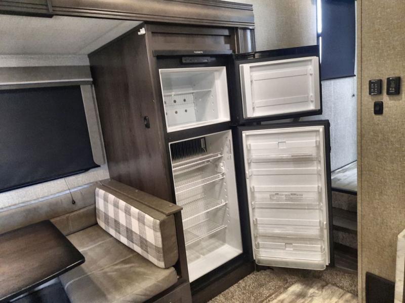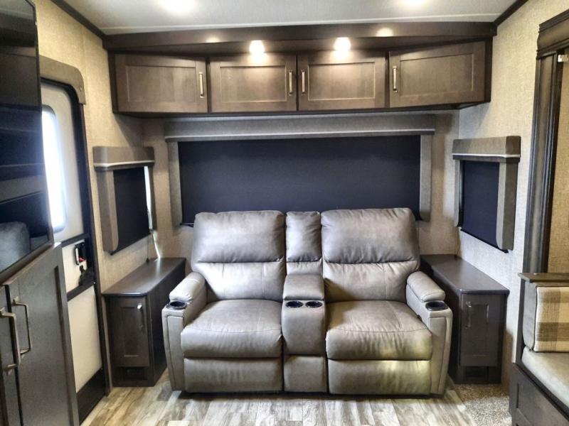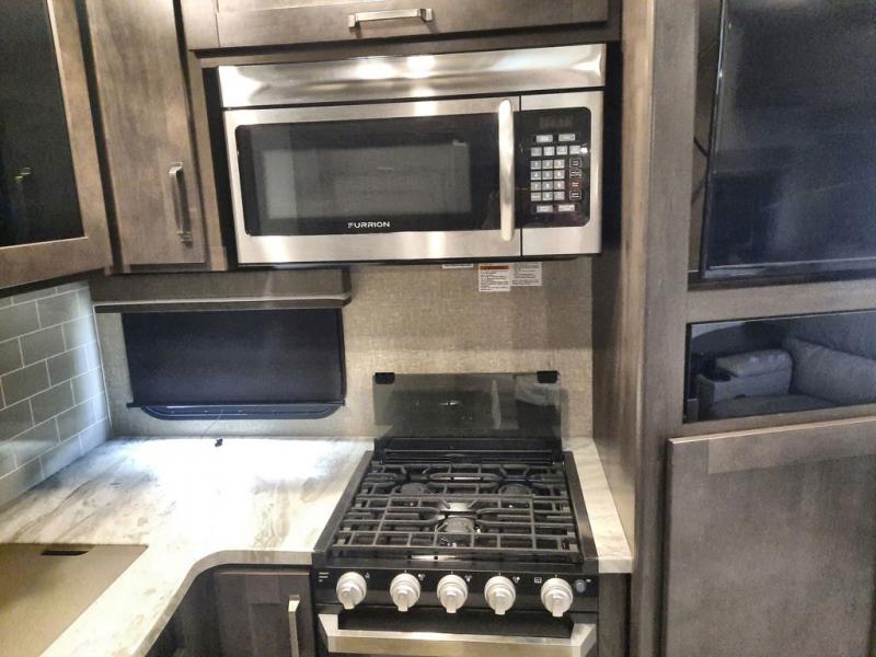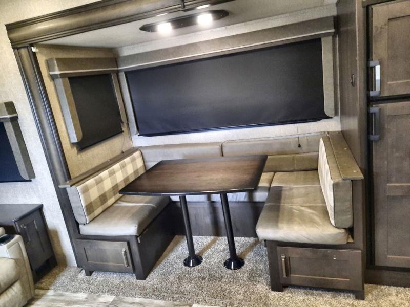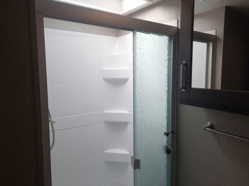 As you use the massage feature on the theatre seats with LED lights, you can also watch the HD LED TV, and visit with the cook in the L-shaped kitchen with counter extension for more space to dry the dishes. The 80" U-shaped dinette offers a great place to dine and play games when someone hasn't folded it down to sleep on at night. The walk-in shower allows you to be refreshed and ready for whatever comes next, be it a walk around the campsite, shopping in town, or falling asleep. And you will be able to enjoy the comforts of your own private bedroom with a queen bed and lots of storage.