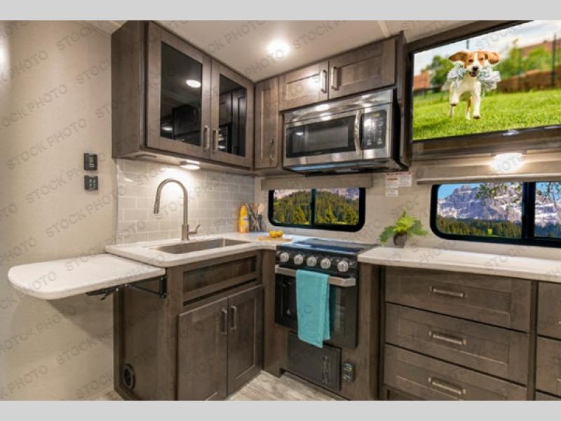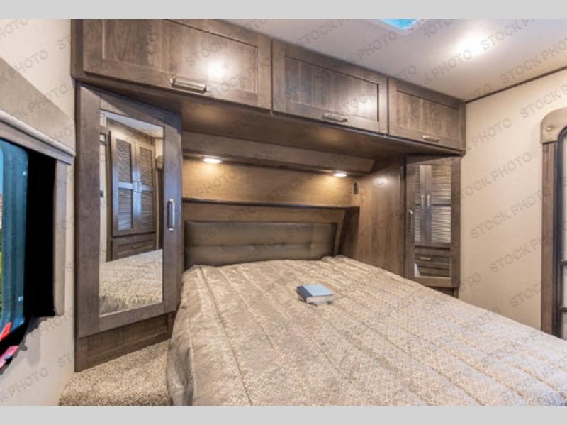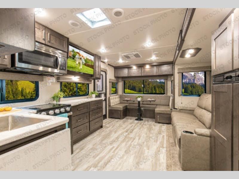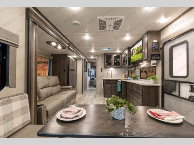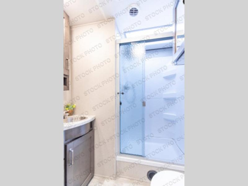 You will want to extend your camping trip with this Reflection travel trailer! Step inside and notice how the outdoors makes its way inside through the large panoramic windows surrounding the rear U-shaped dinette and above the slide out that contains a theatre seat, the 12 cu. ft. refrigerator and a pantry. The rear living area has plenty of seating so you can invite your camp neighbors over and enjoy the 40" LED swing arm TV. At night, a queen pillowtop mattress will be a welcome retreat for a great night's rest. You will find plenty of storage for your clothing and things with bedside shirt closets, a king size wardrobe with storage drawers, and more space for the clothing you hang. The underbed storage is also nice for larger items you wish to keep inside. When you wake each morning the full bath nearby will welcome you with a glimpse of the day ahead through the large shower skylight. And, when you are ready for your next adventure, head out through one of the two entry/exit doors.