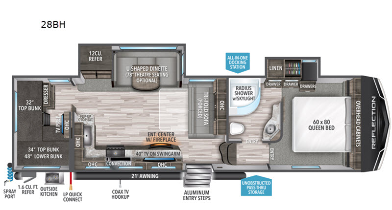 This rear private bunkhouse Reflection fifth wheel is sure to be a crowd pleaser! With a U-shaped dinette and tri-fold sofa, you can sleep even more guests to make this a fun getaway with friends. The heated pass-through compartment area is big enough for you to bring along all of your camping essentials. You can even choose to cook outside at the outdoor kitchen while relaxing under the 21' electric awning. If the weather moves you inside, you will have plenty appliances to keep your belly full, as well as a 40" TV and fireplace to keep you entertained and warm. Come see why this model is popular with larger families, and smaller families that enjoy plenty of room to themselves.