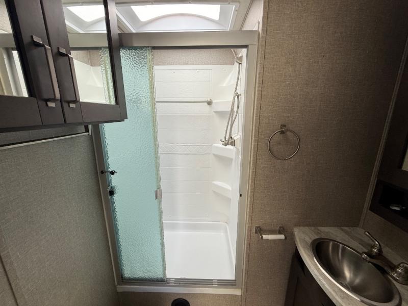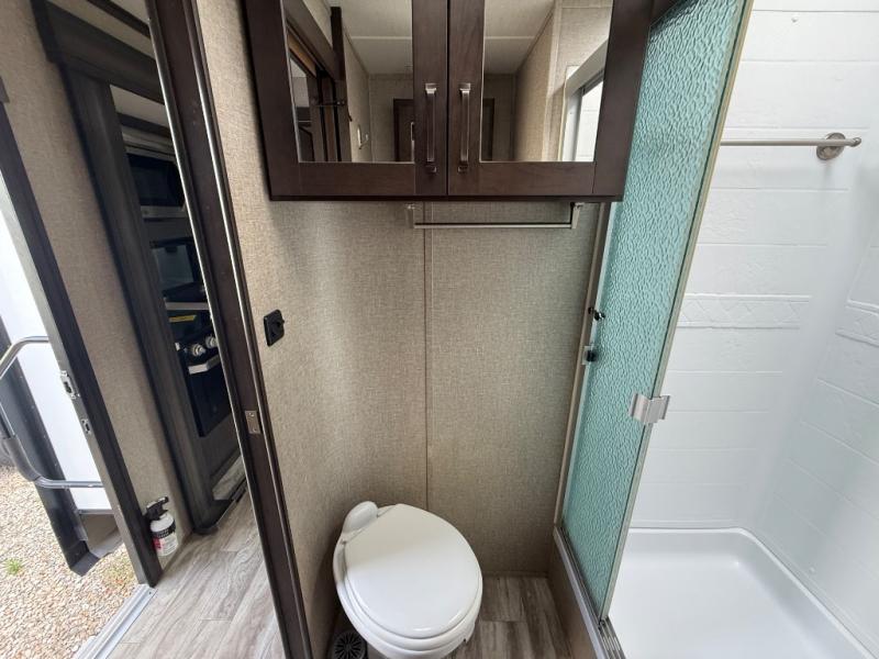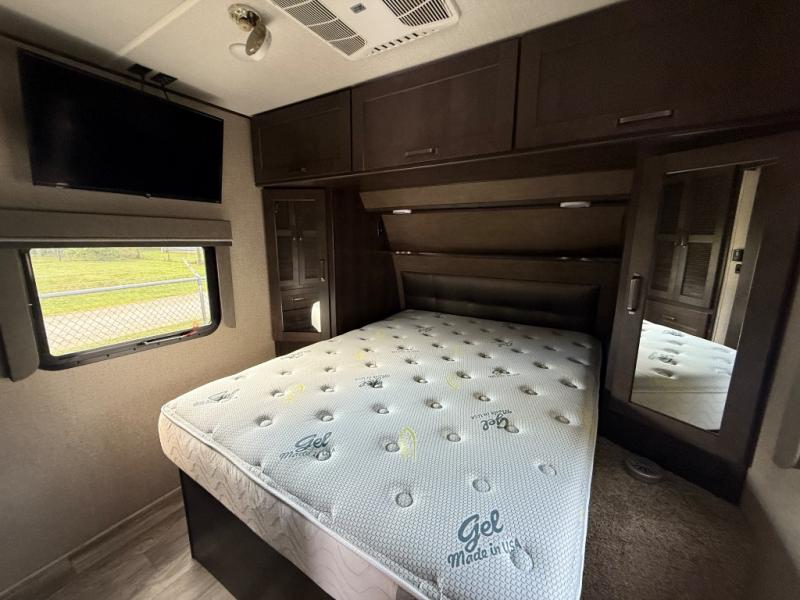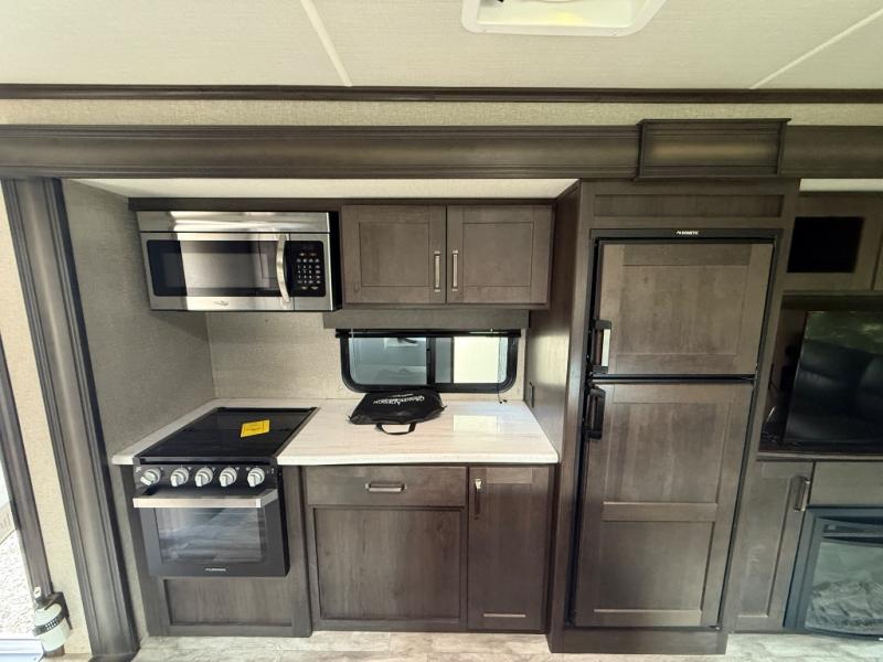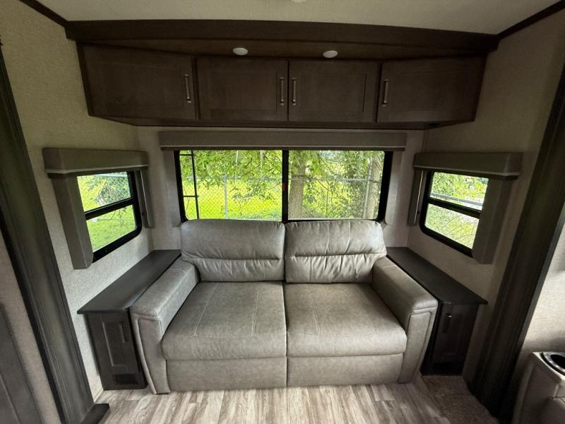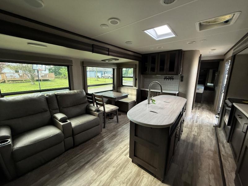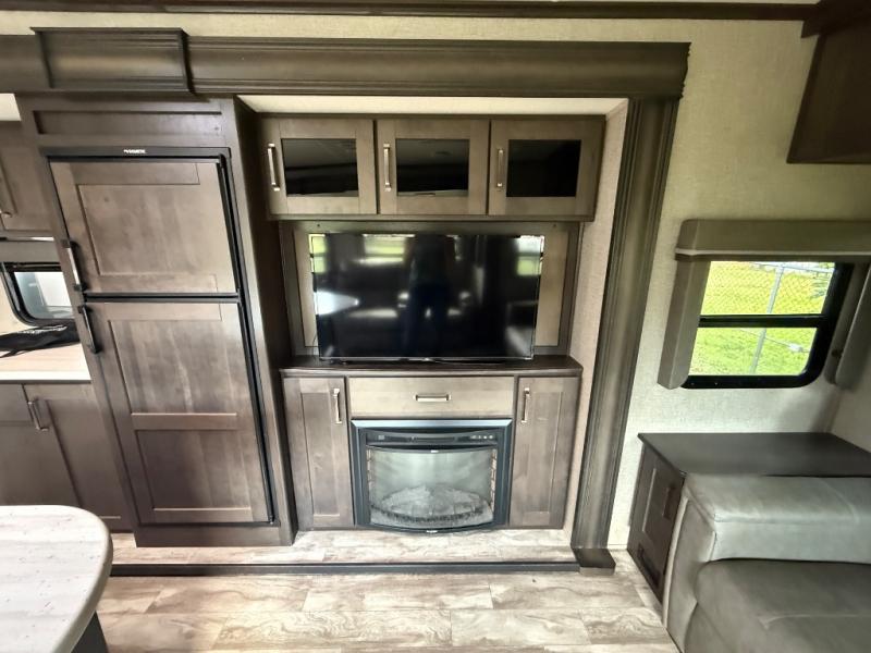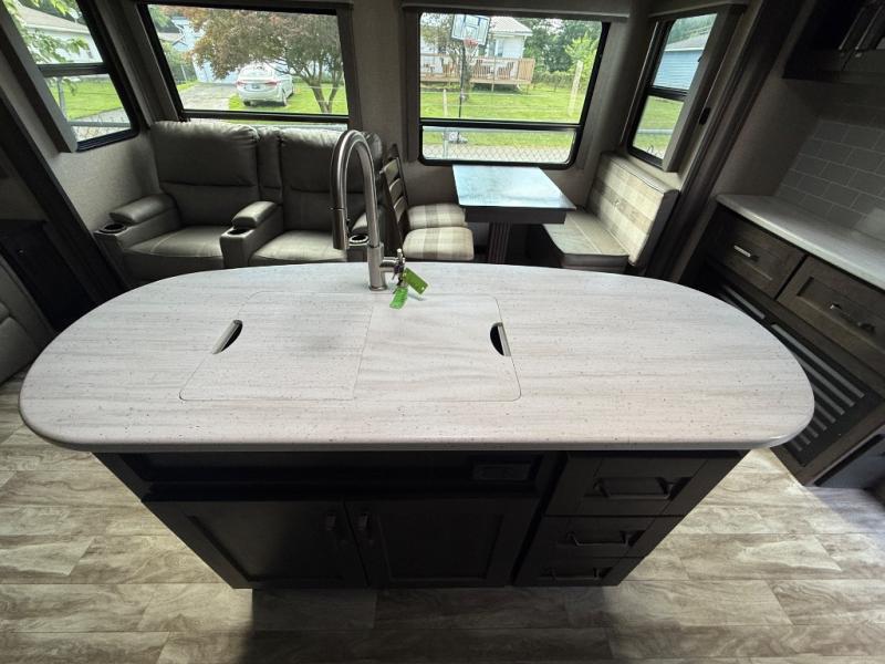 This unit is perfect for any couple seeking an outdoor adventure that is also looking to enjoy a bit of at-home comforts as well. Just imagine cooking in a gourmet kitchen with a center island and large sink, plus watching a 40" TV with a fireplace below. You can look out the windows and enjoy your RVing lifestyle while cooking or relax on the tri-fold sofa or the theater seating. You will love the front master bedroom which includes a queen bed and plenty of storage, plus an area to add the optional washer/dryer. There is more storage throughout for all your traveling items, as well as an exterior unobstructed pass-through compartment that allows you to stow away your larger items. Don't forget about the outside kitchen and shower, the real reason you chose this model!