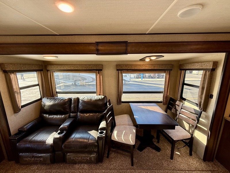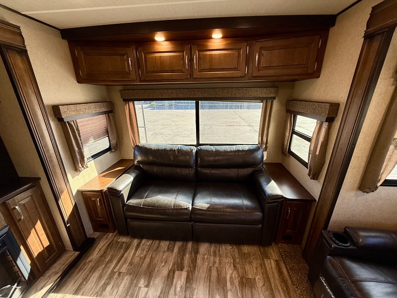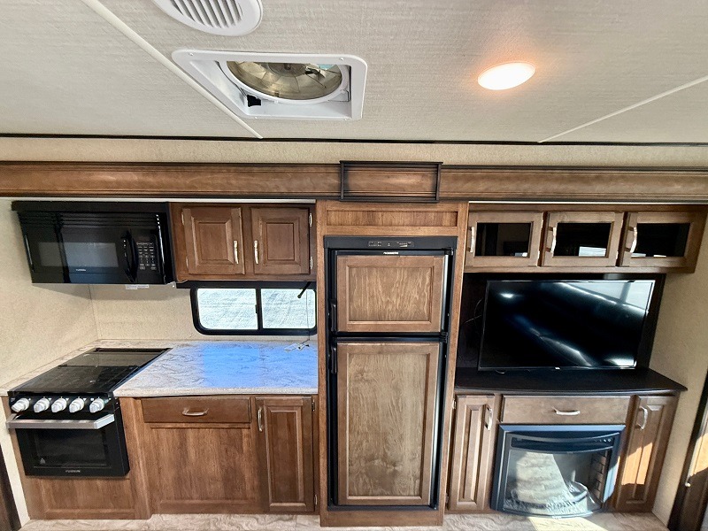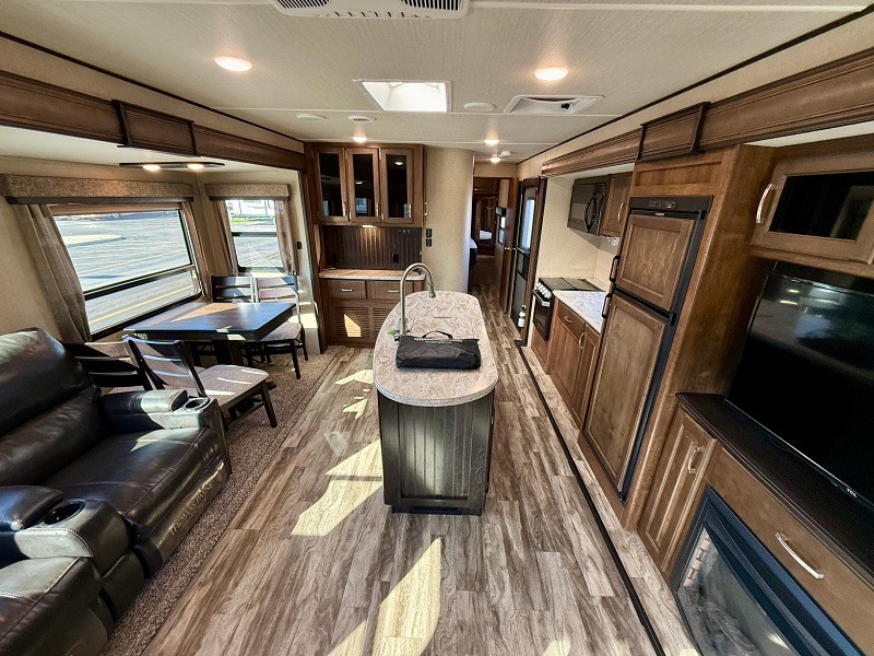 This unit is perfect for any couple seeking an outdoor adventure that is also looking to enjoy a bit of at-home comforts as well. Just imagine cooking in a gourmet kitchen with a center island and large sink, plus watching a 40" TV with a fireplace below. You can look out the windows and enjoy your RVing lifestyle while cooking or relax on the tri-fold sofa or the theater seating. You will love the front master bedroom which includes a queen bed and plenty of storage, plus an area to add the optional washer/dryer. There is more storage throughout for all your traveling items, as well as an exterior unobstructed pass-through compartment that allows you to stow away your larger items. Don't forget about the outside kitchen and shower, the real reason you chose this model!