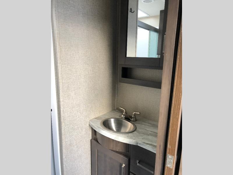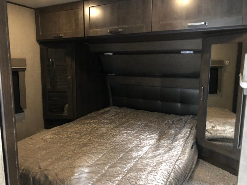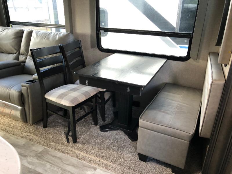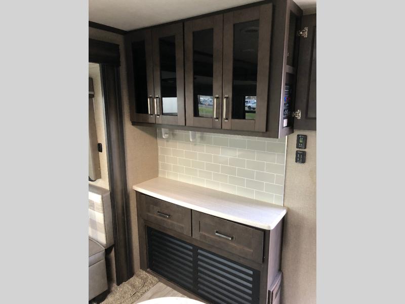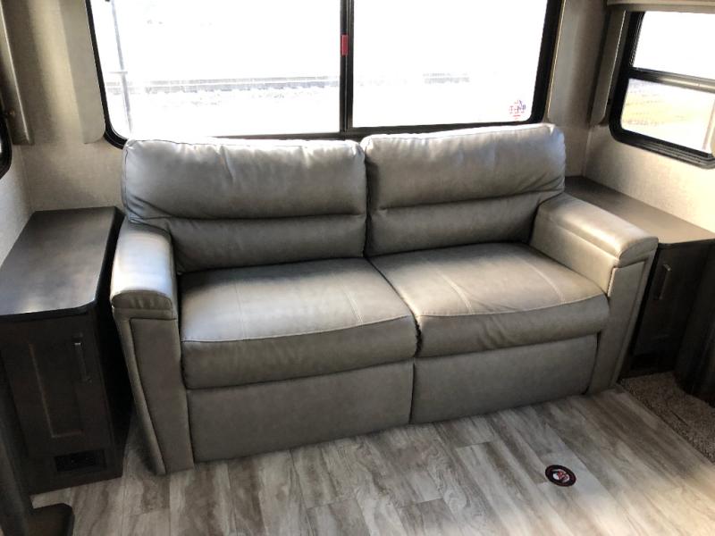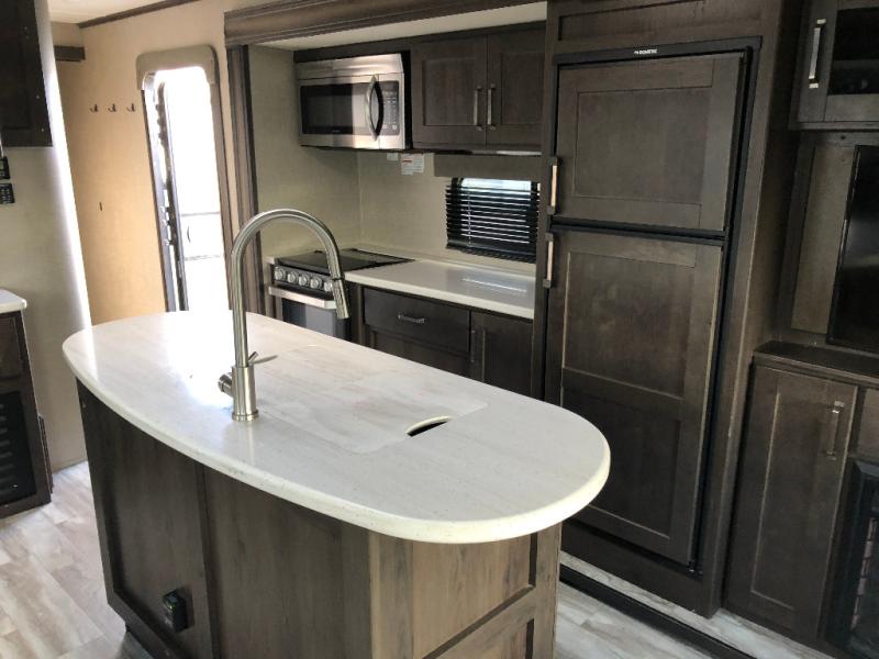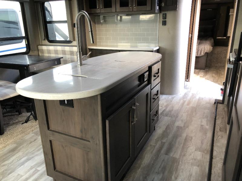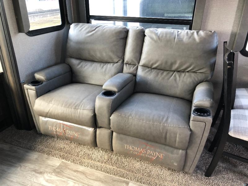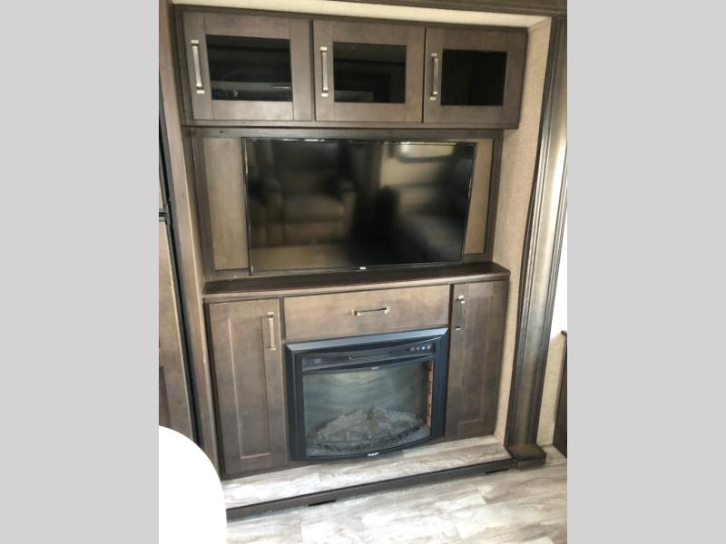 This unit is perfect for any couple seeking an outdoor adventure that is also looking to enjoy a bit of at-home comforts as well. Just imagine cooking in a gourmet kitchen with a center island and large sink, plus watching a 40" TV with a fireplace below. You can look out the windows and enjoy your RVing lifestyle while cooking or relax on the tri-fold sofa or the theater seating. You will love the front master bedroom which includes a queen bed and plenty of storage, plus an area to add the optional washer/dryer. There is more storage throughout for all your traveling items, as well as an exterior unobstructed pass-through compartment that allows you to stow away your larger items. Don't forget about the outside kitchen and shower, the real reason you chose this model!