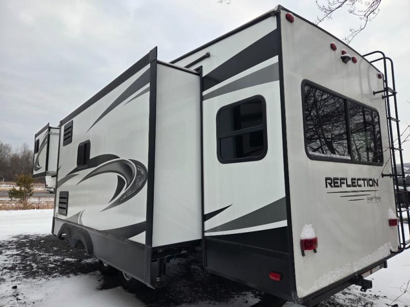 You will enjoy the comforts of home while on the road with this Reflection fifth wheel! It features a front private bedroom with a queen bed for you to enjoy a good night's rest, under the bed storage, and closets/drawers for you to keep all of your clothes neat and tidy. After an adventurous day, you can head to the rear living area where you will have your choice to relax on either the tri-fold sofa or the theater seats while you watch your favorite movie on the 40" TV or enjoy a cozy fire in the fireplace. The kitchen has everything you will need to whip up your best meals including a kitchen island with a large sink to make your clean up a breeze. Don't forget about storing your camp chairs and golf clubs in the exterior unobstructed pass-through compartment too. This model has many more standard features to enjoy and options to choose from, come see today!