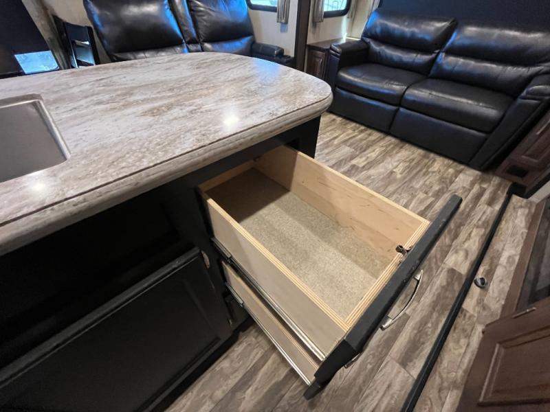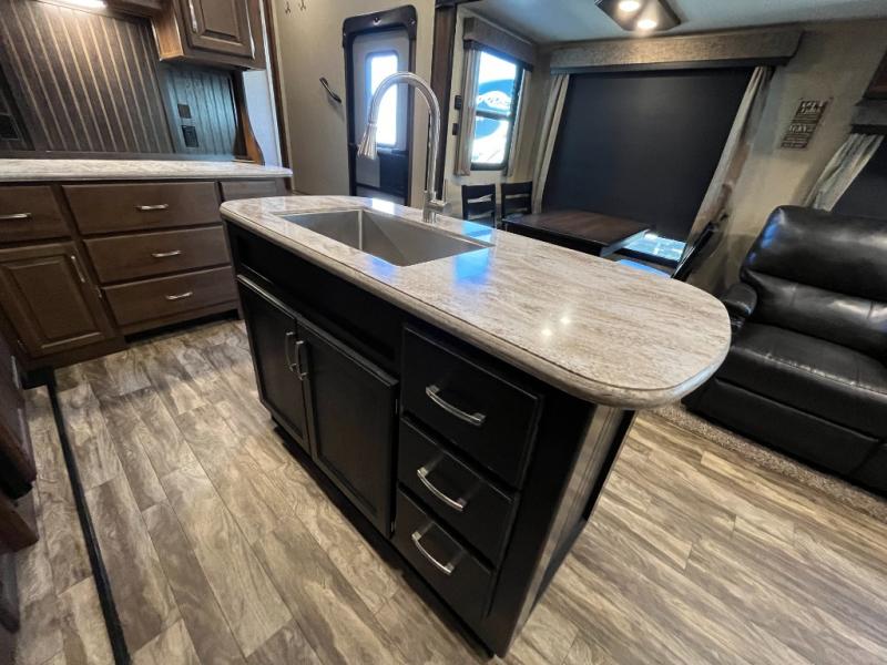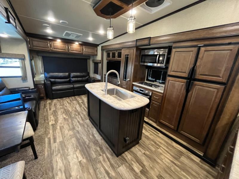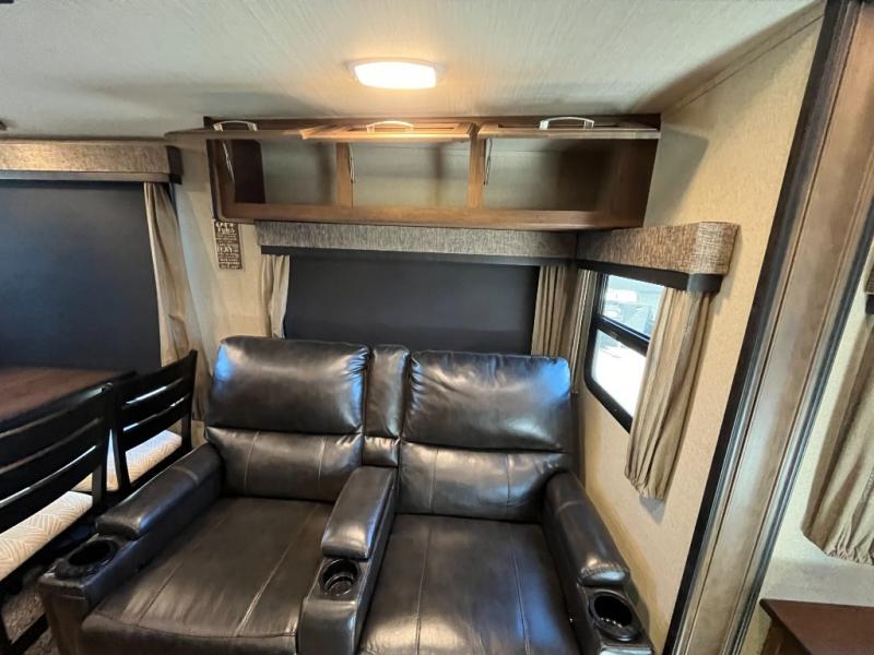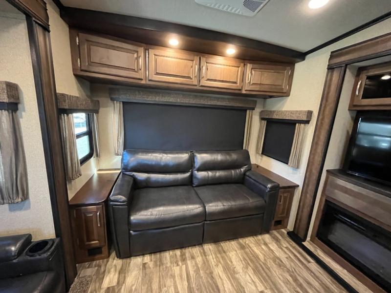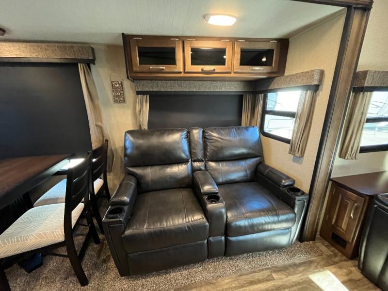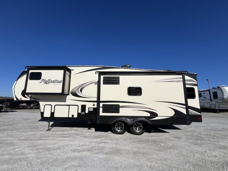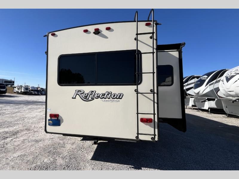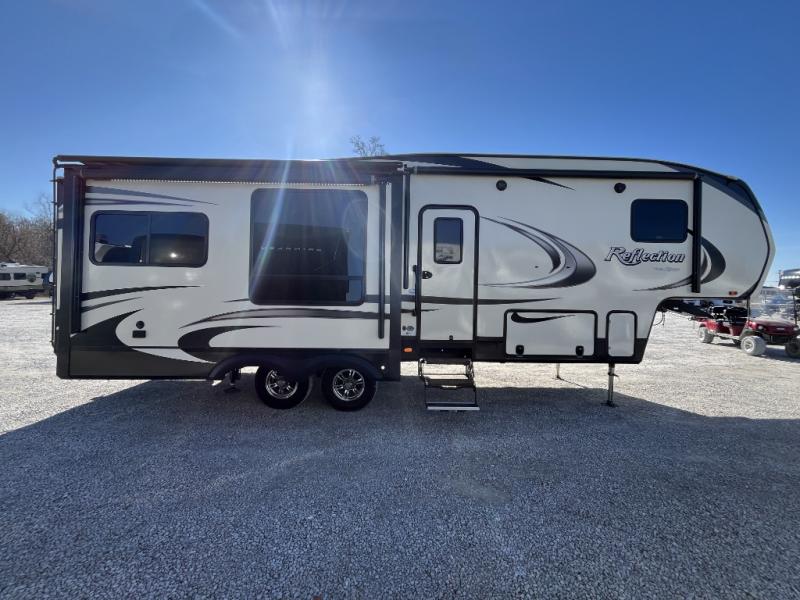 You will enjoy the comforts of home while on the road with this Reflection fifth wheel! It features a front private bedroom with a queen bed for you to enjoy a good night's rest, under the bed storage, and closets/drawers for you to keep all of your clothes neat and tidy. After an adventurous day, you can head to the rear living area where you will have your choice to relax on either the tri-fold sofa or the theater seats while you watch your favorite movie on the 40" TV or enjoy a cozy fire in the fireplace. The kitchen has everything you will need to whip up your best meals including a kitchen island with a large sink to make your clean up a breeze. Don't forget about storing your camp chairs and golf clubs in the exterior unobstructed pass-through compartment too. This model has many more standard features to enjoy and options to choose from, come see today!