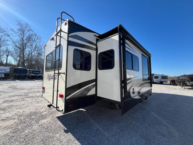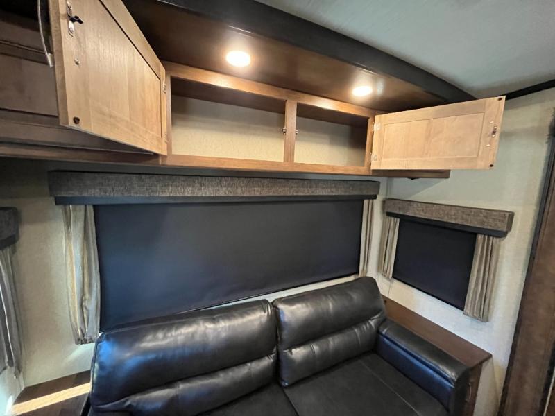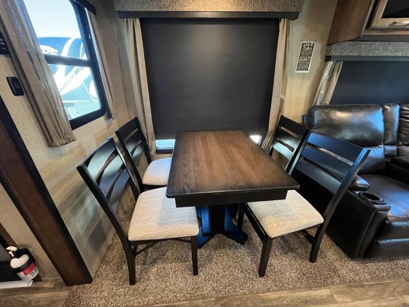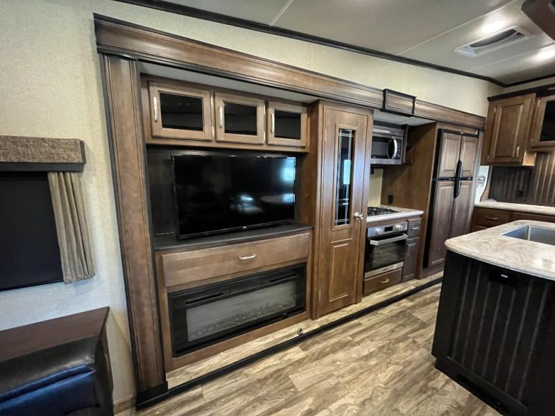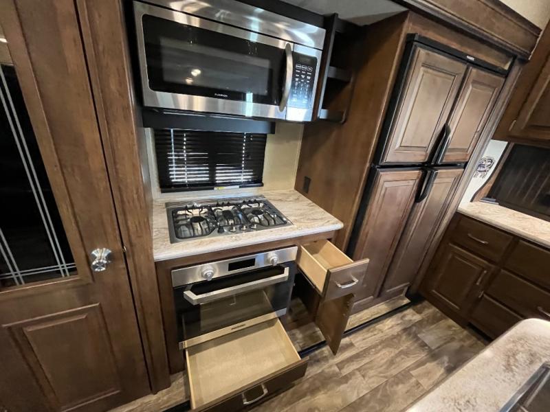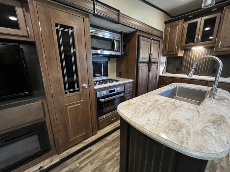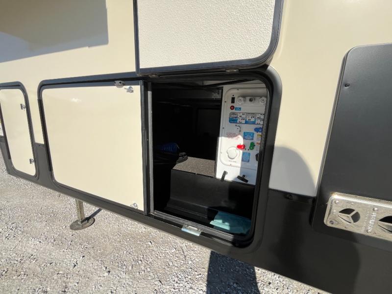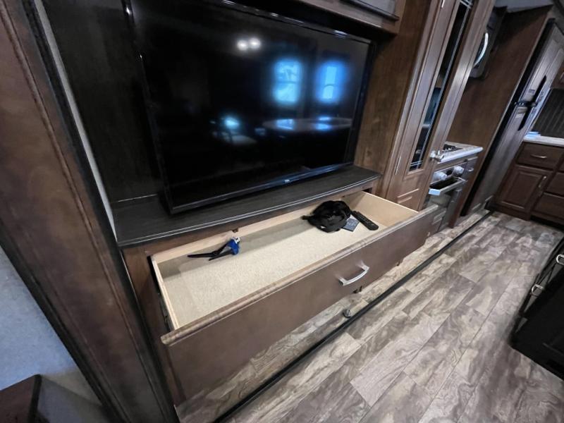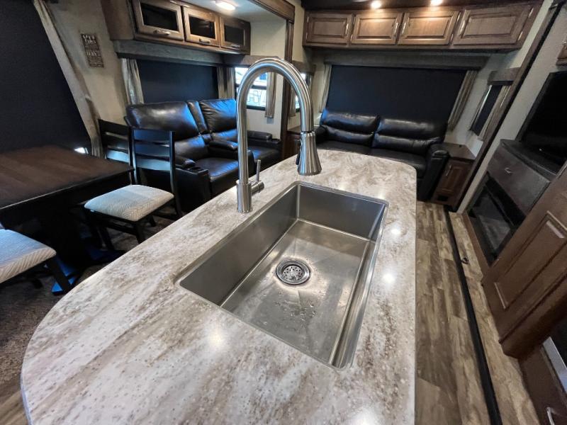 You will enjoy the comforts of home while on the road with this Reflection fifth wheel! It features a front private bedroom with a queen bed for you to enjoy a good night's rest, under the bed storage, and closets/drawers for you to keep all of your clothes neat and tidy. After an adventurous day, you can head to the rear living area where you will have your choice to relax on either the tri-fold sofa or the theater seats while you watch your favorite movie on the 40" TV or enjoy a cozy fire in the fireplace. The kitchen has everything you will need to whip up your best meals including a kitchen island with a large sink to make your clean up a breeze. Don't forget about storing your camp chairs and golf clubs in the exterior unobstructed pass-through compartment too. This model has many more standard features to enjoy and options to choose from, come see today!