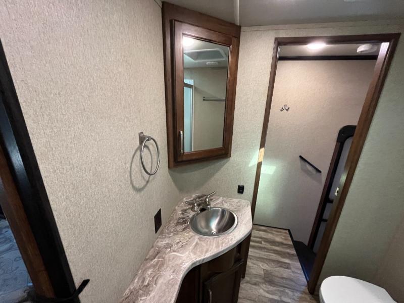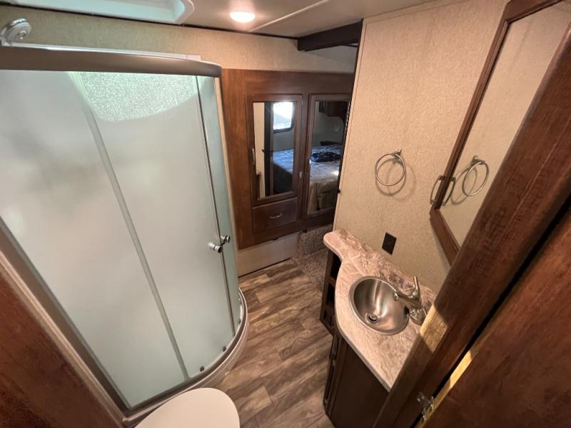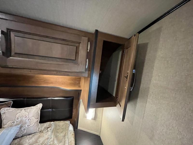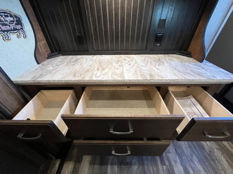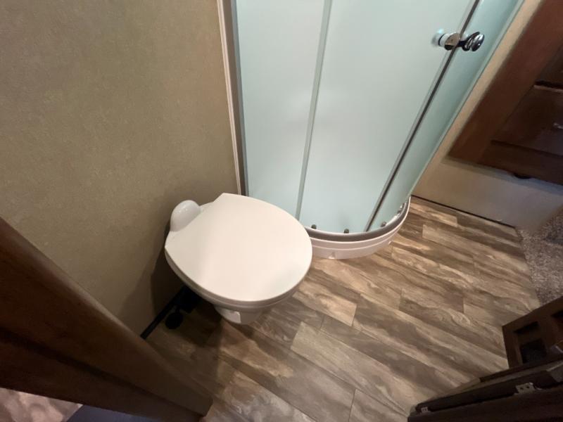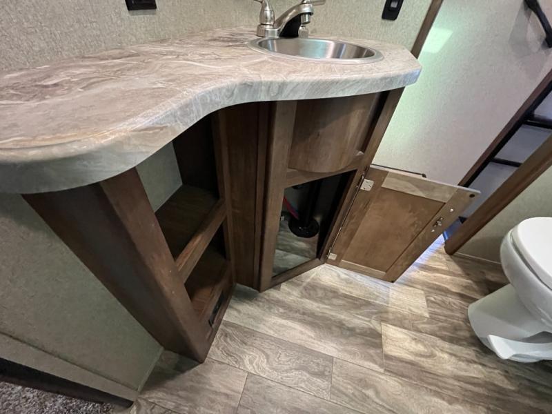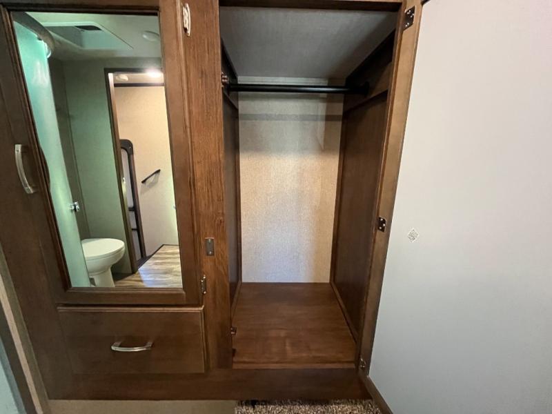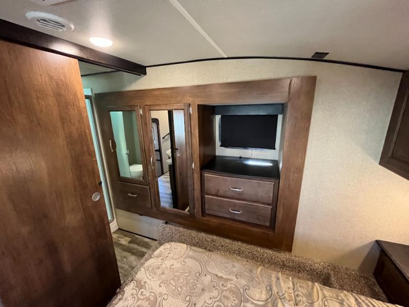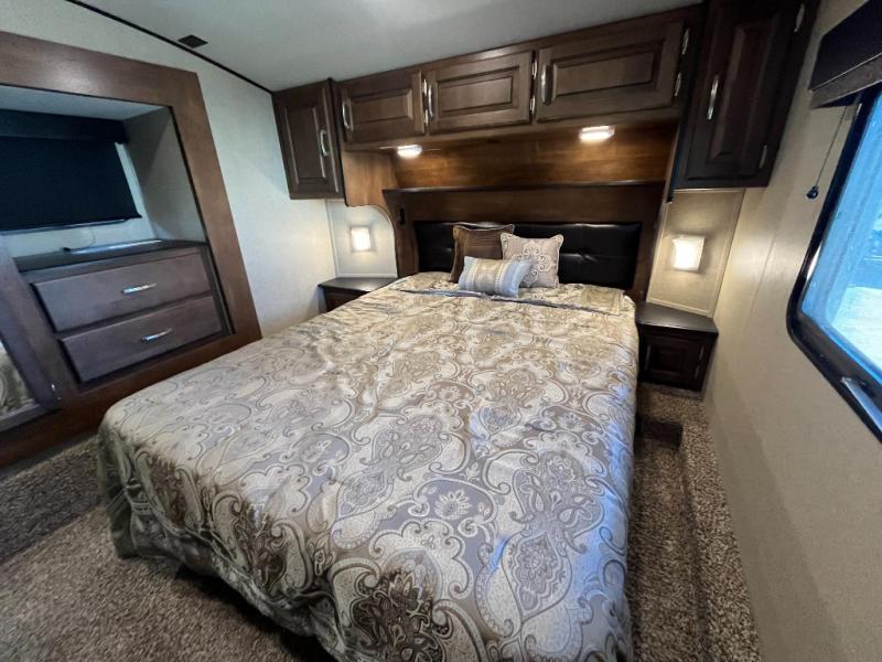 You will enjoy the comforts of home while on the road with this Reflection fifth wheel! It features a front private bedroom with a queen bed for you to enjoy a good night's rest, under the bed storage, and closets/drawers for you to keep all of your clothes neat and tidy. After an adventurous day, you can head to the rear living area where you will have your choice to relax on either the tri-fold sofa or the theater seats while you watch your favorite movie on the 40" TV or enjoy a cozy fire in the fireplace. The kitchen has everything you will need to whip up your best meals including a kitchen island with a large sink to make your clean up a breeze. Don't forget about storing your camp chairs and golf clubs in the exterior unobstructed pass-through compartment too. This model has many more standard features to enjoy and options to choose from, come see today!