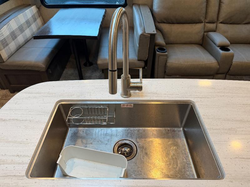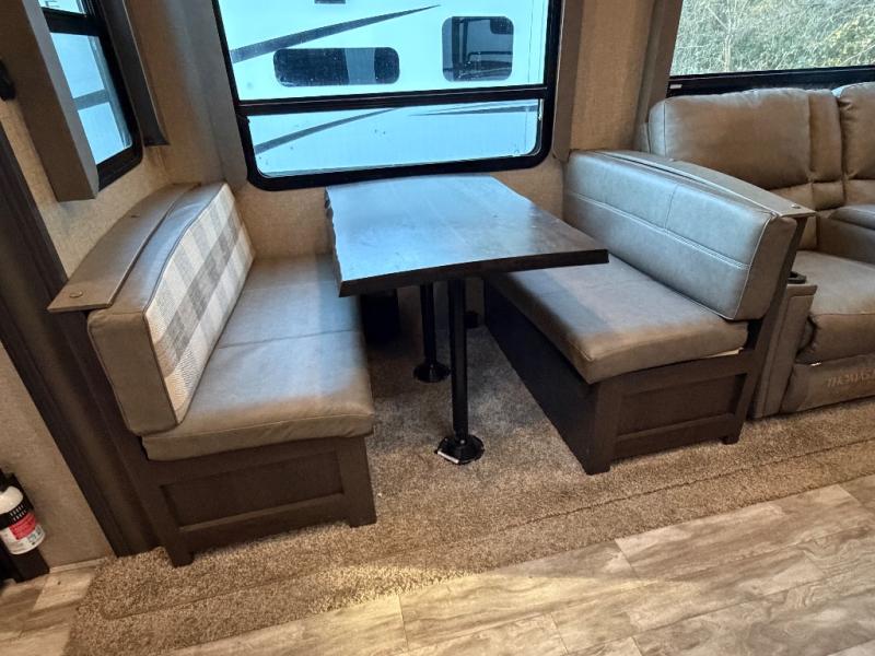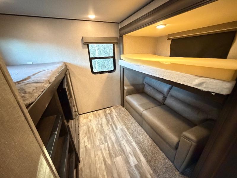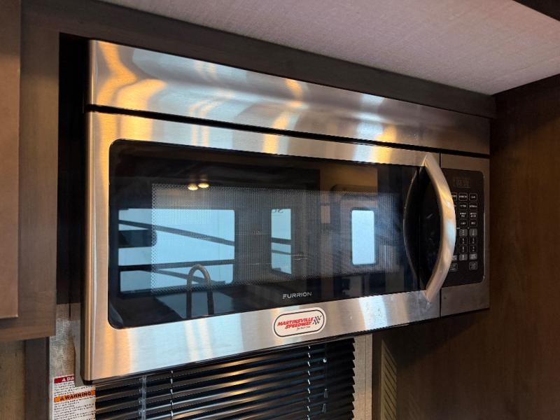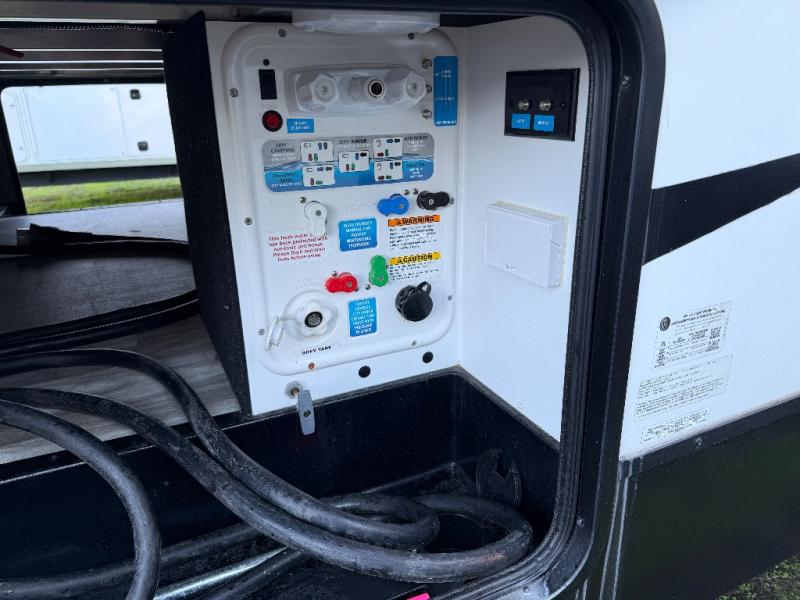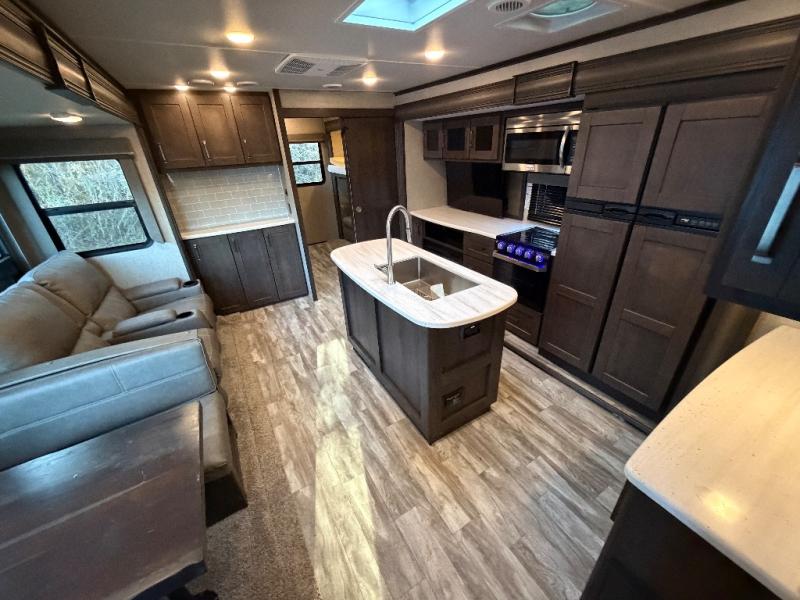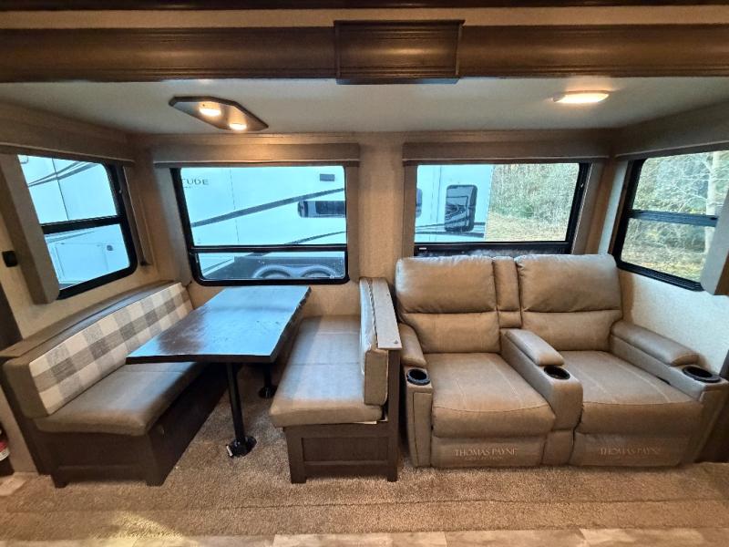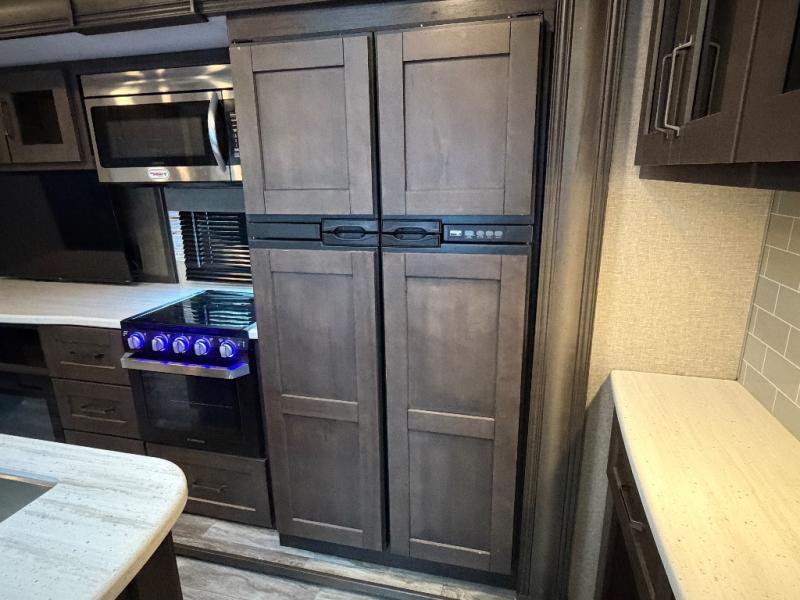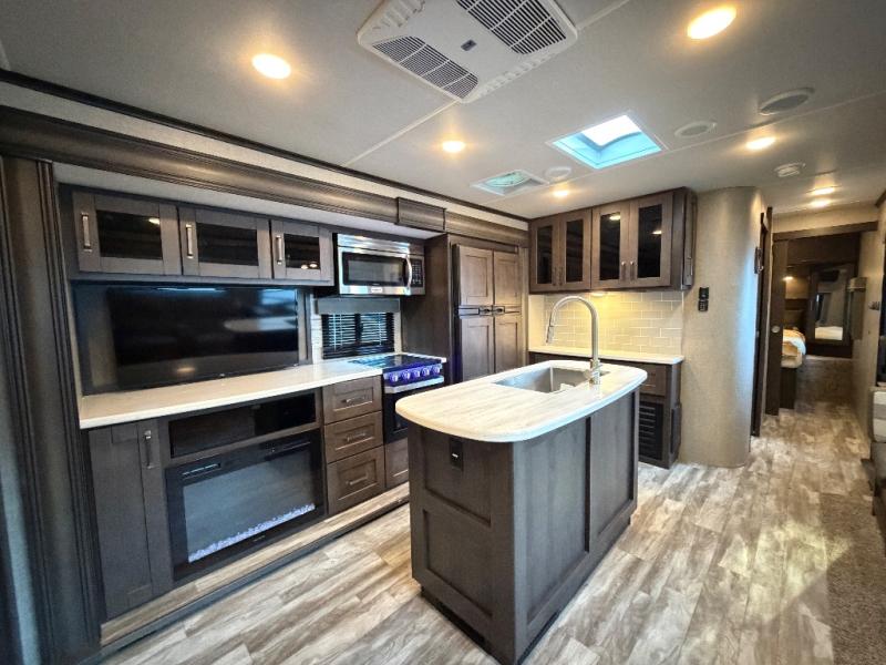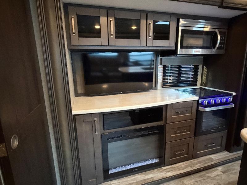Imagine your family playing games at the booth dinette while you are relaxing on one of the theater seats and watching the big game on the 40" TV, everyone will appreciate the warmth of the fireplace below as well. The kiddos will love having their own rear bunkhouse while they sit on the tri-fold sofa, and lay on one of the bunk beds. The cook can choose to use the inside kitchen appliances or the enjoy some fresh air while using the outside kitchen. There is plenty of storage throughout the inside as well as the exterior unobstructed pass-through compartment. It's time to stop imaging and start living your dreams!