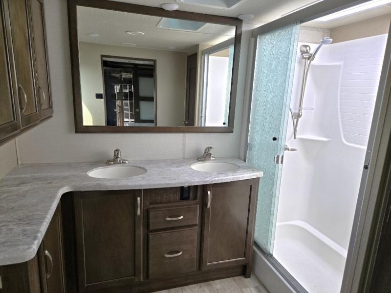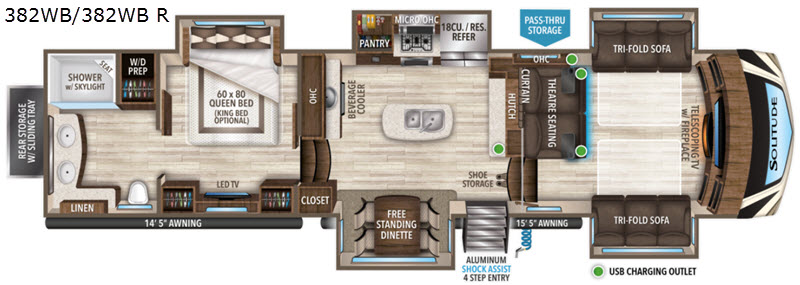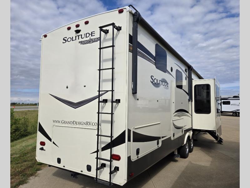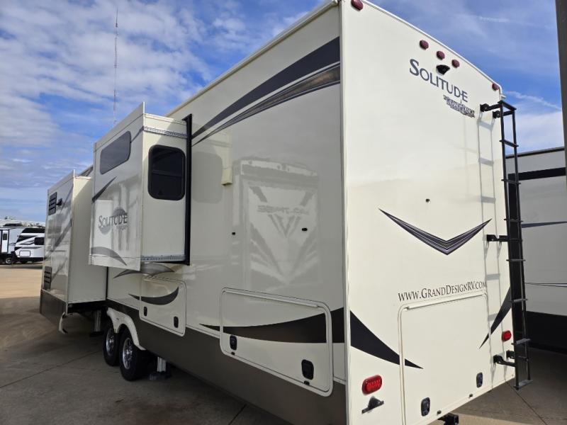 With each Solitude fifth wheel by Grand Design, you will receive refined residential finishes and affordable luxury for your extended stays or weekend getaways. From the solid foundation that rests upon an exclusive superchassis and the maximum insulation to the taller ceilings, taller and deeper cabinets, and the power reclining theatre seating with removable swivel tables and heat and massage, you will be impressed! The pet dish drawer, the Stealth AC system, and the Weather-Tek package that allows you to travel during any season will also give you many more reasons to love everything about your Solitude. It's time to redefine luxury living wherever you decide to land.