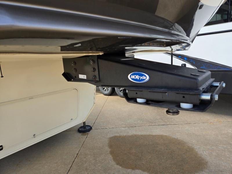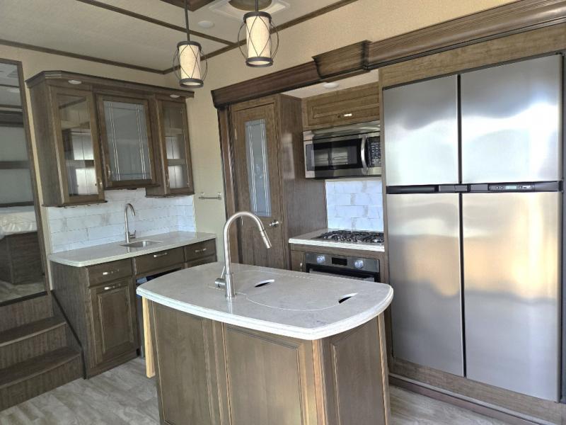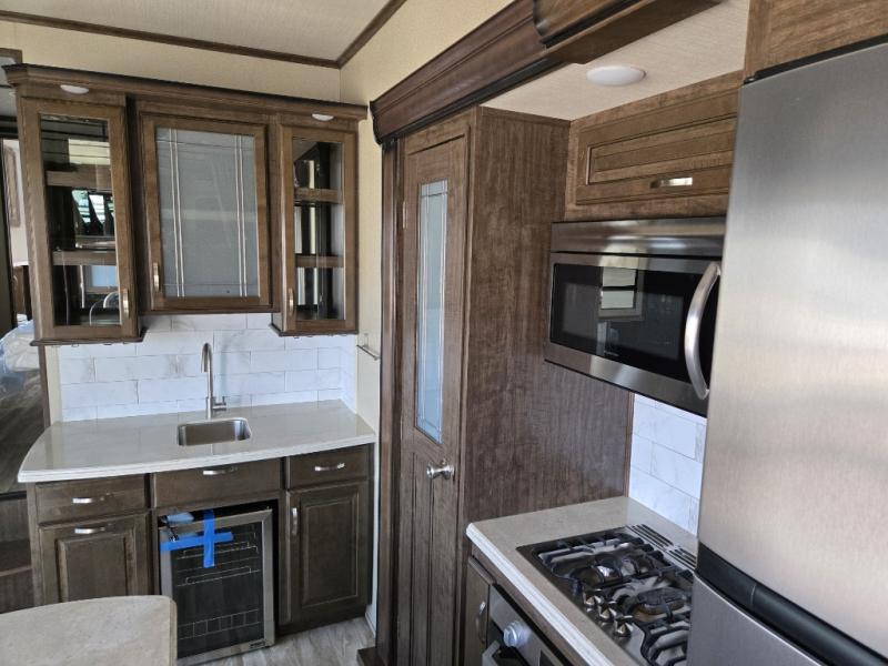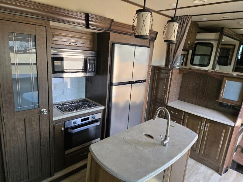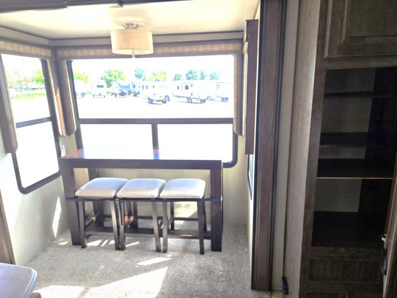 If you like to carry extra outdoor gear such as a small boat, large ice chests, fishing poles, or even a picnic table canopy, you will surely enjoy the exterior rear storage with its sliding tray on this Solitude fifth wheel. This unique feature allows you to easily get to your stuff and carry everything you need. Now imagine having a separate kitchen to make your famous meals which also includes a hutch, a beverage cooler, and a dining area within a slide. Now picture your family laughing and talking while in the separate living room up front that has a full-wall entertainment center and a fireplace. Stop thinking about it and start living the dream!