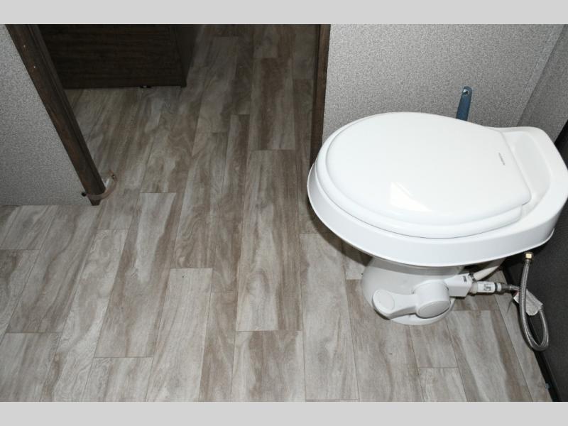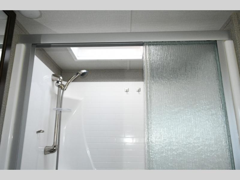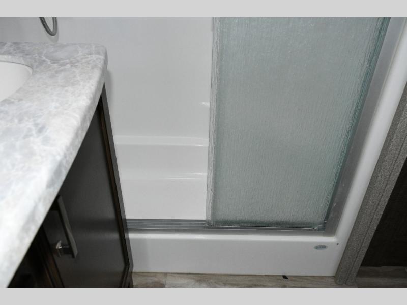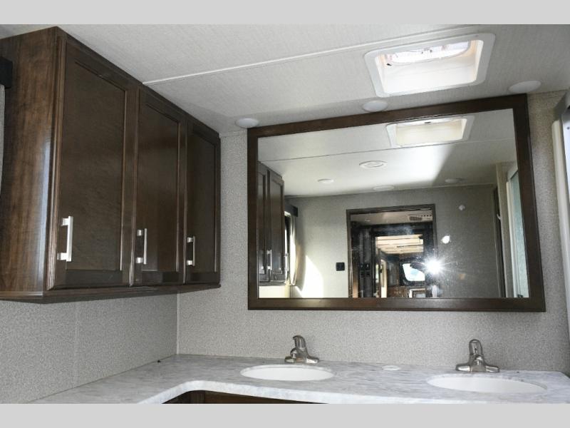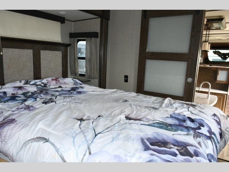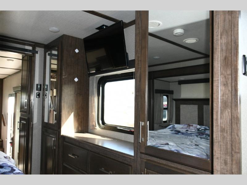 Retreat to your tranquil haven featuring a queen bed (with an optional king upgrade), flip-top dresser, and large wardrobe. There’s even washer/dryer prep for the ultimate in on-the-road convenience. -