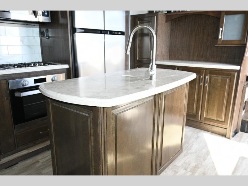 The kitchen island offers extra prep space, while the four-door 18 cu. ft. stainless steel refrigerator keeps everything fresh for long trips.