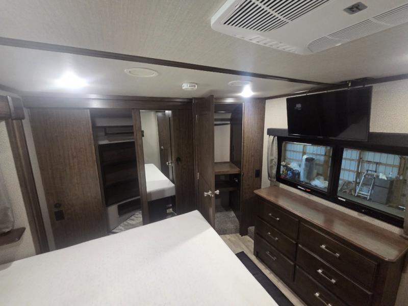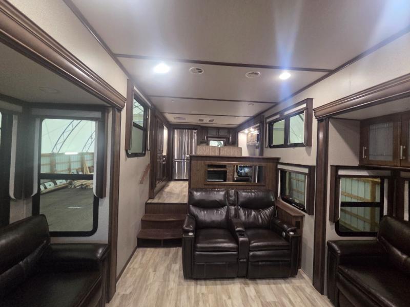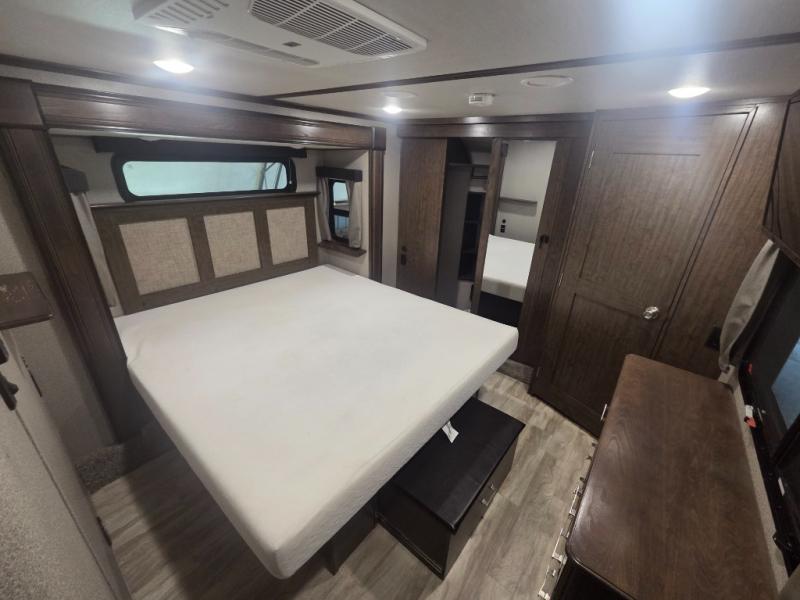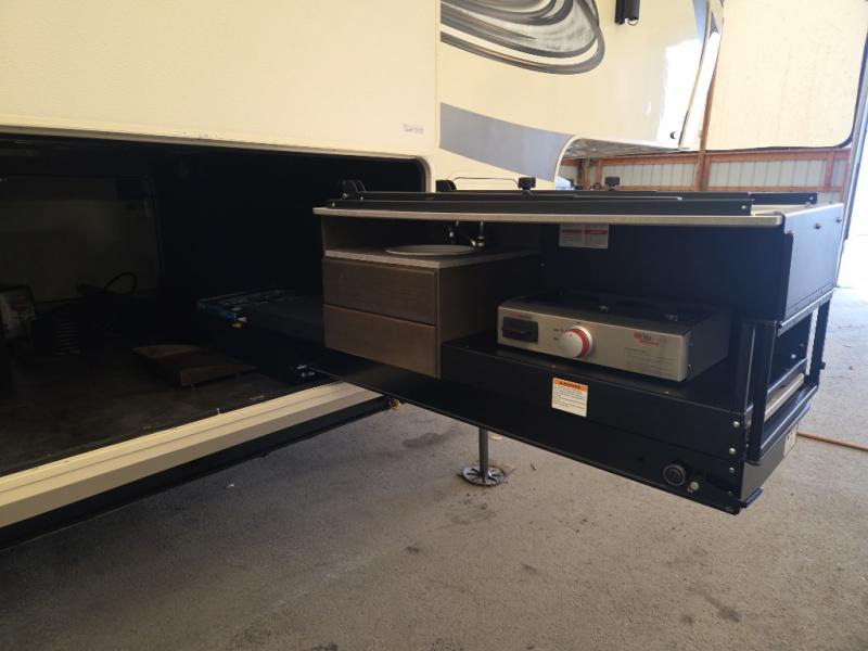 You will love your extended stays while traveling in this Solitude fifth wheel which features five slides! A rear raised kitchen provides the family chef a great space with opposing slides as well as an island for food prep. A raised bar top with two stools overlooks the center living space that also features dual opposing slides, two tri-fold sofas, and theatre seating. Dual sinks in the full bathroom means getting ready is easy for two, and the shower with skylight offers more head room that you are also sure to appreciate. As you wind down your day, the front master bedroom will be a welcomed retreat thanks to a queen bed slide, and the walk-in closet provides ample space for all of your things. For added storage, a large exterior sliding tray offers more room for luggage and larger items. There is also a mid-coach pass-through storage compartment for other camping gear.